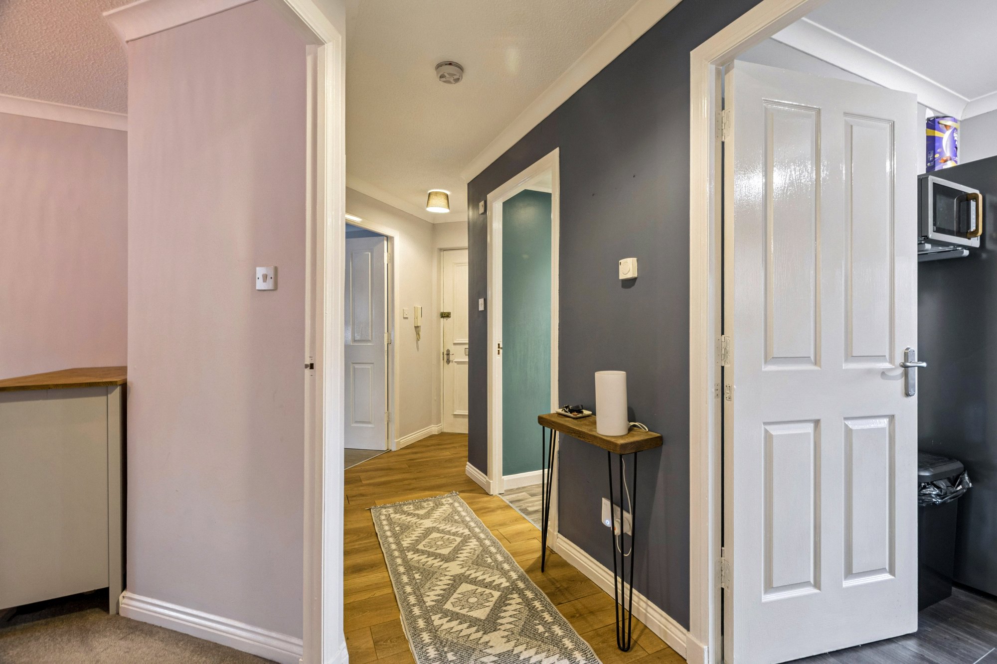 The property has been modernised and improved during it’s current ownership and is accessed through a security entry to communal close. Internally the property comprises of welcoming, L-shaped reception hall with laminate flooring and three good storage cupboards; there is a bright and spacious angled living room with dual aspects west and a bespoke media wall with space for large TV and with feature fireplace, re-fitted modern kitchen with a range of base and wall mounted units and integrated oven hob and hood and space for dining; there are two double bedrooms, both with fitted wardrobes and one with an en suite shower room and there is a three-piece bathroom with over bath shower. The property has fresh décor, double glazing and a recently re-fitted combi boiler for gas central heating.