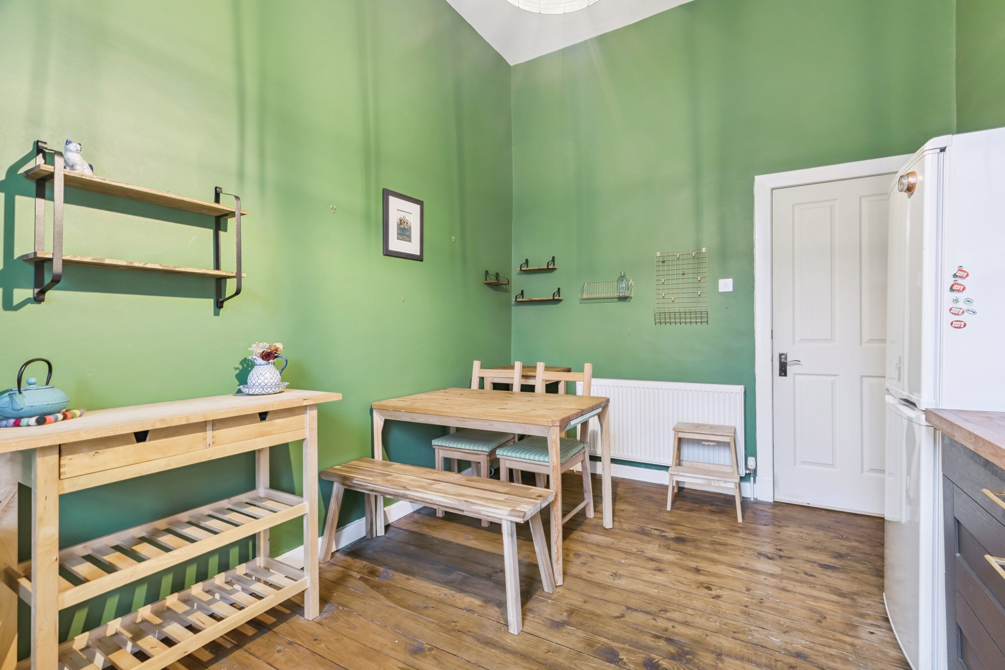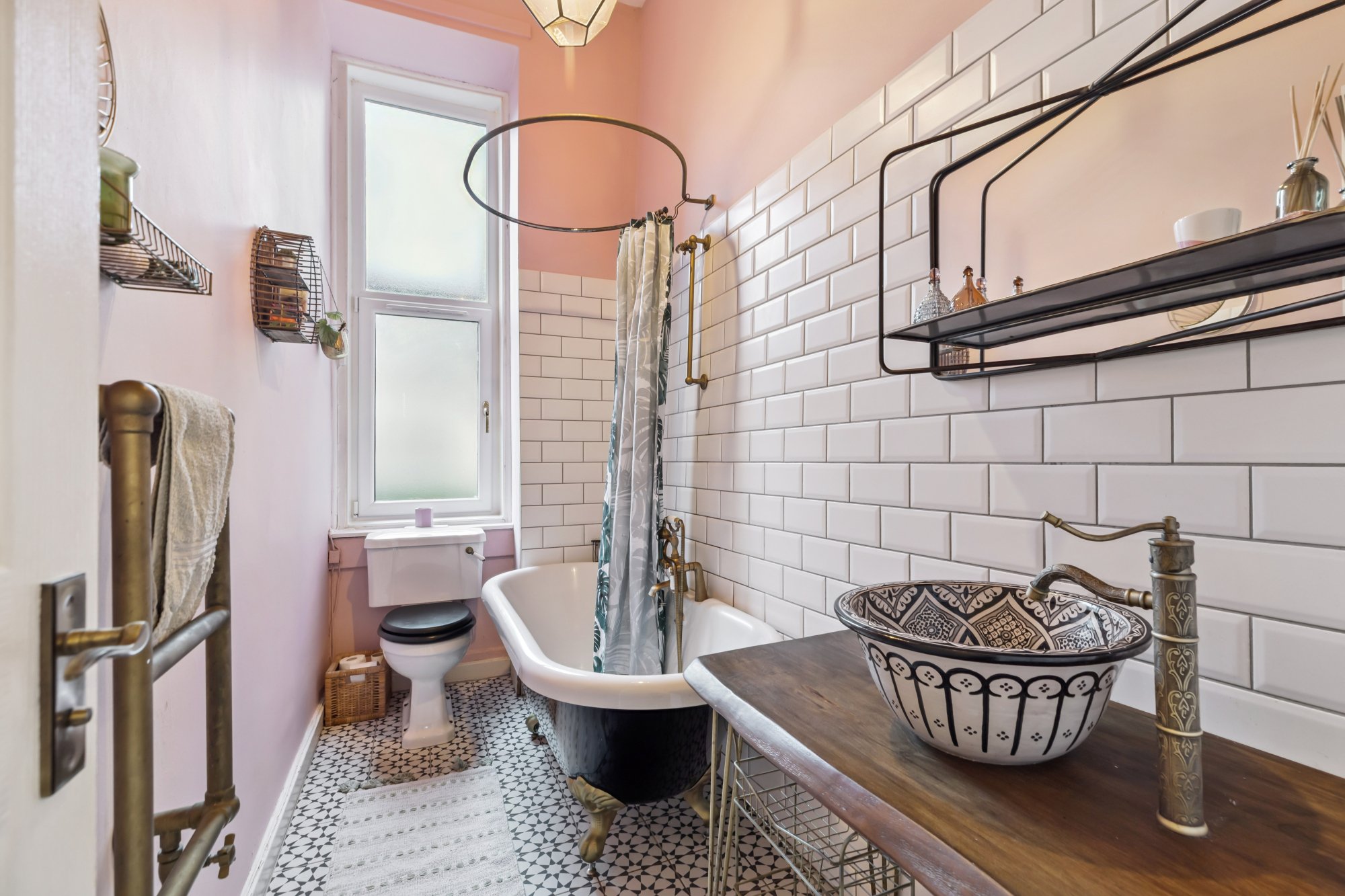 The accommodation of the flat itself comprises welcoming reception hallway with cupboard off and huge walk-in wardrobe area with separate mezzanine, sizeable lounge with refurbished floorboards, impressive dining sized kitchen with a range of base and wall mounted units, tiled splashback and ample space for dining table and chairs, expansive bay windowed bedroom one with refurbished floorboards, second double sized bedroom that could easily be utilised as a home office or study and a stunning tiled bathroom with bespoke wash hand basin, clawfoot bath and W.C.