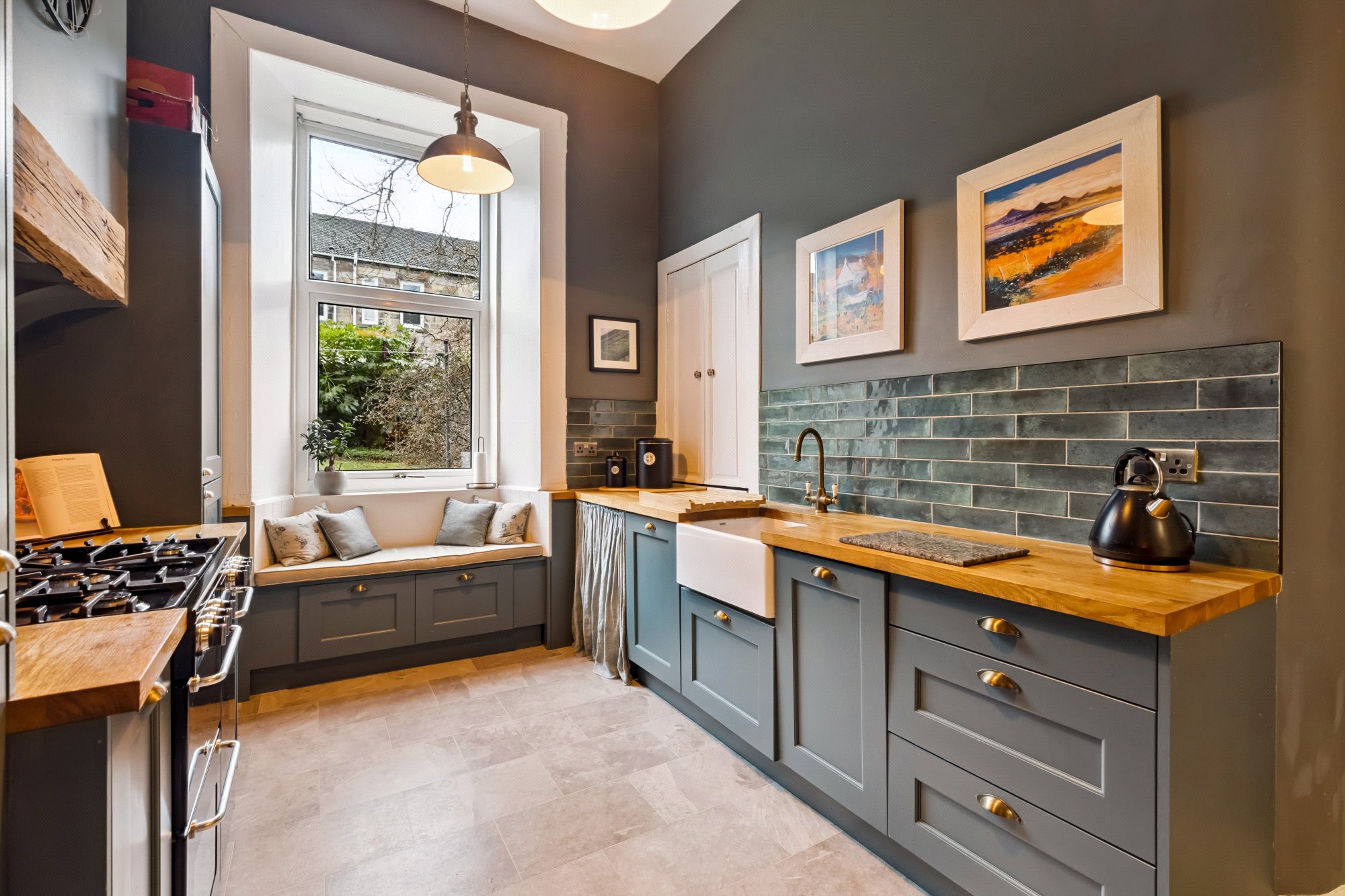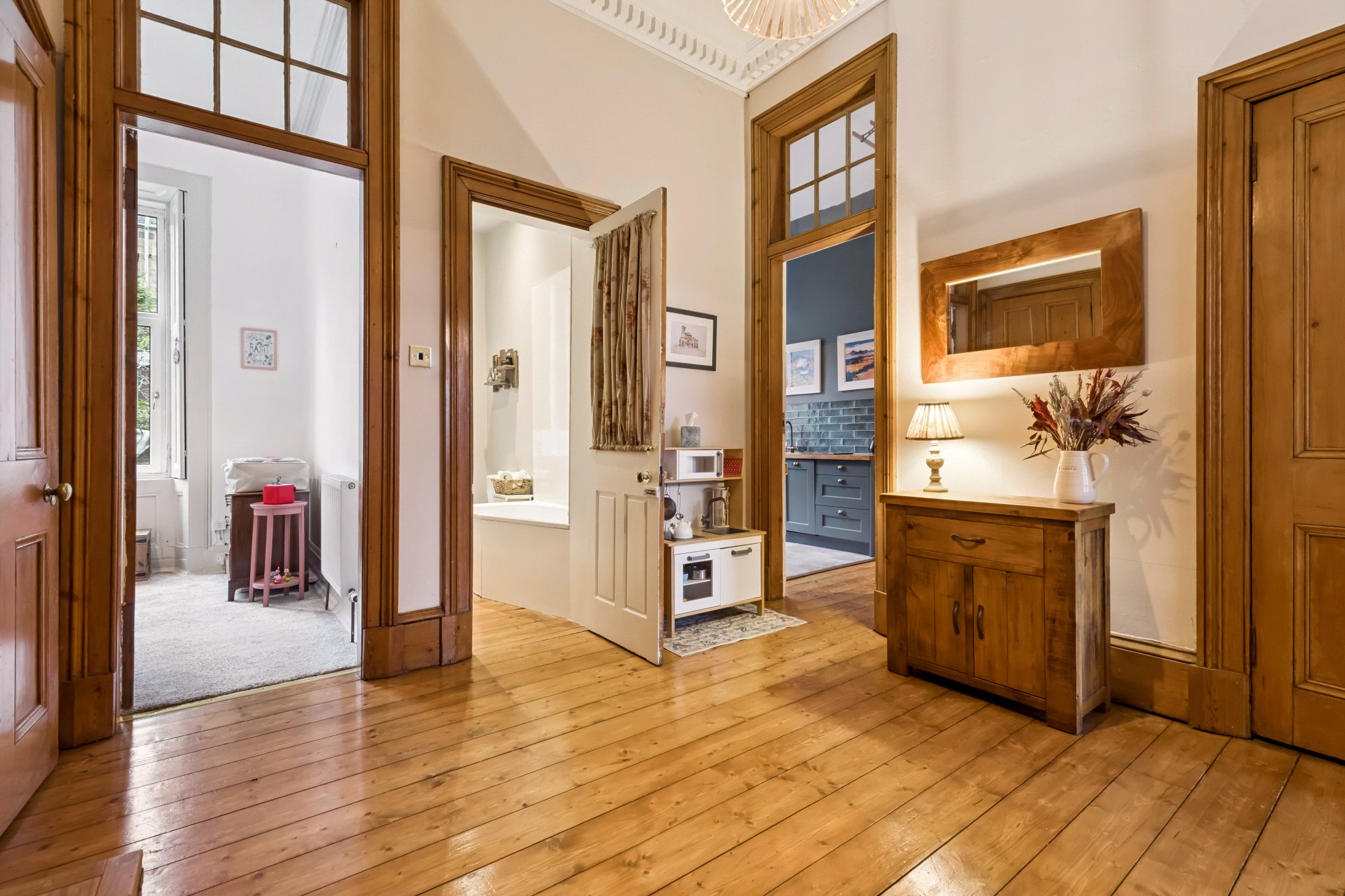 The accommodation of the flat itself comprises sizeable reception hallway with two cupboards off, gorgeous bay windowed lounge with cornicing and feature fireplace, stunning dining sized kitchen with a range of base mounted units, tiled splashback, bespoke window seat and dining recess, double sized bedroom one with cornicing and large walk-in cupboard off, second double sized bedroom that could also be utilised as a home office or study and a bathroom with white three piece suite and over bath shower.
