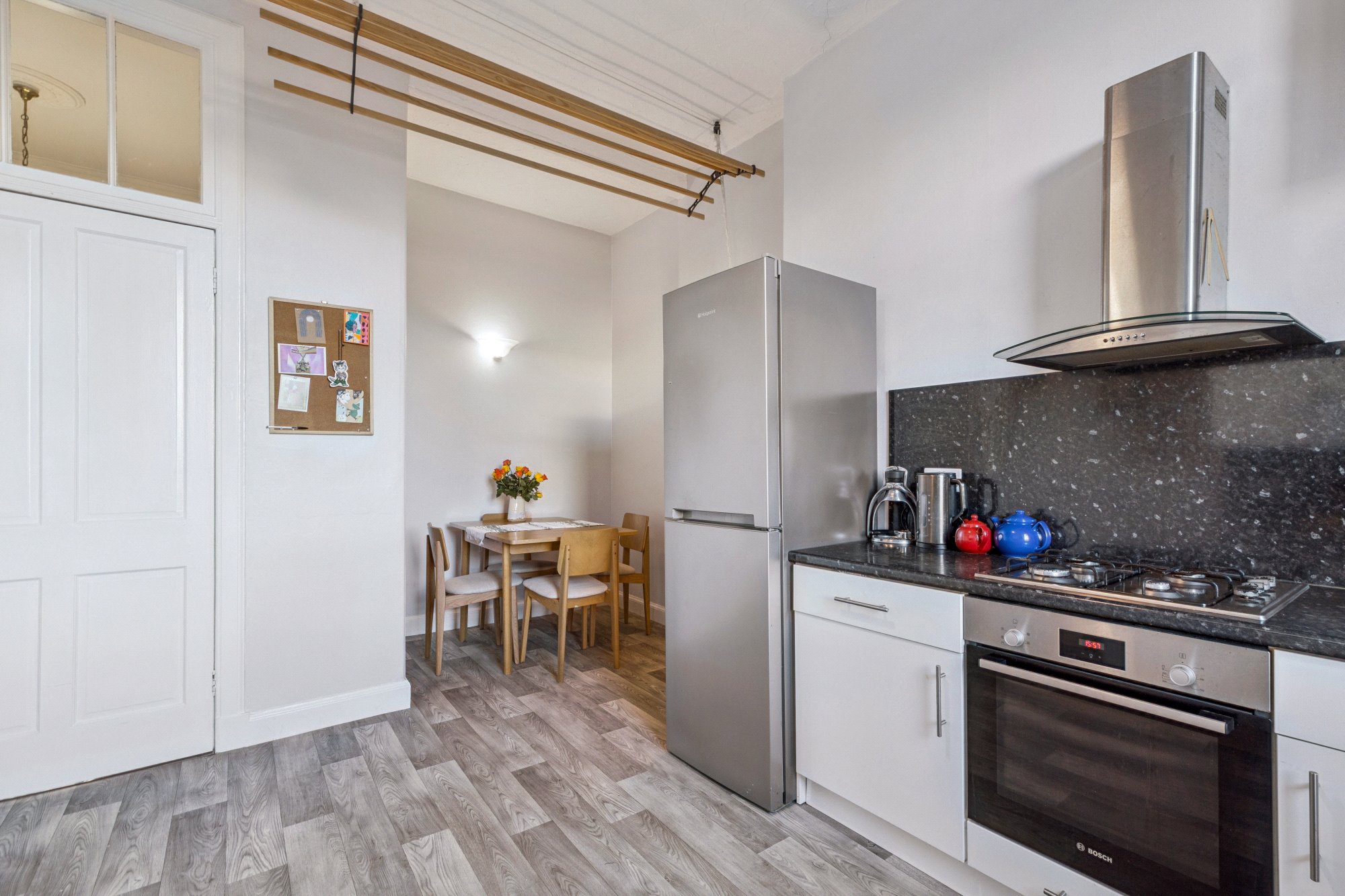 The accommodation of the flat itself comprises welcoming reception hallway with two cupboards off, beautiful bay windowed lounge with feature fireplace and cornicing, dining sized kitchen with a range of base and wall mounted units and dining recess, double sized bedroom with cornicing and open aspect out over Battlefield Gardens and tiled bathroom with three piece suite and electric shower.