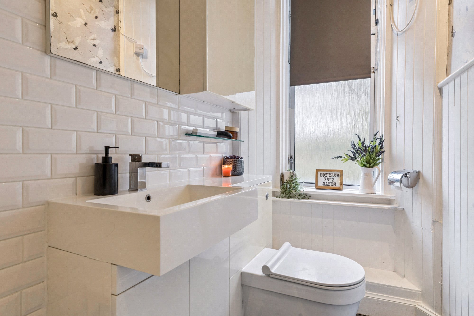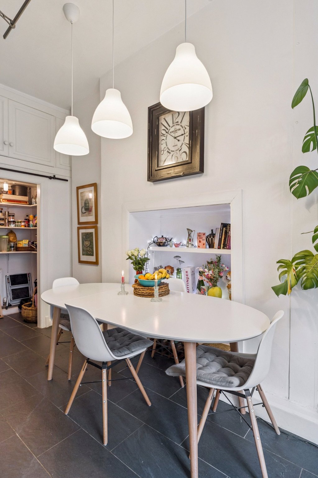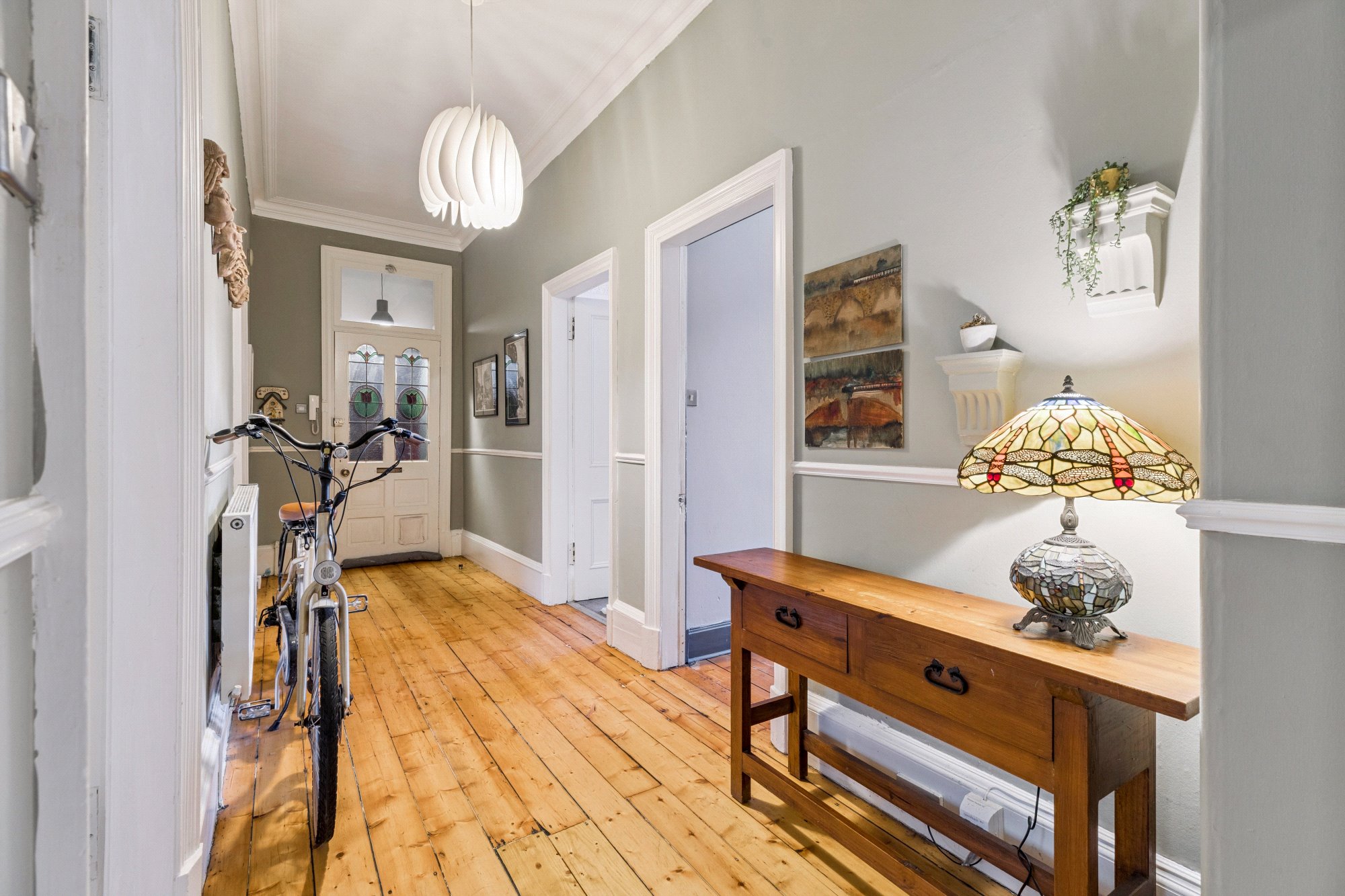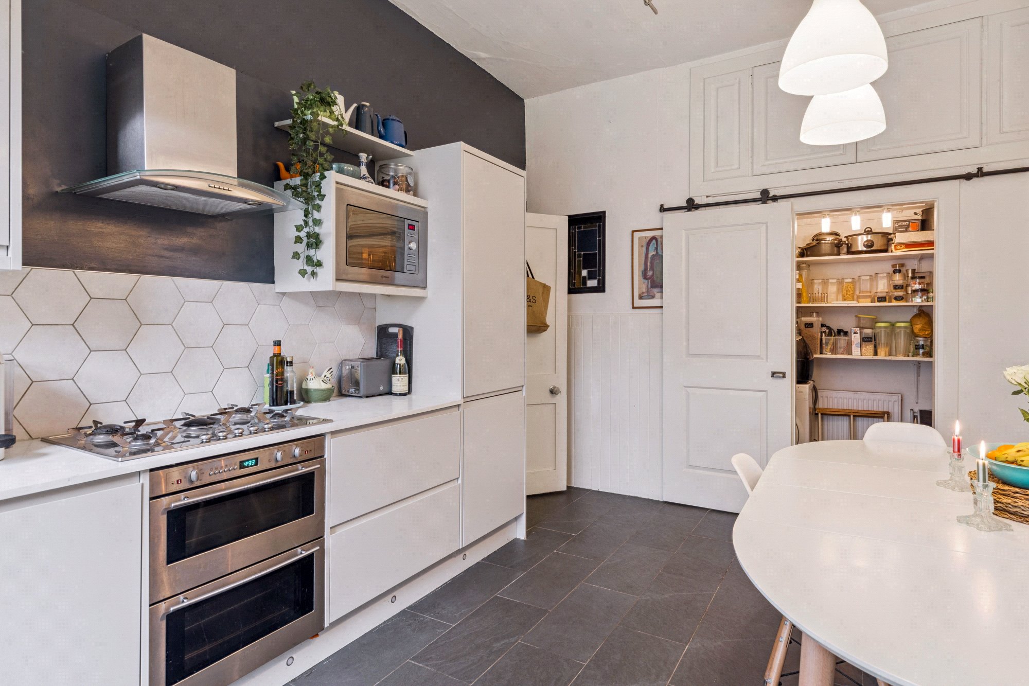 The accommodation of the flat comprises welcoming reception hallway with large cupboard off, gorgeous bay windowed lounge with cornicing, feature fireplace and refurbished floorboards, beautiful dining sized kitchen with a range of integrated appliances, base and wall mounted units, tiled splashback, ample space for dining table and chairs and large pantry off.