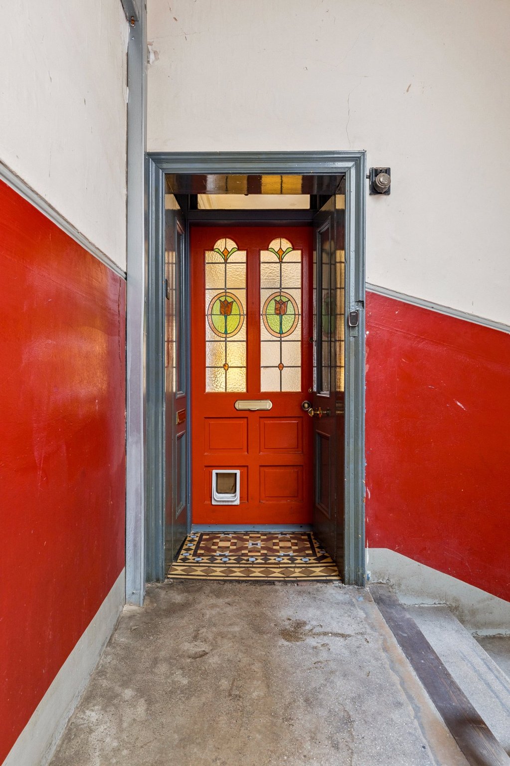 This red sandstone tenement building is accessed into a well-kept communal close and stairwell where the flat is entered on the first floor.