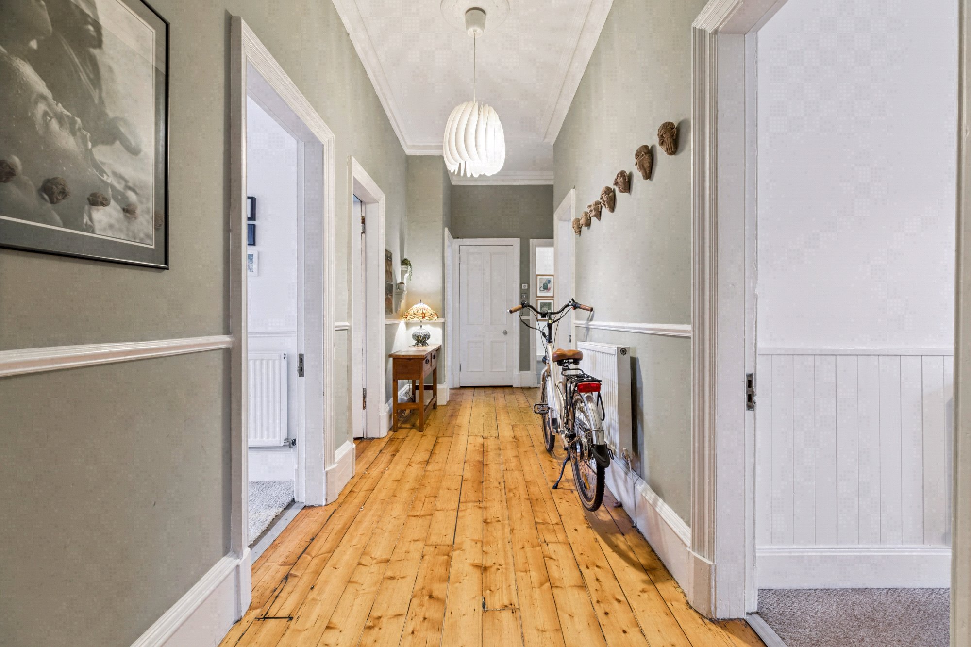 There is an expansive bedroom one with cornicing and feature surround, second double sized bedroom with cornice plaster, third bedroom with integrated wardrobes, fourth bedroom with refurbished floorboards that could easily be utilised as a home office or study and a tiled bathroom with white three piece suite, vanity unit and over-bath shower.
