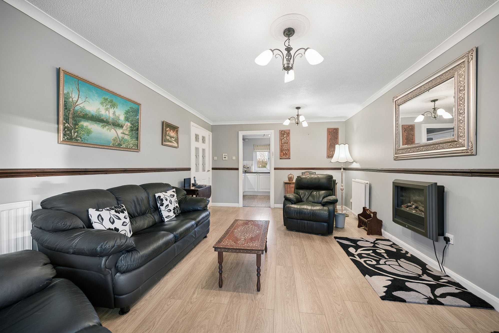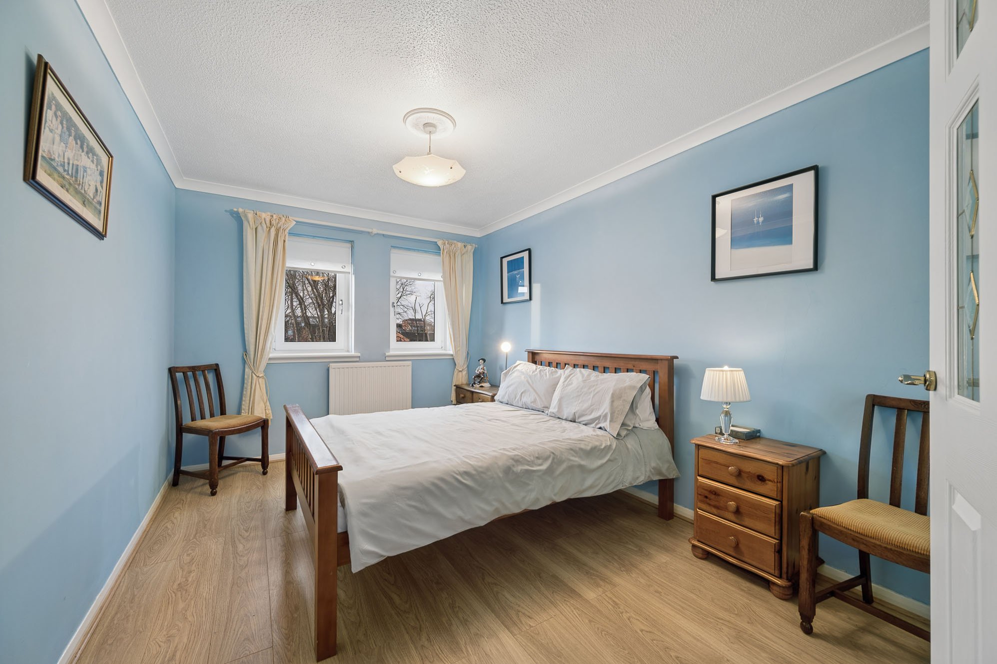 The accommodation of the flat itself comprises welcoming reception hallway with two cupboards off, bay windowed lounge with electric, wall mounted fireplace, kitchen with a range of base and wall mounted units, tiled splashback and ample space for dining table and chairs, two bedrooms, both with integrated wardrobes with sliding, mirrored doors and tiled bathroom with white three piece suite and vanity unit.