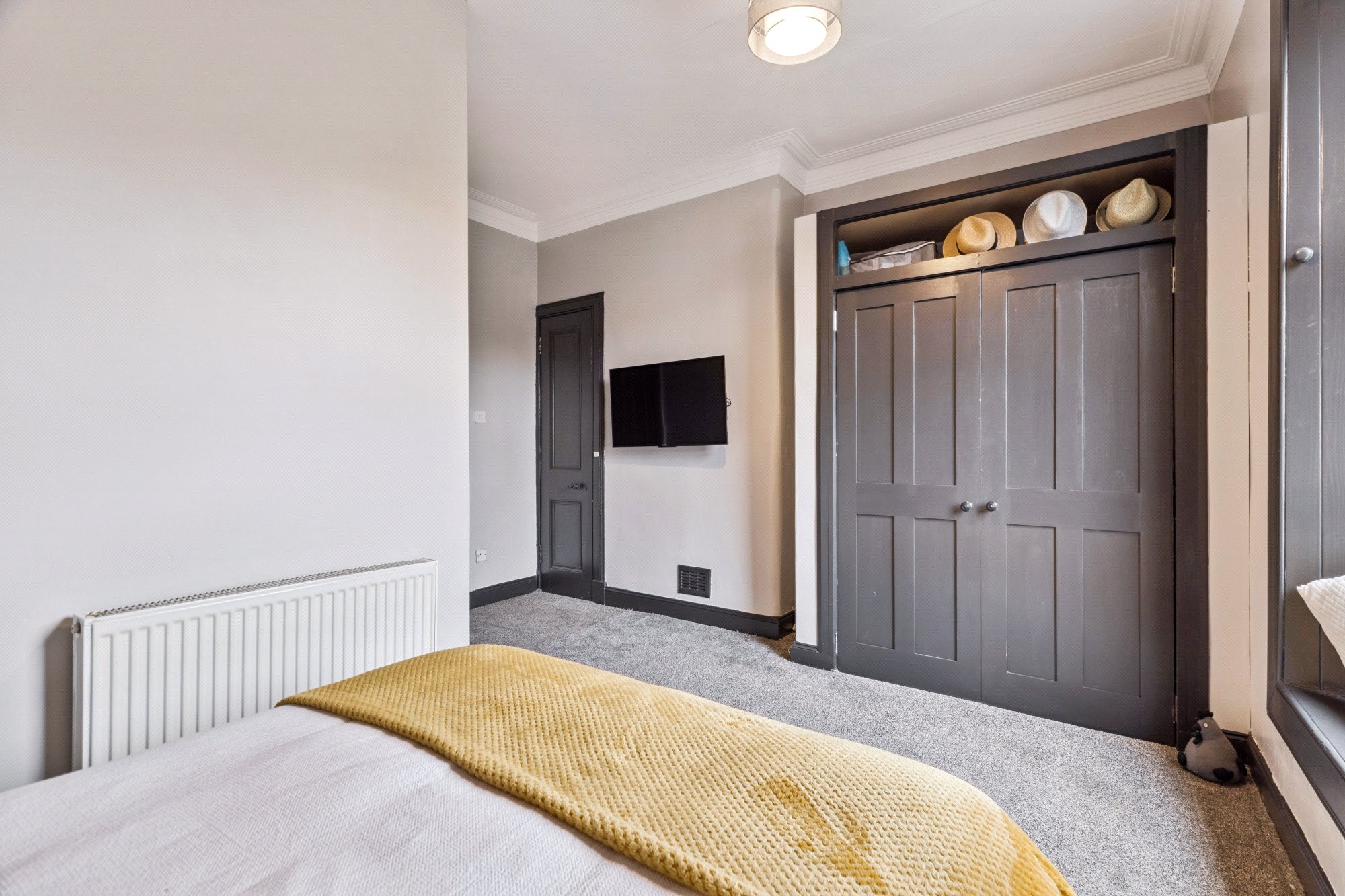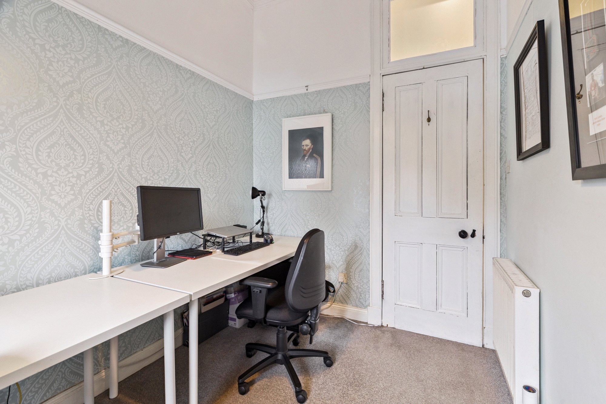 Upstairs, the accommodation comprises a generous bay-windowed principal bedroom with cornicing, two further double bedrooms (one with integrated wardrobes), a fourth bedroom currently utilised as a home office, and an exquisite tiled bathroom featuring a three-piece suite with vanity unit and walk-in shower enclosure.
