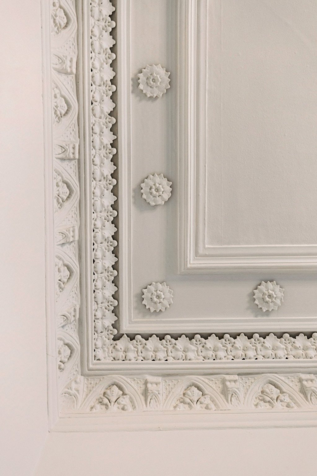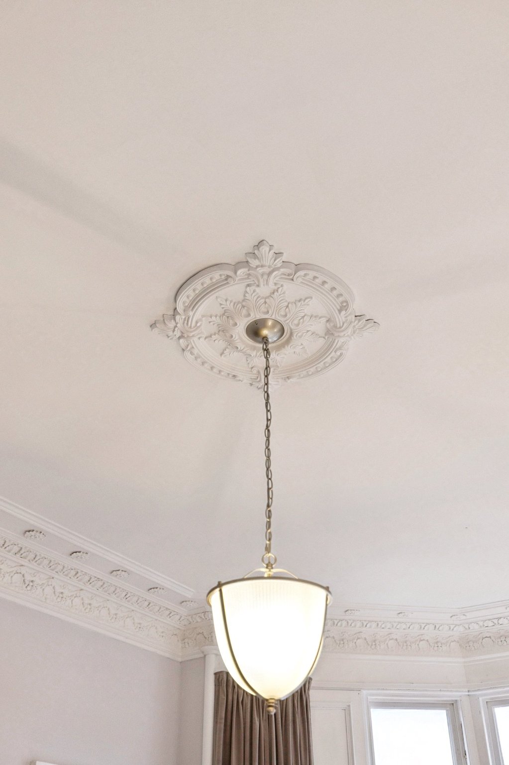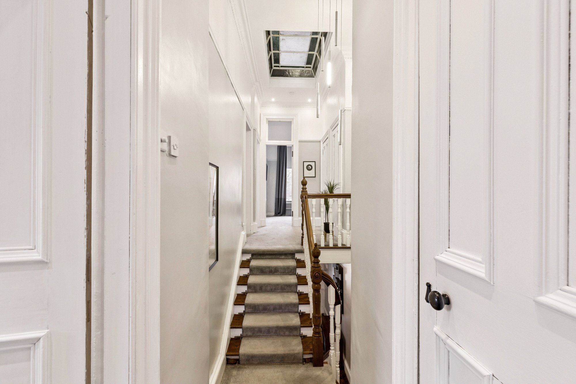 The property is approached via a private driveway and front garden leading to an impressive entrance vestibule and grand reception hallway, where refurbished floorboards and intricate cornicing immediately reflect the home’s period character.