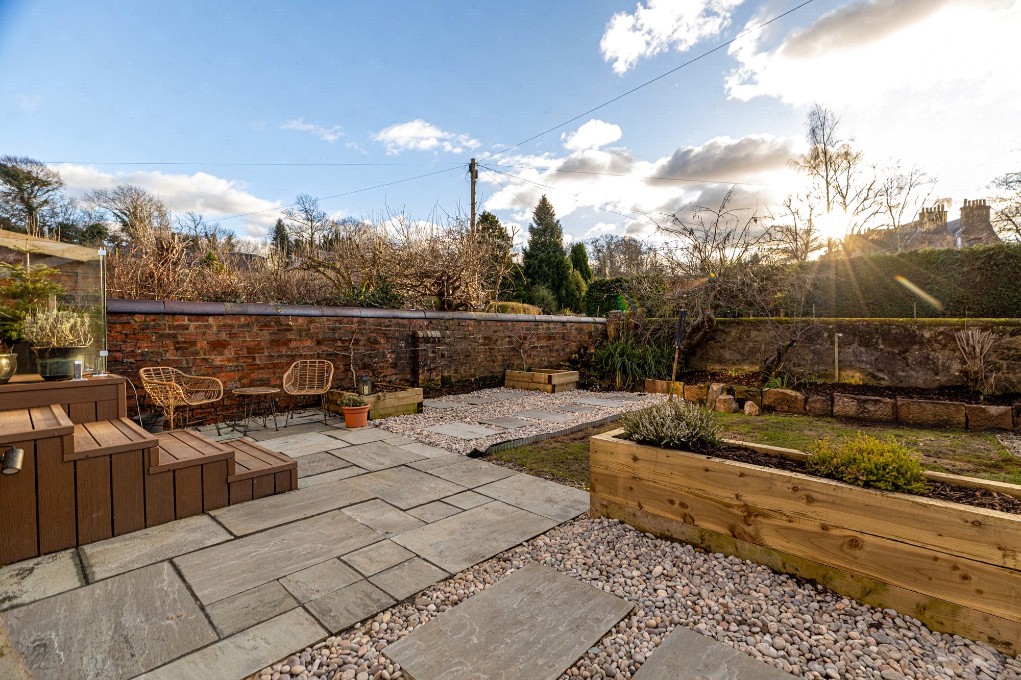 Externally, the landscaped rear garden offers separate patio areas and lawn, alongside composite decking with glass balustrade accessed directly from the kitchen — ideal for entertaining and family use. A private driveway to the front provides valuable off-street parking, a rare advantage within this location.