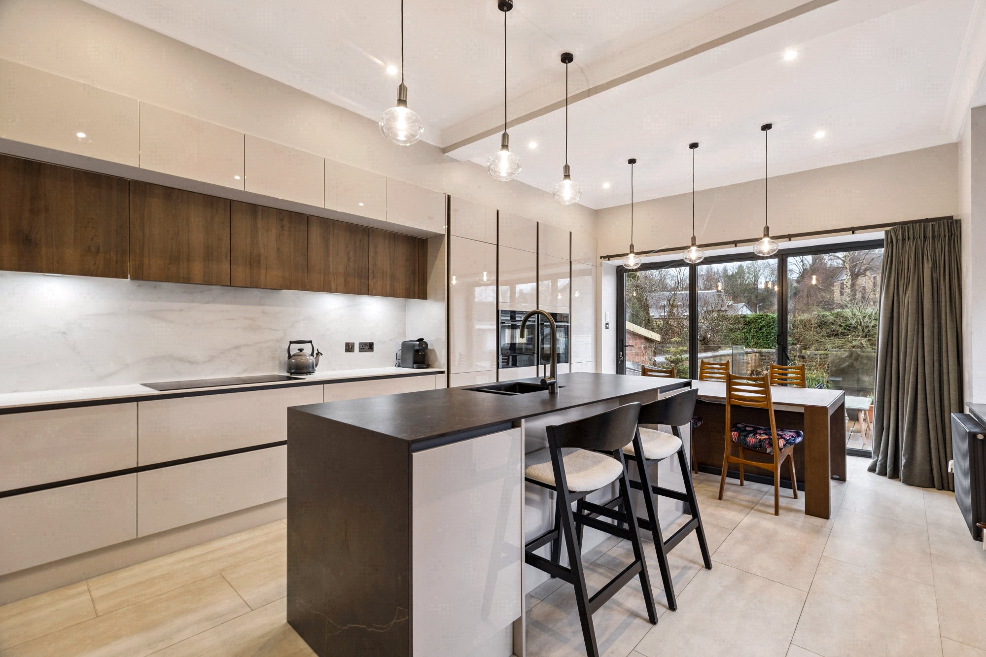 To the rear, the fabulous dining kitchen forms the heart of the home, incorporating a range of quality base and wall mounted units, integrated Neff cooking appliances, Hisense dishwasher and Bosch washing machine, central island and bi-fold doors opening directly onto the landscaped rear garden — creating a seamless indoor-outdoor entertaining space.