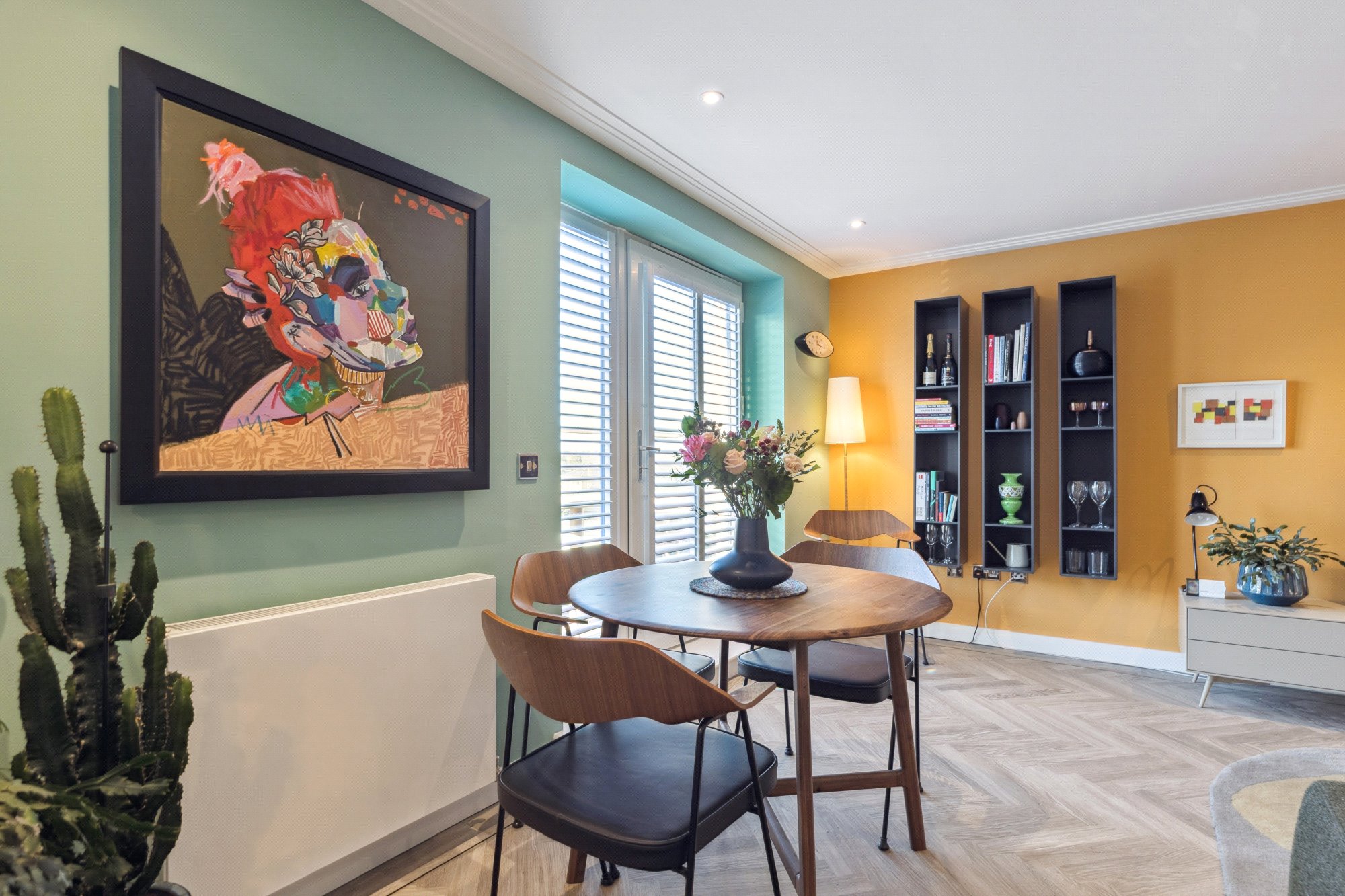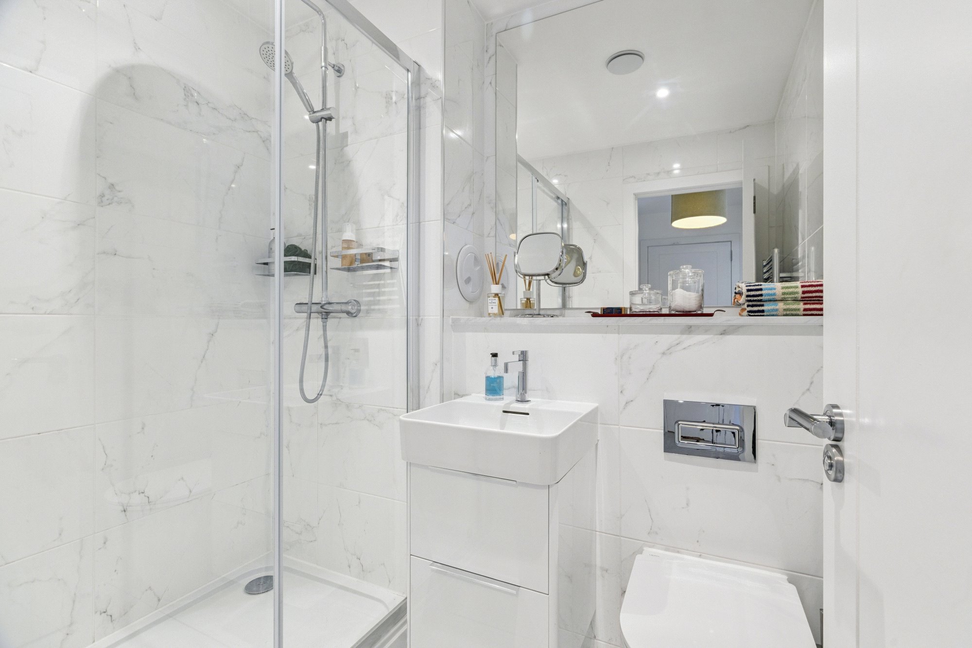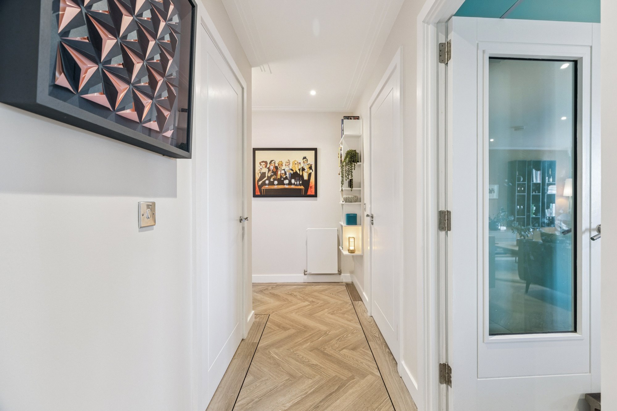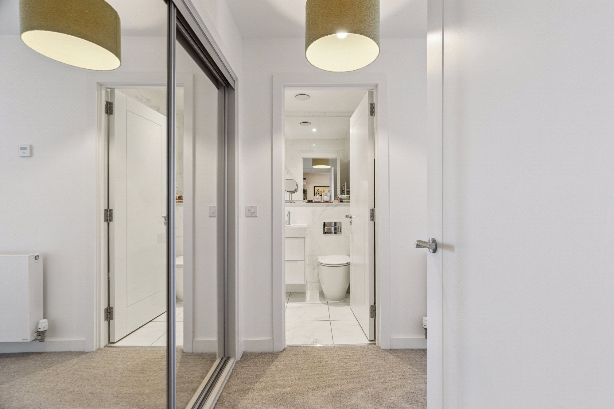 There are two well-proportioned double bedrooms, both benefitting from fitted wardrobes, with the principal bedroom enjoying a stylish en-suite shower room. The current owners have further enhanced the property with elegant ceiling coving and bespoke built-in shelving and drawer units fitted within the bedroom wardrobes, adding practical storage. The accommodation is completed by a contemporary three-piece family bathroom, finished to a high standard.