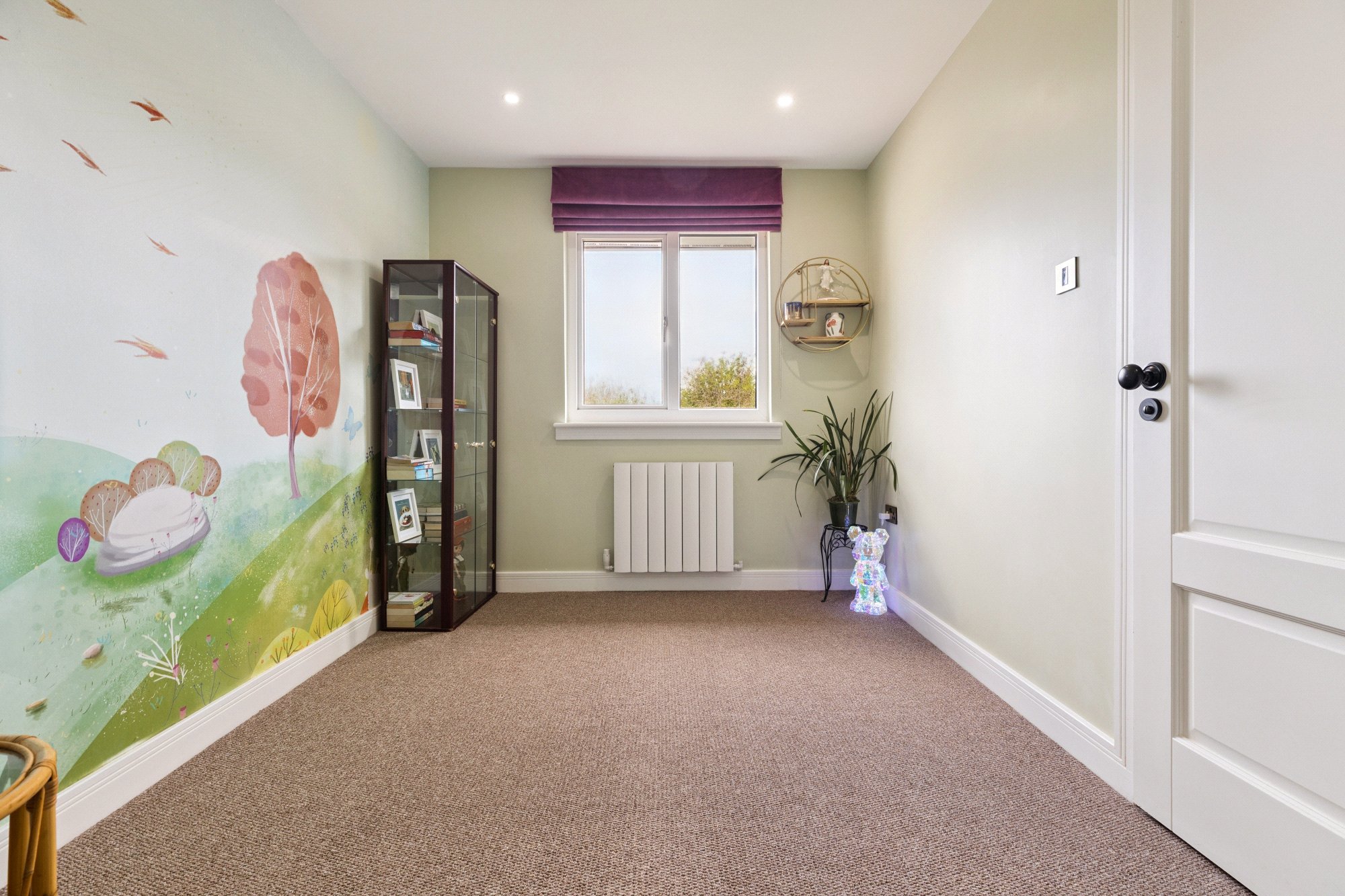 The house is approached via driveway, flanked by front lawn. The accommodation of the house itself comprises welcoming reception hallway, spacious lounge with stunning feature fireplace, semi open plan onto the dining room with sliding door access through to the large sunroom with double door access out to the rear garden. There is a beautiful kitchen with a range of integrated appliances, base and wall mounted units, high quality stone worktop, tiled splashback and shelving, useful utility area and stylish W.C. with panelling, two-piece suite and vanity unit.