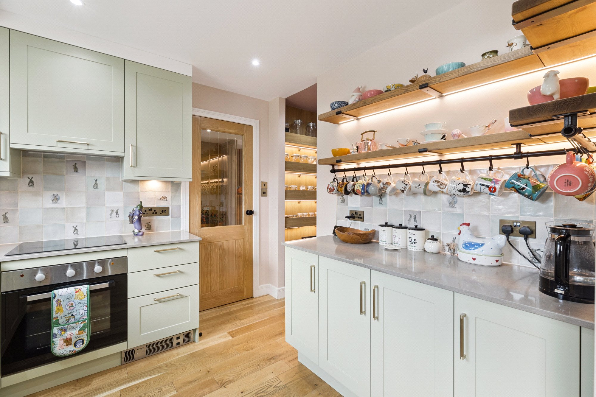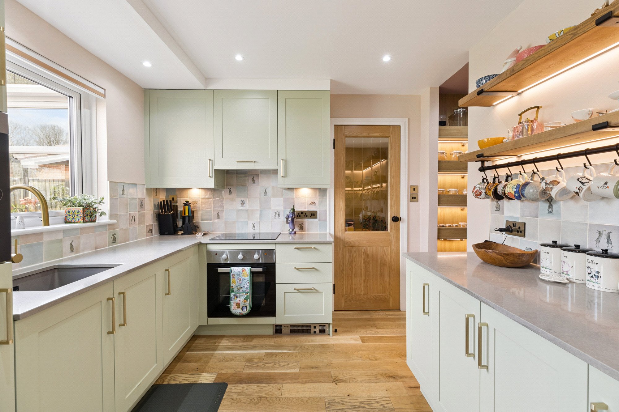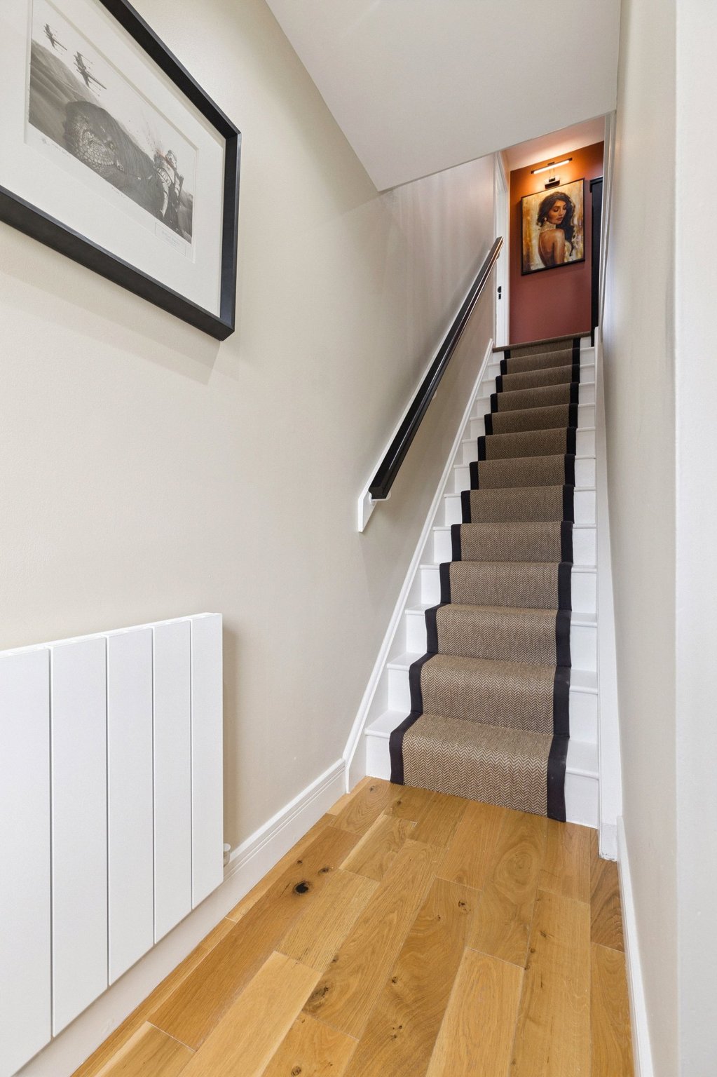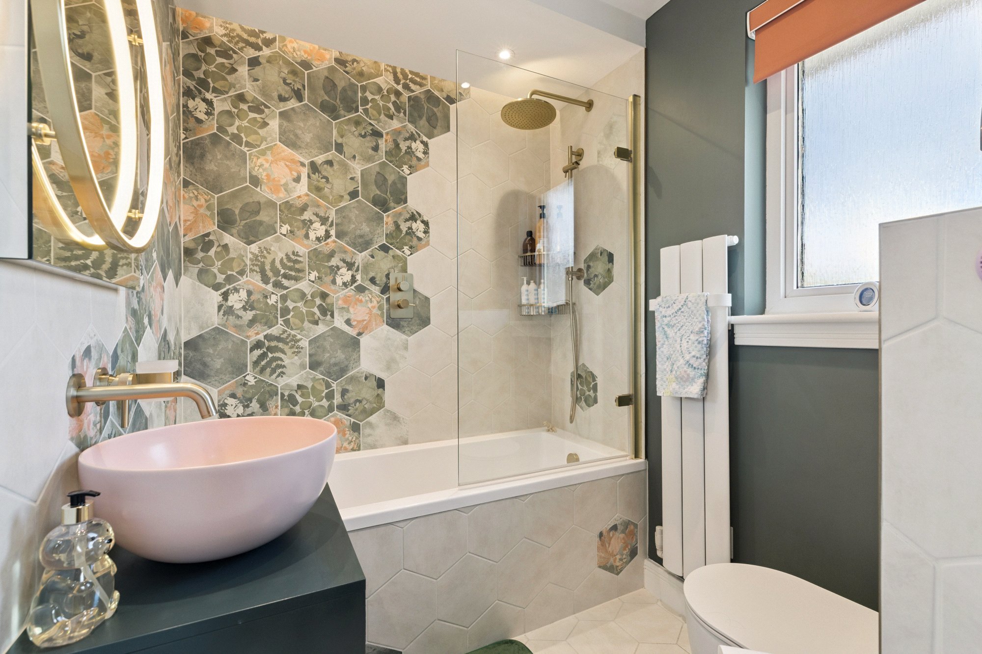 Upstairs, there is an expansive principal bedroom which was originally two rooms, now opened up to form one large space with a dressing area, integrated wardrobes and a gorgeous tiled en suite shower room with a two piece suite and bespoke wash hand basin. As there is already an additional doorway in place, the room could easily be reconfigured back into two separate bedrooms with the simple re erection of a stud partition wall. There are two further double bedrooms and tiled family bathroom with three piece suite.