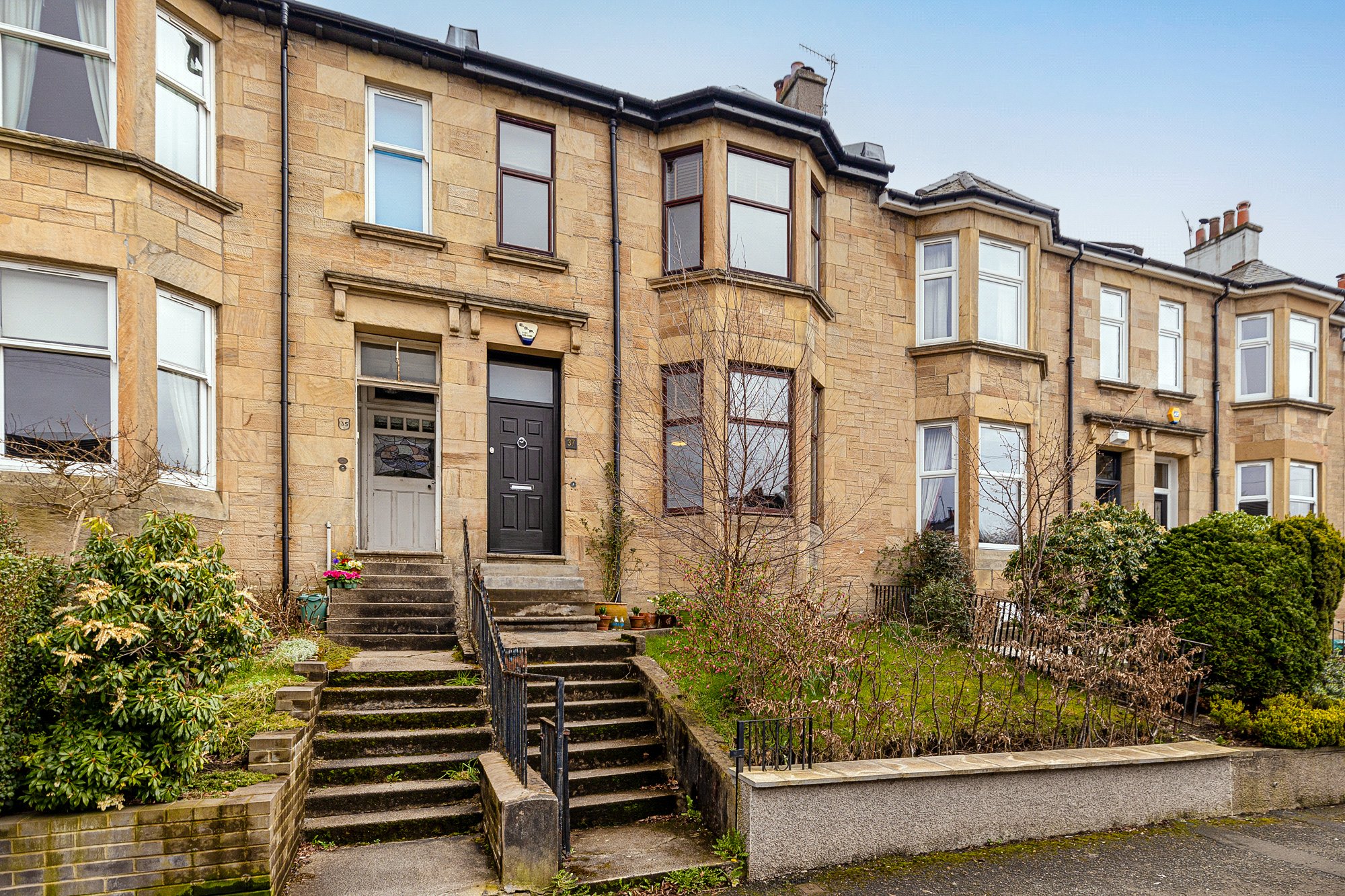 The house is approached via steps, flanked by front garden leading to the front door and entrance vestibule.