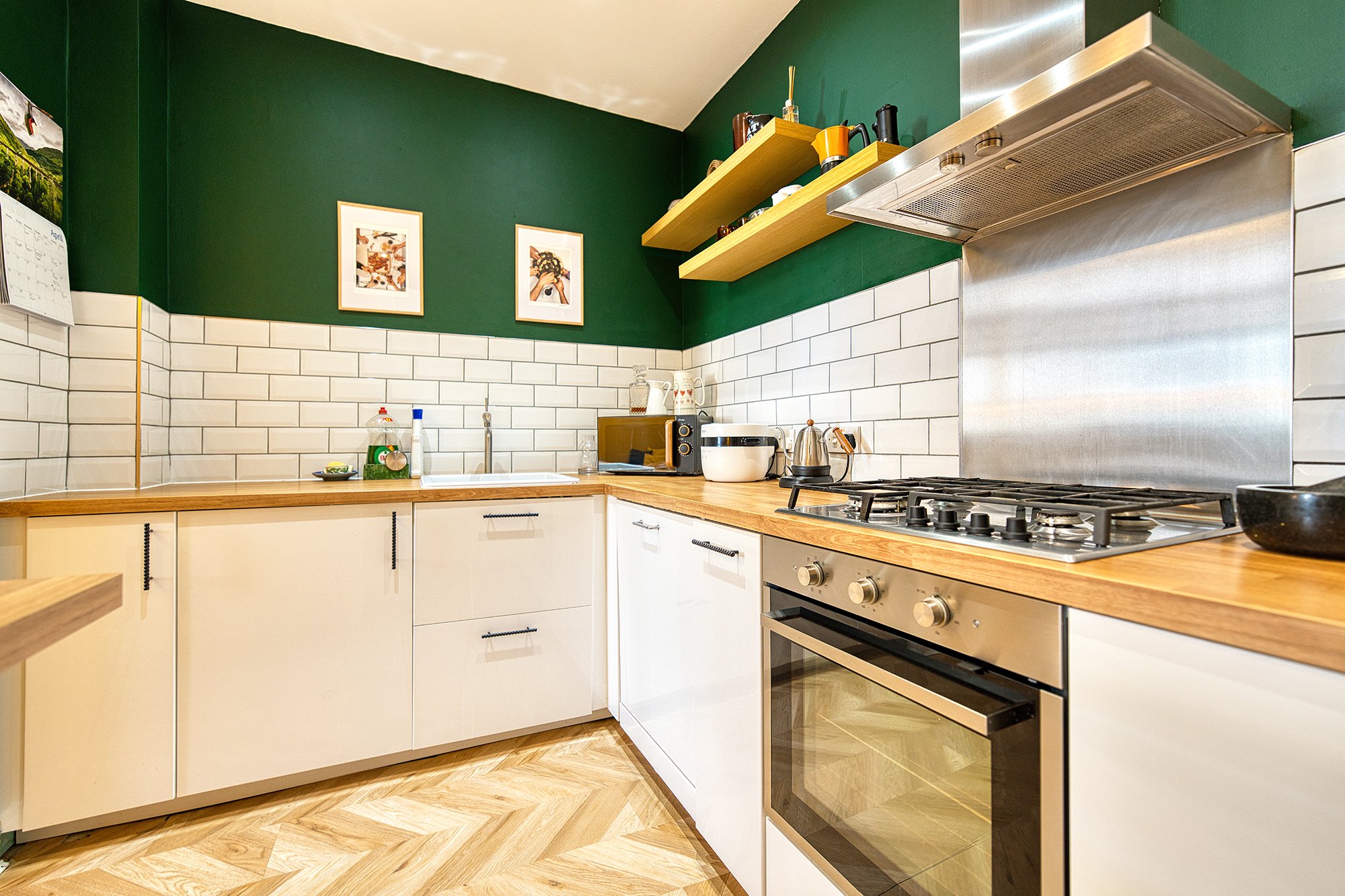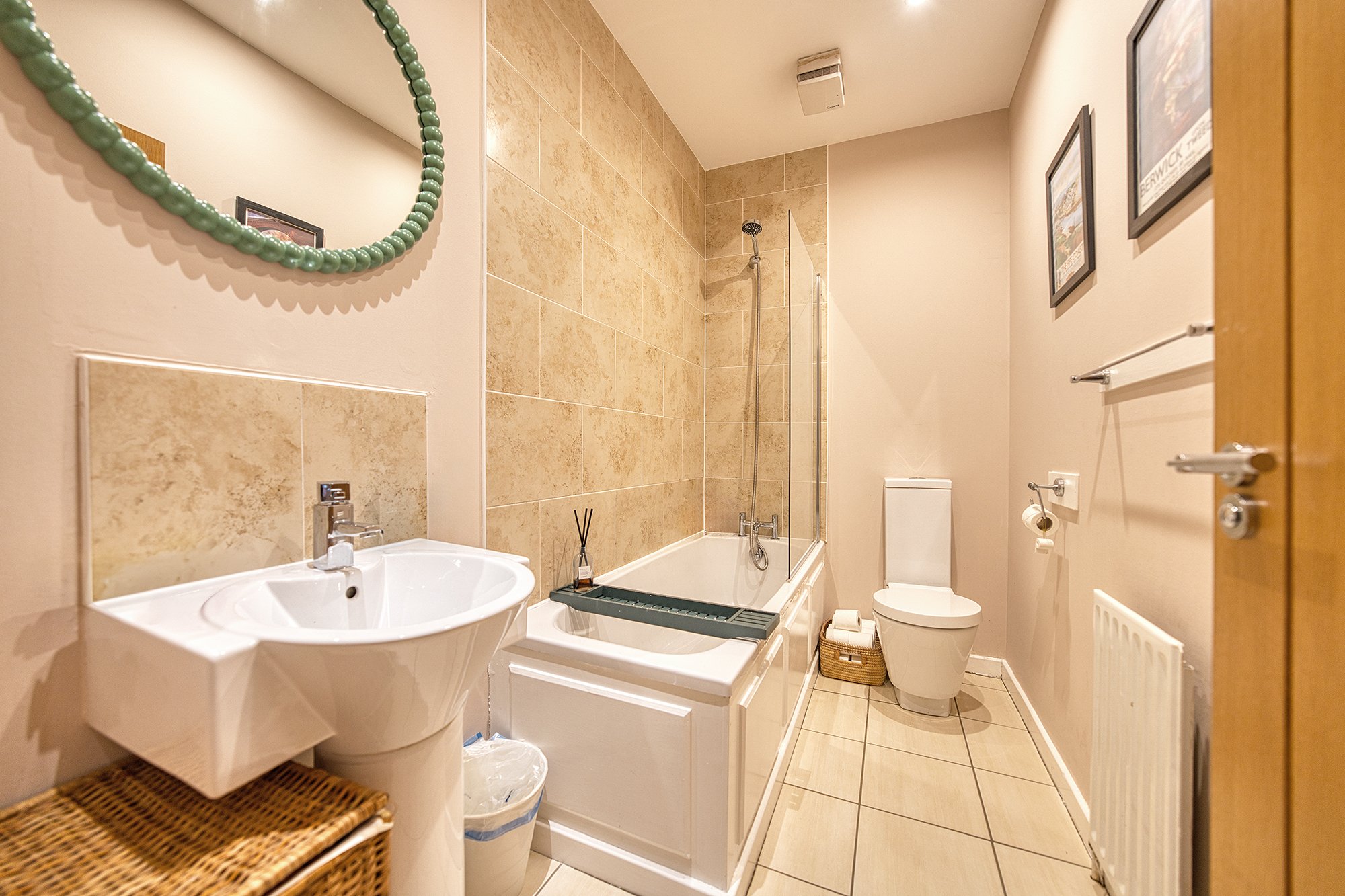 The accommodation of the flat itself comprises welcoming reception hallway with two large cupboards of, spacious lounge with gorgeous feature window, open plan onto a modern kitchen with a range of integrated appliances, tiled splashback and breakfast bar, generous bedroom one with large cupboard and beautiful en-suite shower room with tiling, two piece suite and electric shower, second bedroom with integrated wardrobes and tiled bathroom with white three piece suite.