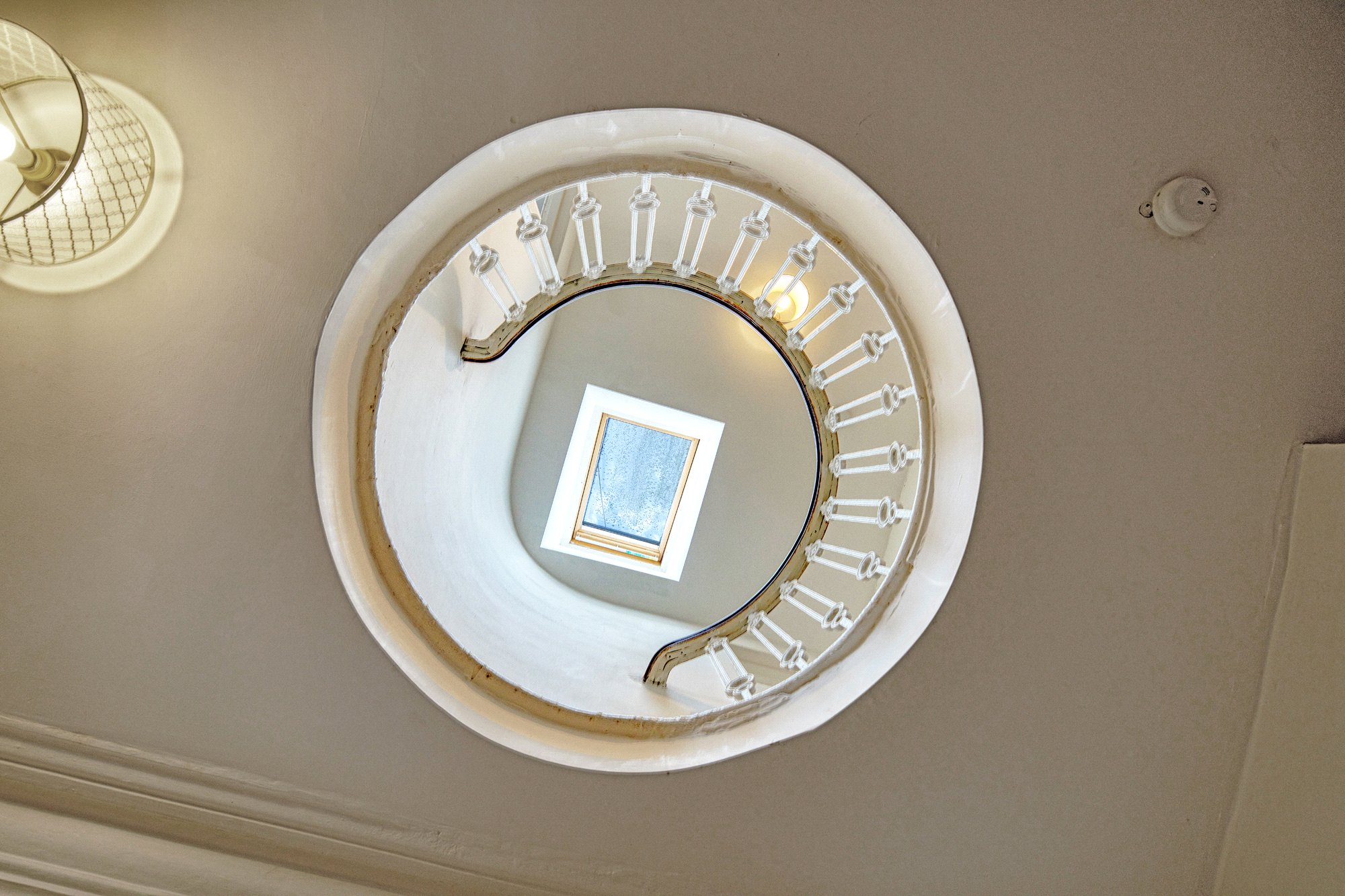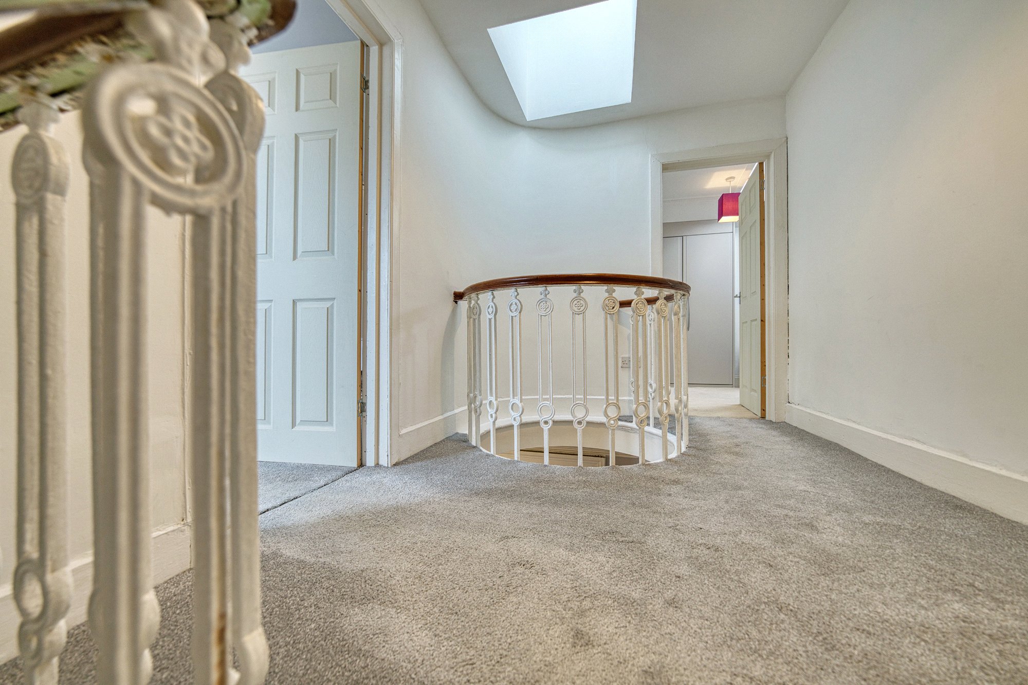 The upper floor is a real highlight. Bedroom one is exceptionally generous in scale, offering a bright and versatile space. A further bedroom is also located on this level, along with a useful landing area and a large walk in cupboard providing excellent storage options. A unique feature in the property is the upper level opening overlooking the floor below, positioned directly beneath a skylight, which brings additional natural light into the lower landing and enhances the feeling of openness between the two floors.