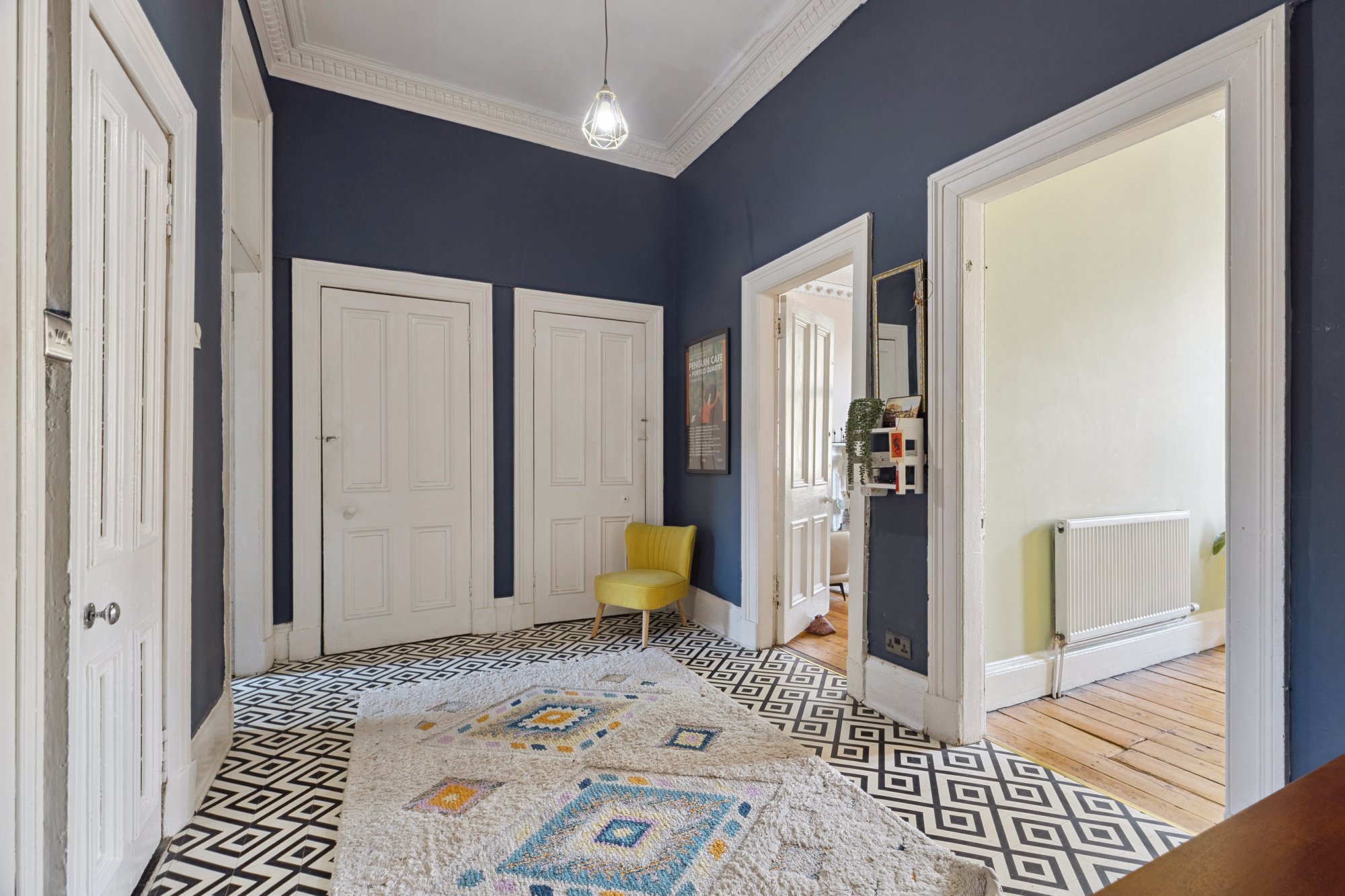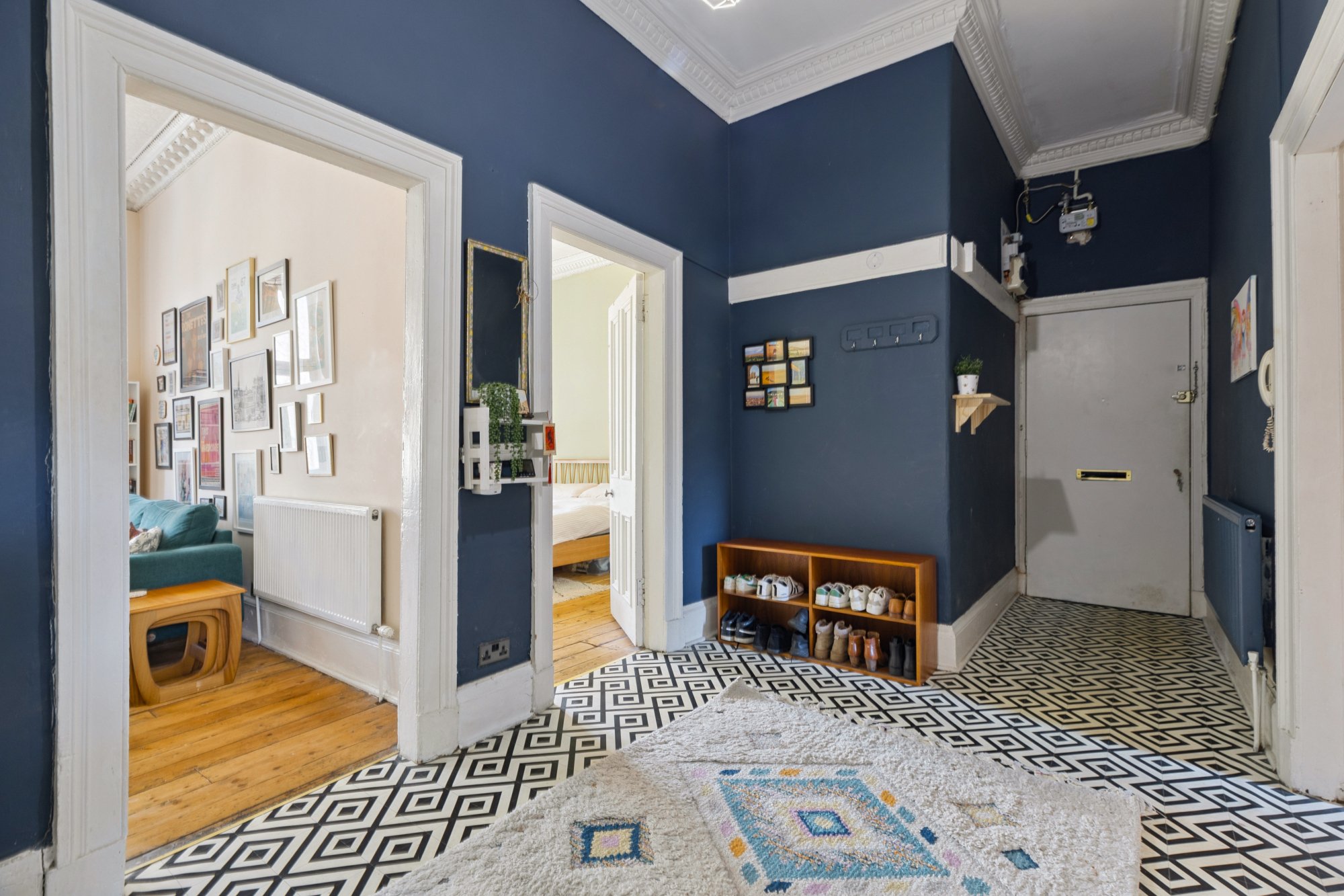 This traditional blonde sandstone tenement apartment features original cornice work, original natural floorboards with large floor to ceiling windows in sitting room.