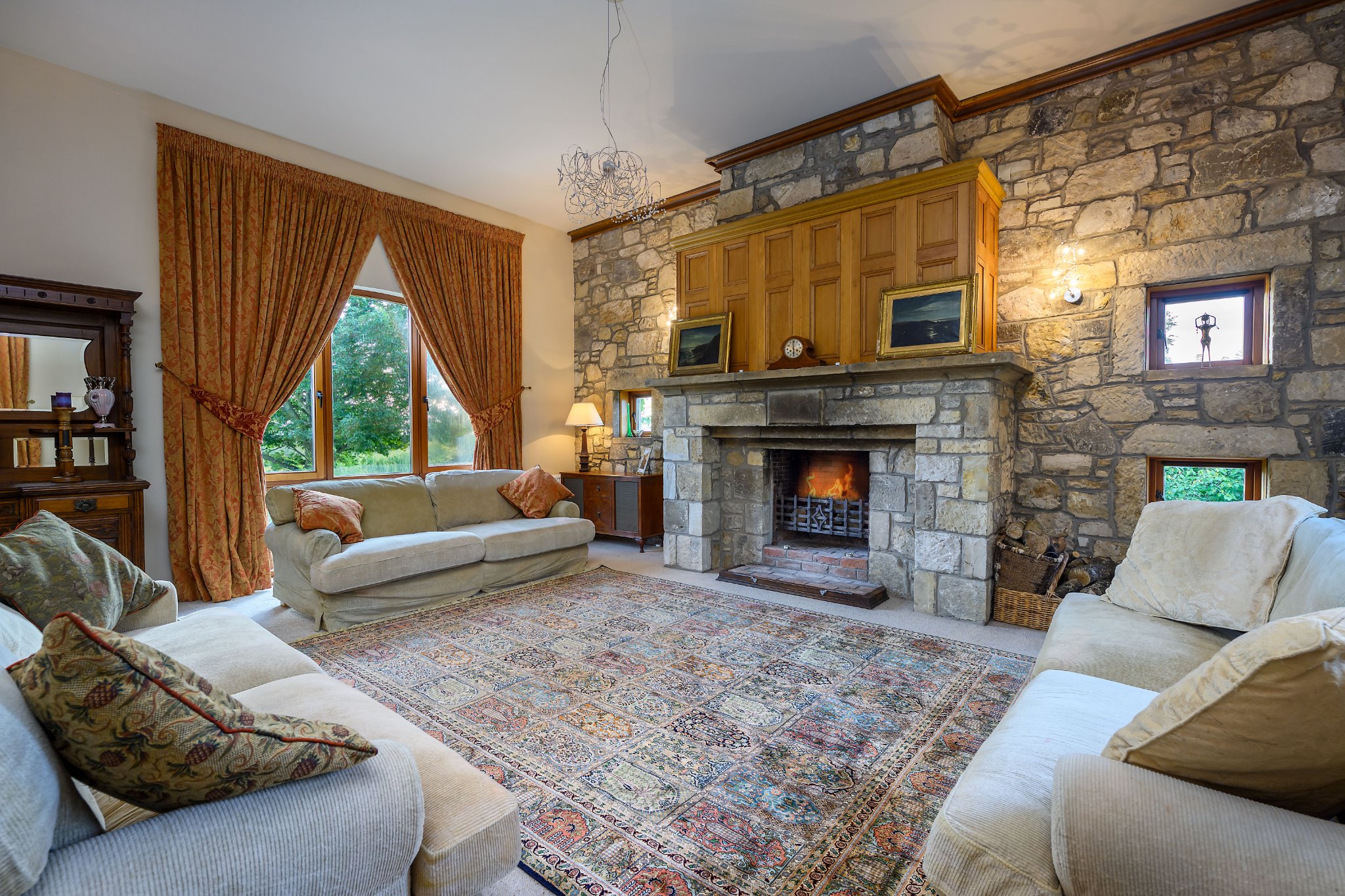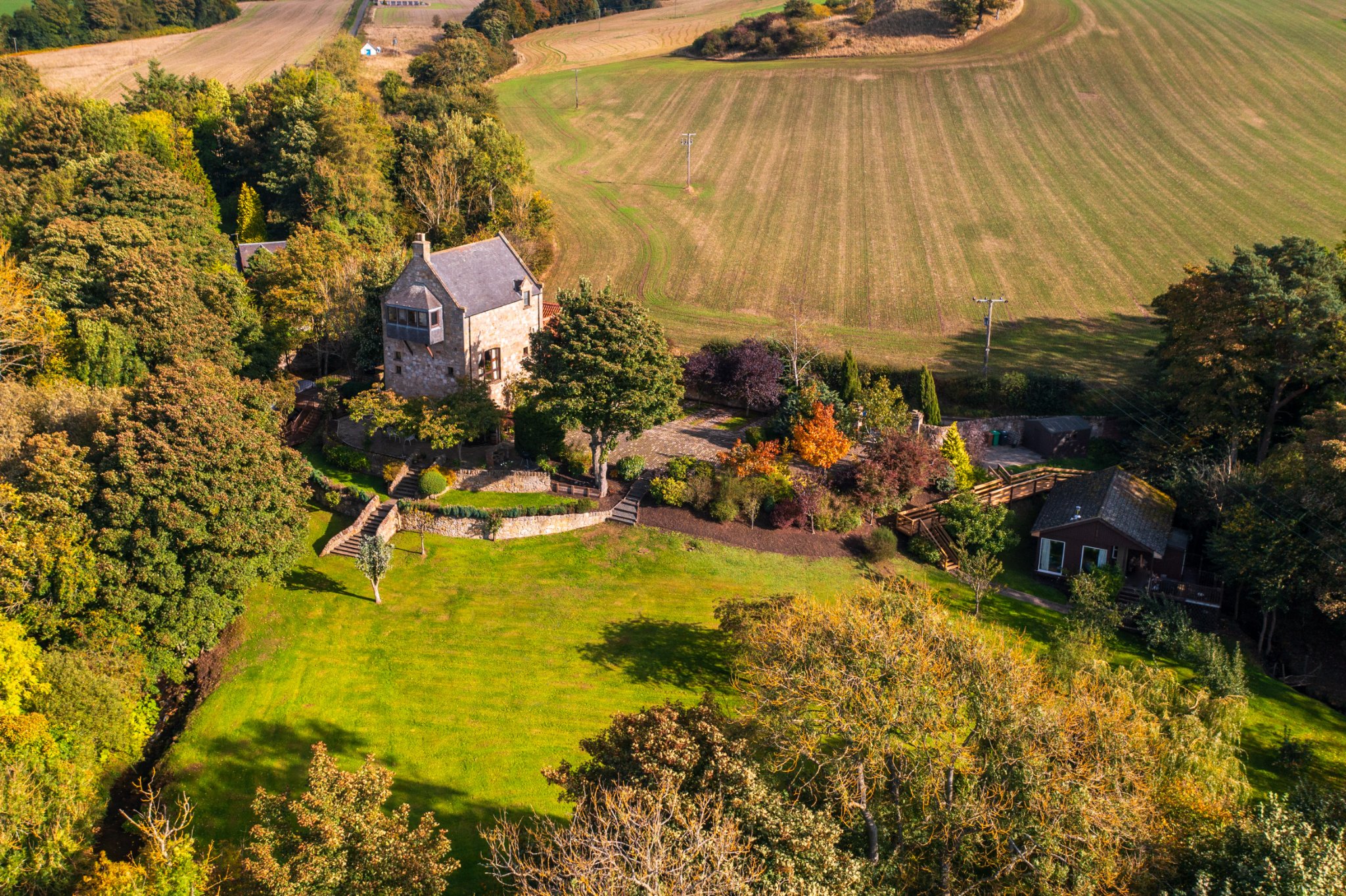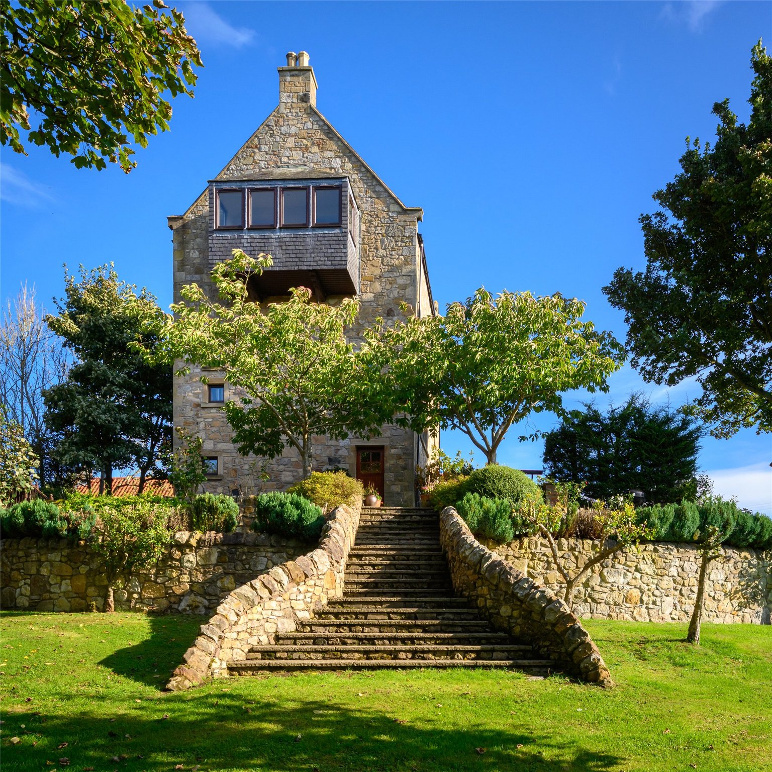 Built to an exacting standard in 1998 in the architectural style of a fortified turreted keep, Pirwindy Keep is a magnificent East Neuk country house that offers a unique and luxurious setting for family life. Generously proportioned and boasting high-quality finishes throughout as well as spectacular views of the landscaped gardens and surrounding countryside it is truly exceptional. Passing through grand stone pillars, a cobbled driveway curves gracefully through landscaped gardens, arriving at the front of the property and its impressive stone façade. The entrance, framed by manicured borders and mature trees, opens into a charming hallway laid with flagstone flooring, immediately setting a tone of character and warmth. This welcoming space provides access to a cloakroom and guest WC, while stone steps ascend to a dining kitchen. Evoking the rustic charm of a traditional country home, the kitchen is centred around a striking cream four-oven AGA set into an exposed stone recess. Twin Belfast sinks and ample worktop space complete this inviting space, which enjoys direct access to a west- and south-facing terrace ideal for alfresco dining and entertaining. To the right of the entrance hall, a light-filled south-east-facing sitting room flows into an adjoining family room through elegant bi-folding doors. This thoughtful layout allows the space to function as an expansive open-plan entertaining area or two distinct rooms for day-to-day comfort. A peaceful retreat, the carpeted sitting room is decorated in soft neutrals and features an open fireplace. The family room, currently arranged as a home cinema with an Optoma projector and screen, continues the stylish yet relaxed feel of the sitting room and opens to the side of the house. Beyond, a second hallway, enhanced with elegant wooden flooring, leads past a practical utility room to a luxurious ground-floor bathroom and a spacious bedroom. Double doors open from the bedroom onto a patio with views of a bluebell meadow and the charming timber bridge. Designed with a contemporary aesthetic, it features a countertop washbasin, a Victory Jacuzzi round bath, a separate shower enclosure, and a hidden cistern wall-hung WC. Ascending to the upper floors from both the kitchen corridor and family room, the home continues to impress. The drawing room located within the tower-like keep is a spectacular space, encircled by windows that frame panoramic views of the countryside. A large open fireplace set into an exposed stone wall and decorative timber panelling adds grandeur. From here, a connecting hallway, illuminated by three Velux windows, and base lighting offers an ideal study or reading nook and leads to a corridor hosting four double bedrooms and a well-appointed modern family bathroom with a freestanding bath and separate shower. On the top floor, the principal suite is a luxurious and private retreat. Encompassing two dressing rooms, a freestanding bath, an en suite WC, and a serene sitting area, it provides the perfect vantage point from which to enjoy the breathtaking landscape in seclusion and comfort.
