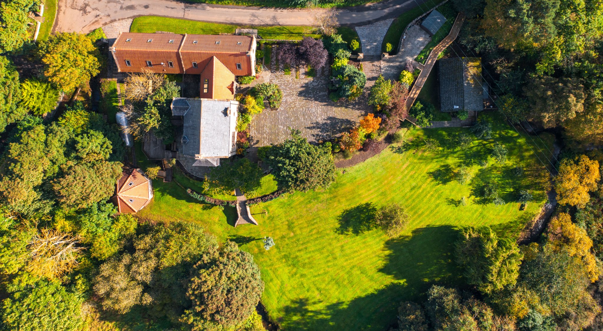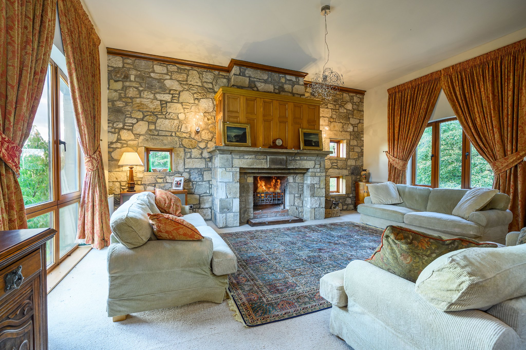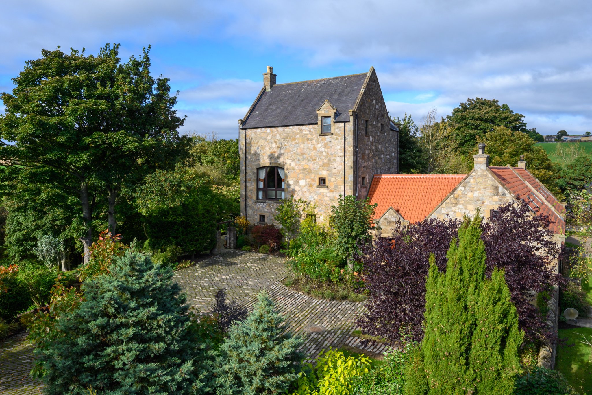 Built to an exacting standard in 1998 in the architectural style of a fortified turreted keep, Pirwindy Keep is a magnificent East Neuk country house that offers a unique and luxurious setting for family life. Generously proportioned and boasting high-quality finishes throughout as well as spectacular views of the landscaped gardens and surrounding countryside it is truly exceptional. Passing through grand stone pillars, a cobbled driveway curves gracefully through landscaped gardens, arriving at the front of the property and its impressive stone façade. The entrance, framed by manicured borders and mature trees, opens into a charming hallway laid with flagstone flooring, immediately setting a tone of character and warmth. This welcoming space provides access to a cloakroom and guest WC, while stone steps ascend to a dining kitchen. Evoking the rustic charm of a traditional country home, the kitchen is centred around a striking cream four-oven AGA set into an exposed stone recess. Twin Belfast sinks and ample worktop space complete this inviting space, which enjoys direct access to a west- and south-facing terrace ideal for alfresco dining and entertaining. To the right of the entrance hall, a light-filled south-east-facing sitting room flows into an adjoining family room through elegant bi-folding doors. This thoughtful layout allows the space to function as an expansive open-plan entertaining area or two distinct rooms for day-to-day comfort. A peaceful retreat, the carpeted sitting room is decorated in soft neutrals and features an open fireplace. The family room, currently arranged as a home cinema with an Optoma projector and screen, continues the stylish yet relaxed feel of the sitting room and opens to the side of the house. Beyond, a second hallway, enhanced with elegant wooden flooring, leads past a practical utility room to a luxurious ground-floor bathroom and a spacious bedroom. Double doors open from the bedroom onto a patio with views of a bluebell meadow and the charming timber bridge. Designed with a contemporary aesthetic, it features a countertop washbasin, a Victory Jacuzzi round bath, a separate shower enclosure, and a hidden cistern wall-hung WC. Ascending to the upper floors from both the kitchen corridor and family room, the home continues to impress. The drawing room located within the tower-like keep is a spectacular space, encircled by windows that frame panoramic views of the countryside. A large open fireplace set into an exposed stone wall and decorative timber panelling adds grandeur. From here, a connecting hallway, illuminated by three Velux windows, and base lighting offers an ideal study or reading nook and leads to a corridor hosting four double bedrooms and a well-appointed modern family bathroom with a freestanding bath and separate shower. On the top floor, the principal suite is a luxurious and private retreat. Encompassing two dressing rooms, a freestanding bath, an en suite WC, and a serene sitting area, it provides the perfect vantage point from which to enjoy the breathtaking landscape in seclusion and comfort.