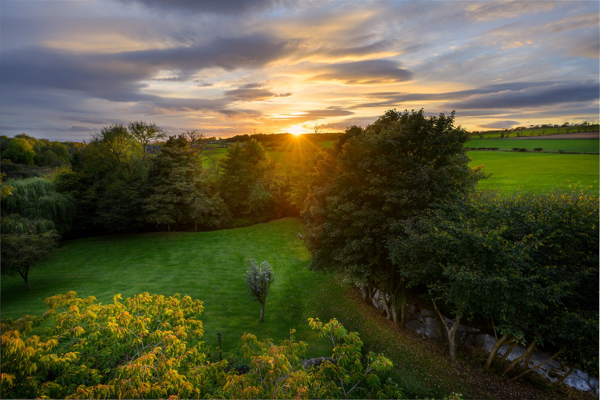 The beautifully landscaped garden with breathtaking views blends vibrant flower beds, well-stocked borders, and an array of mature and young trees, including a striking sycamore. A flagstone terrace sits elevated above the garden with steps leading down to a generous lawn, an idyllic setting for outdoor entertaining. There is a dedicated barbecue area shaded by two ornamental cherry trees along with a raised timber deck, perfect for alfresco dining.