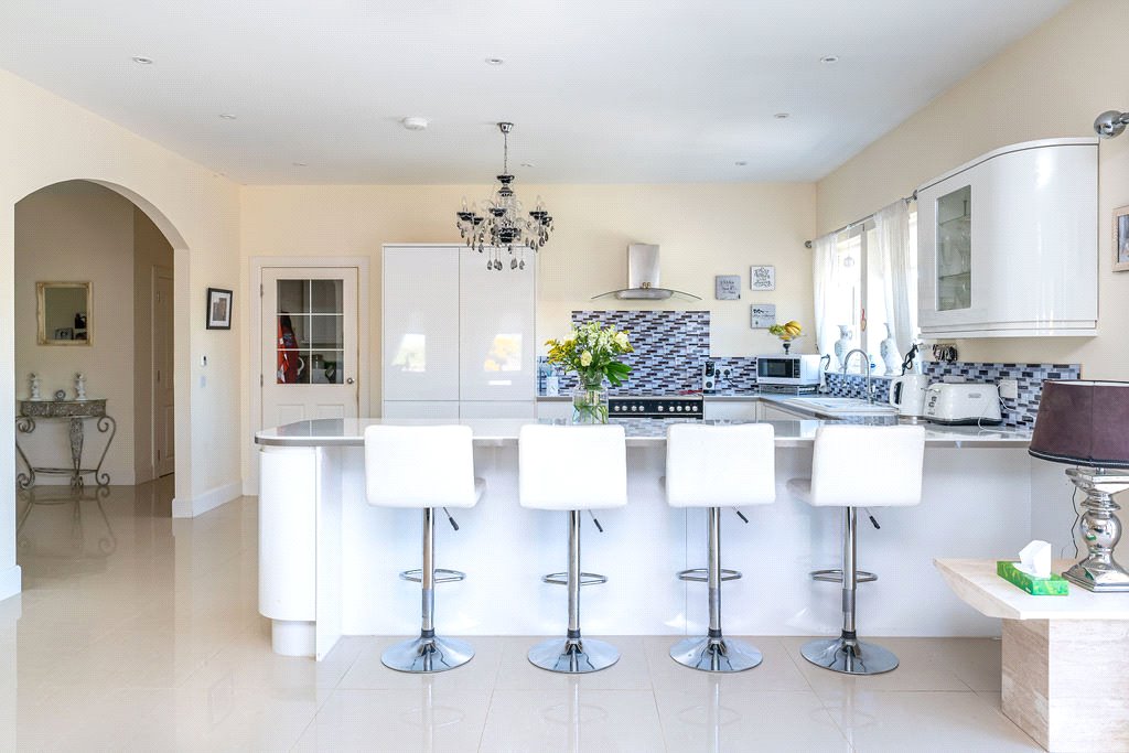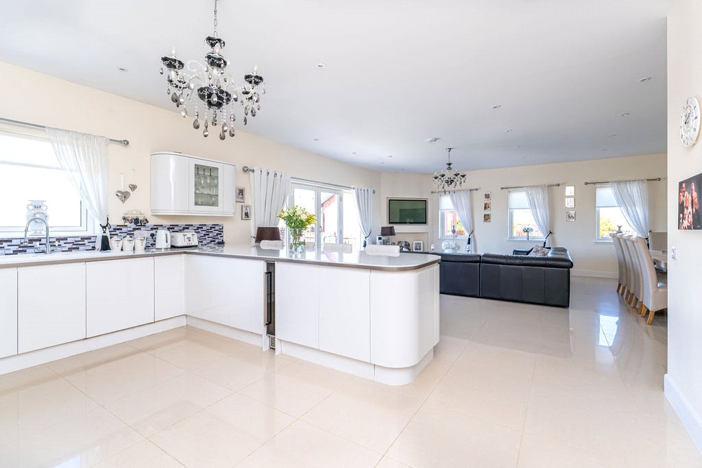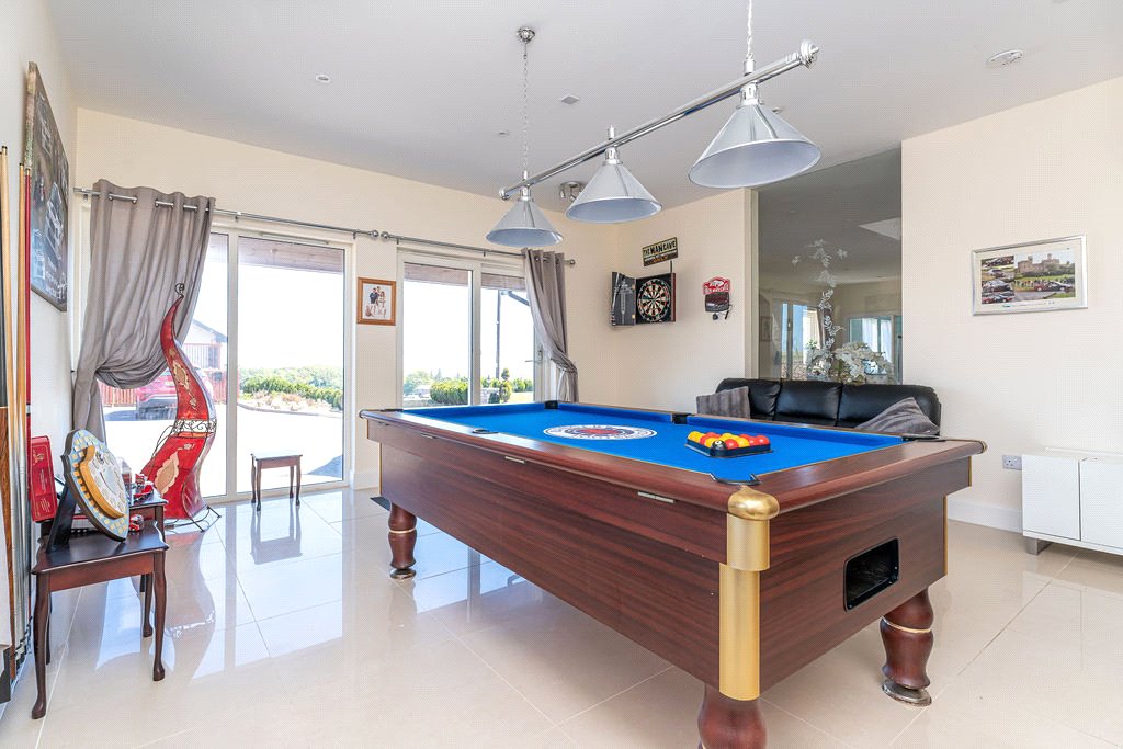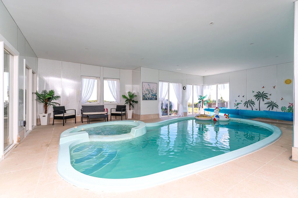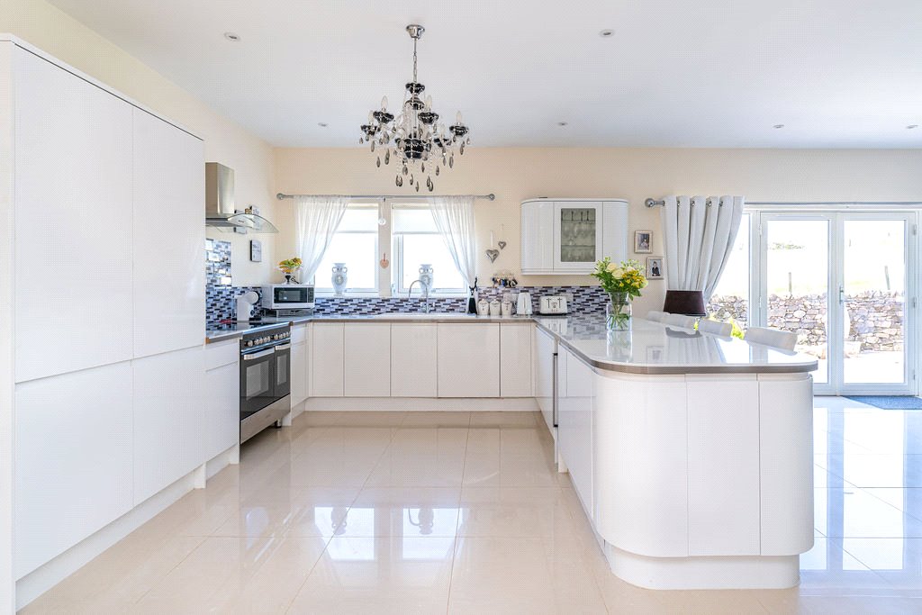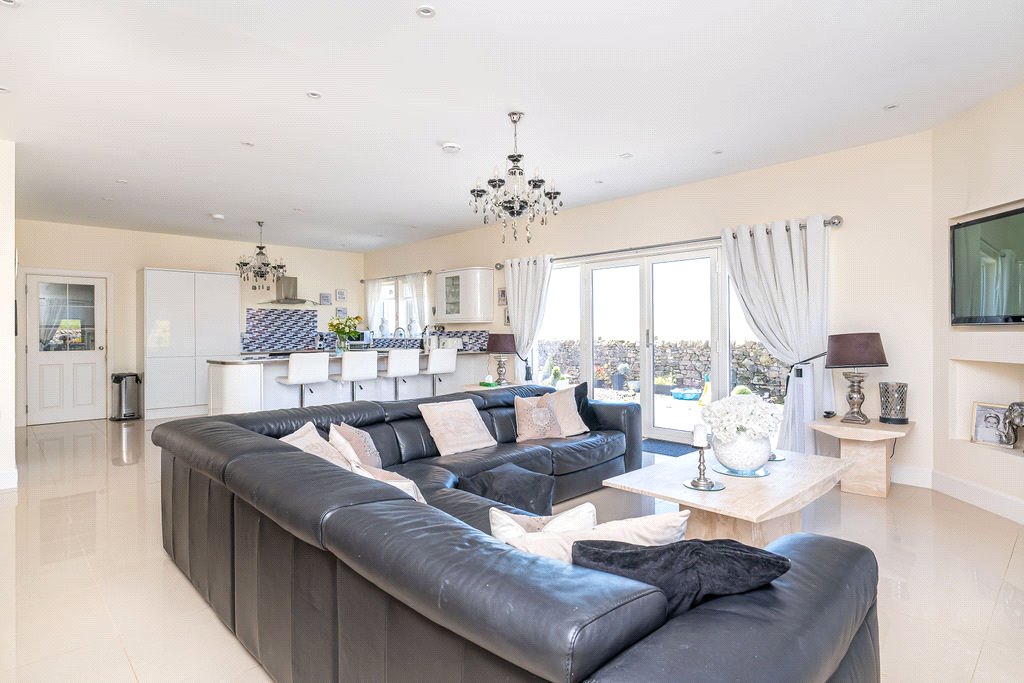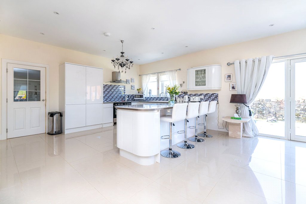 Hillview House is an immaculately presented, substantial detached modern house with superb indoor swimming pool, useful 3 bed apartment / annexe, 5 car garage and stunning far-reaching sea views. Newly built in 2015 it boasts generous bright contemporary living spaces and is finished to a high standard throughout. The impressive turreted circular entrance vestibule leads into the stunning main inner hall, featuring a central bifurcated main staircase. The modern swimming pool, with wet room off, and family room are accessed off either side of the hall, with the plant room to the rear. A hallway then leads off through to a separate staircase up to the fabulous open plan, kitchen / living / dining area and the principal bedroom suite, with walk in wardrobe, ensuite and additional storage. Both spaces open out to the decked terrace that runs along the length of the rear south-west elevation of the property. Upstairs there are five further bedrooms, three of which benefit from both en-suite bathrooms and walk in wardrobes, a family bathroom and generous storage. The house has double glazing and oil-fired central heating, and there is a bank of photovoltaic panels on the adjacent garage block.