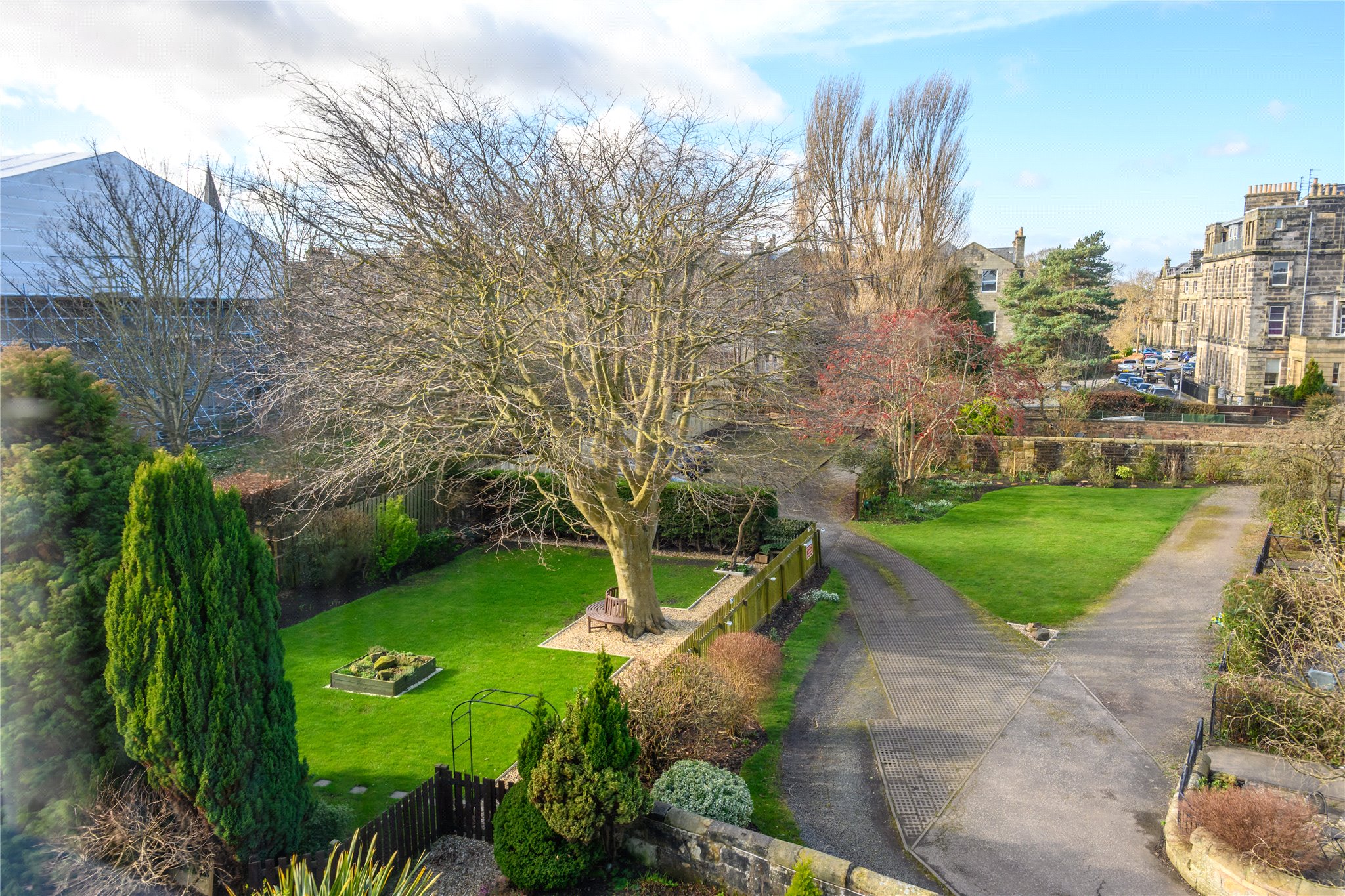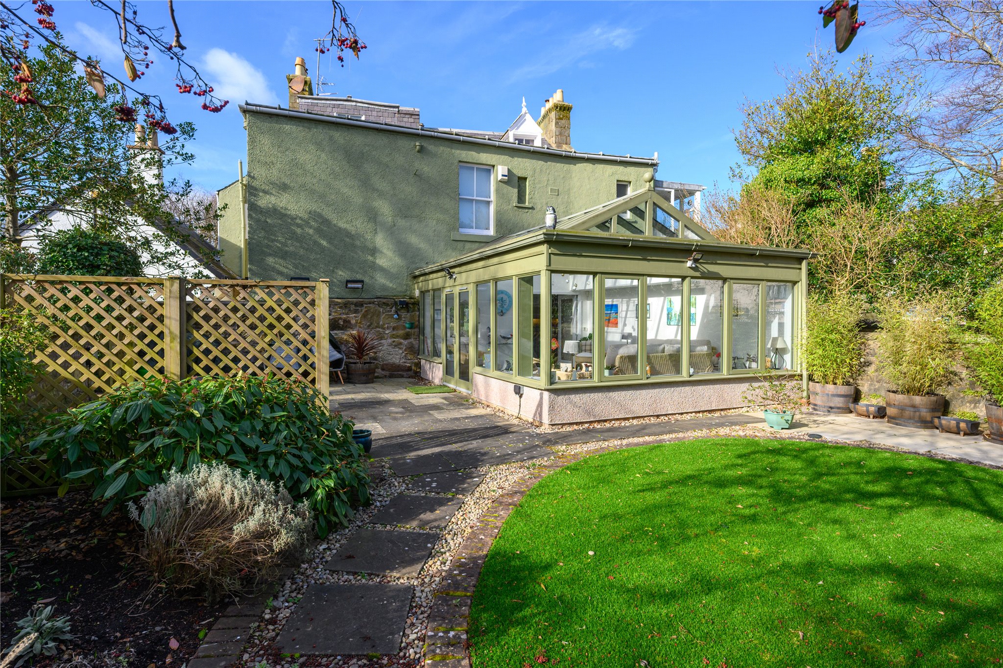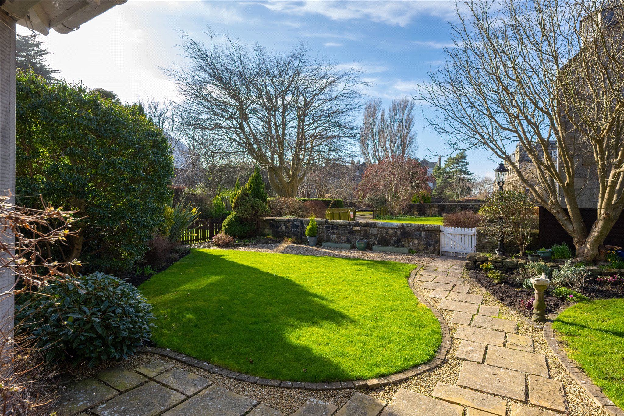 To the rear, the conservatory opens out onto a paved terrace, leading to an Astroturf lawn surrounded by well-stocked borders and pathways. Two timber sheds provide practical storage, while a trellis and established rhododendrons add seasonal colour and privacy. A further enclosed garden area includes a drying green and a small putting lawn, all bordered by traditional stone walls—offering a secure, peaceful outdoor space with charm and character. Both gardens have gates opening onto Greyfriars Garden leading directly into the town centre.