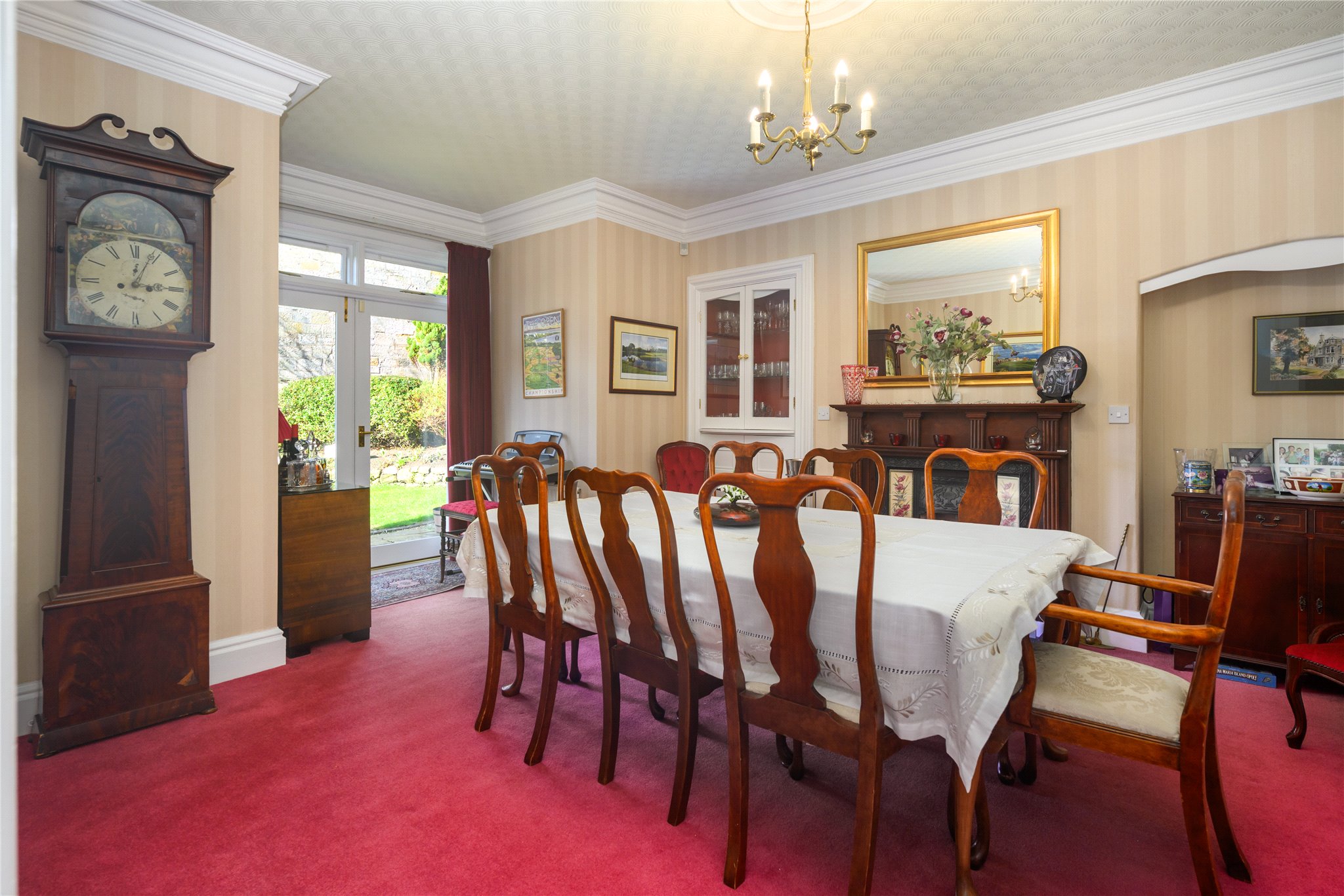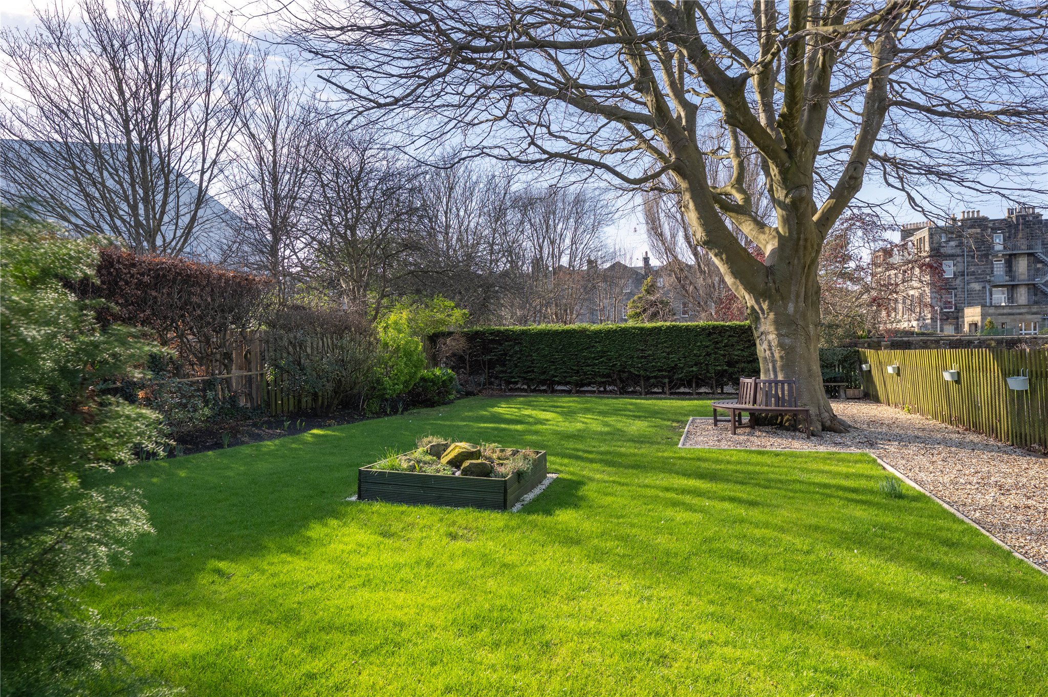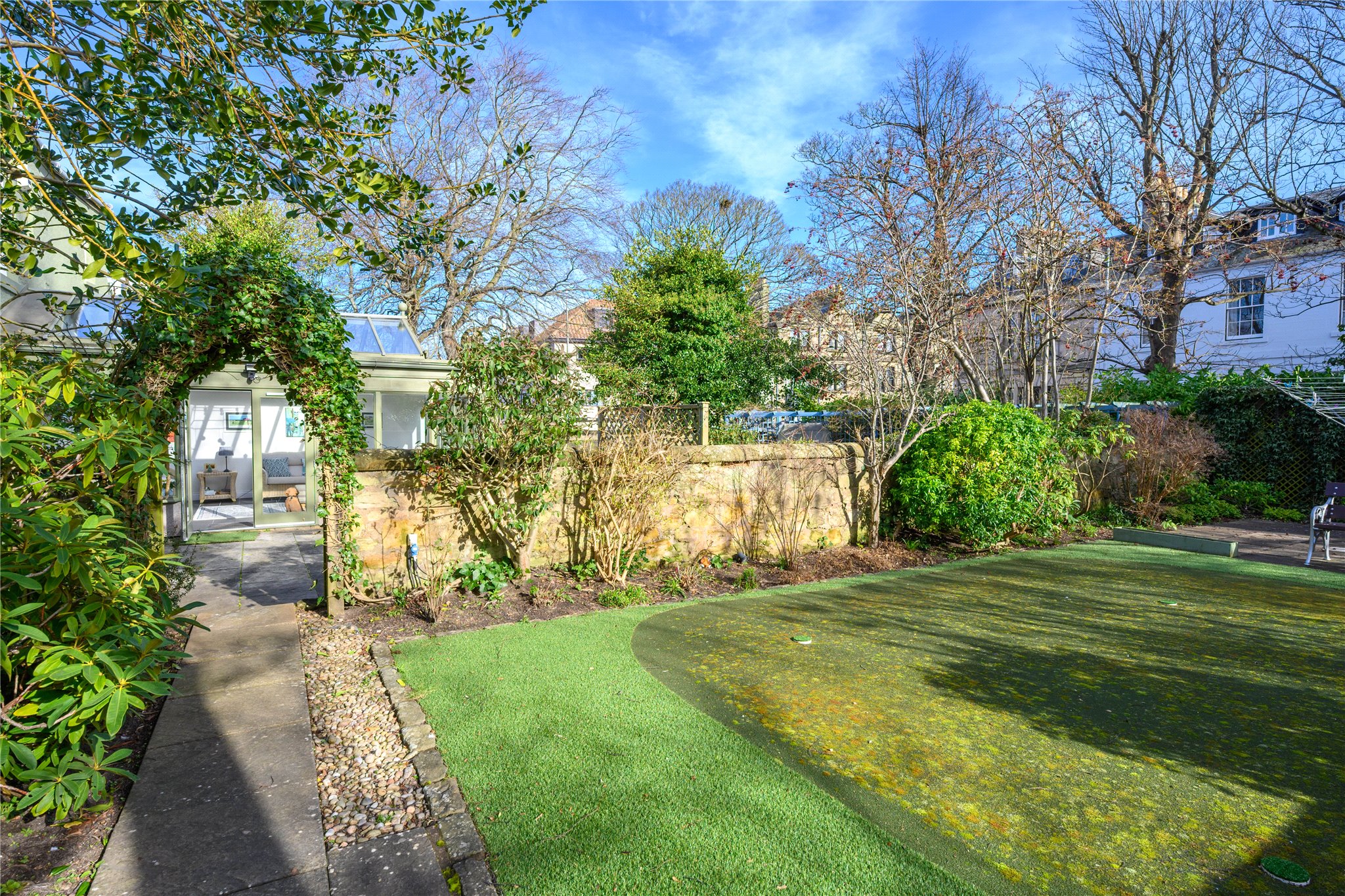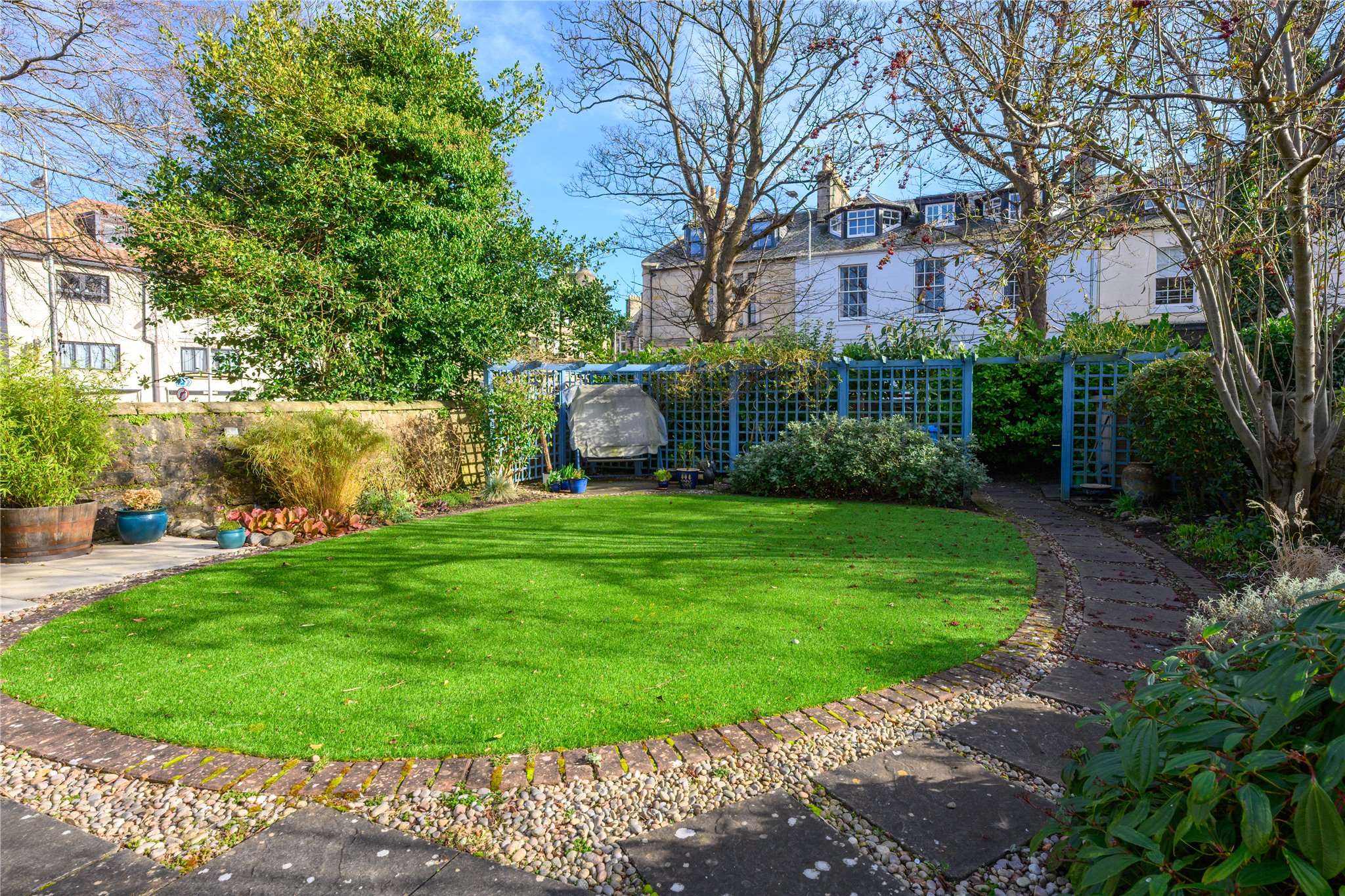 To the rear, the conservatory opens out onto a paved terrace, leading to an Astroturf lawn surrounded by well-stocked borders and pathways. Two timber sheds provide practical storage, while a trellis and established rhododendrons add seasonal colour and privacy. A further enclosed garden area includes a drying green and a small putting lawn, all bordered by traditional stone walls—offering a secure, peaceful outdoor space with charm and character. Both gardens have gates opening onto Greyfriars Garden leading directly into the town centre.
