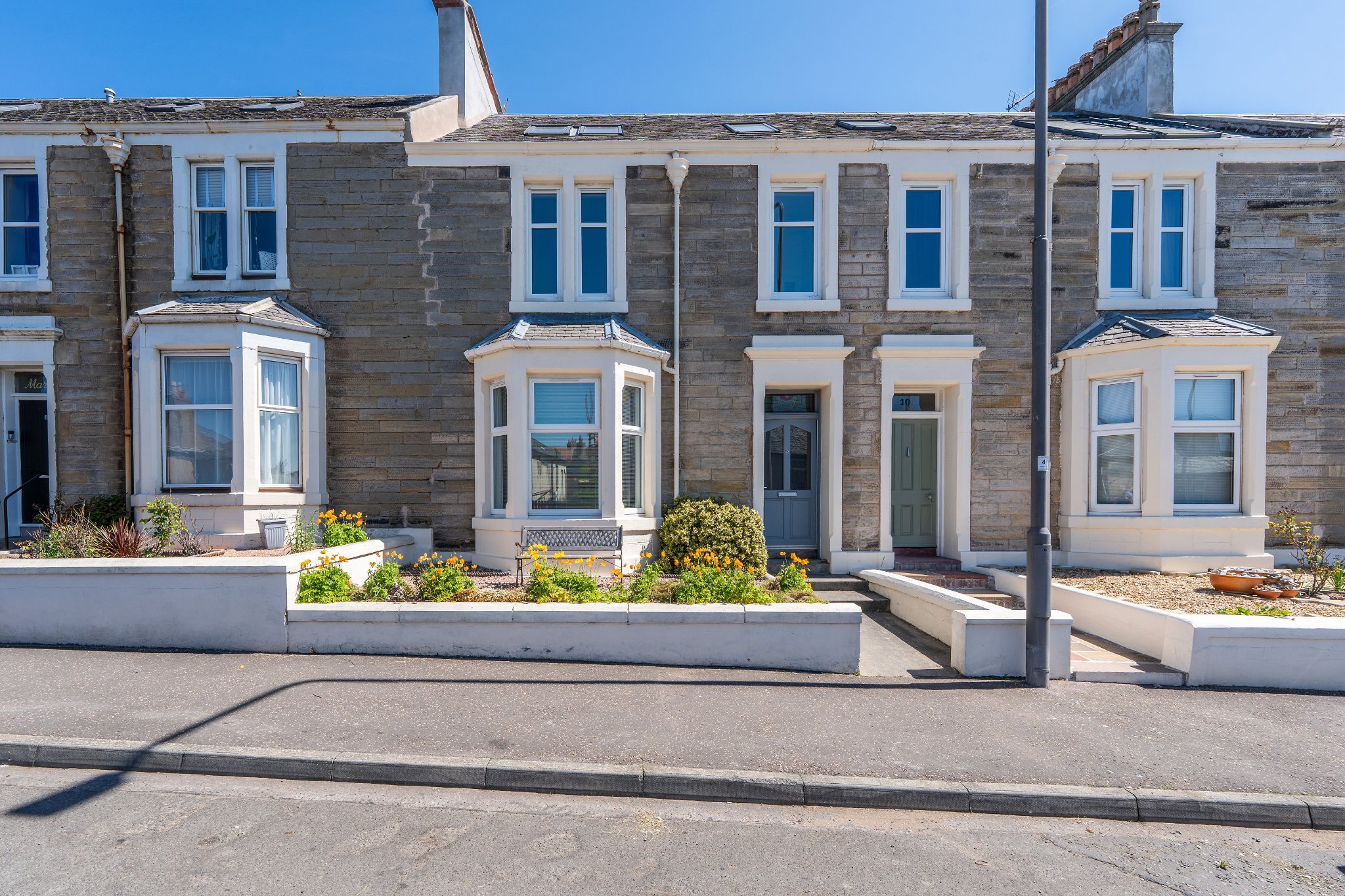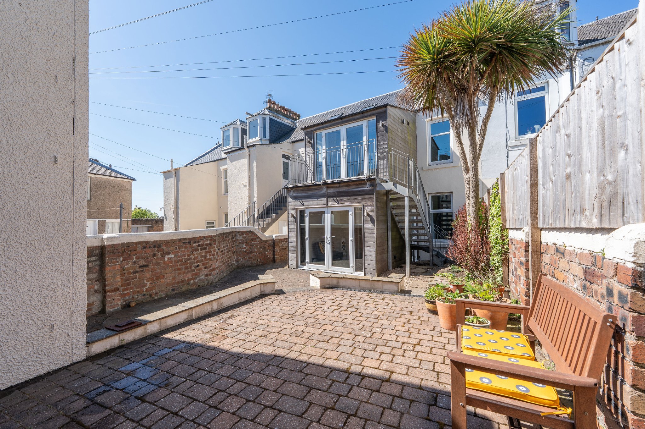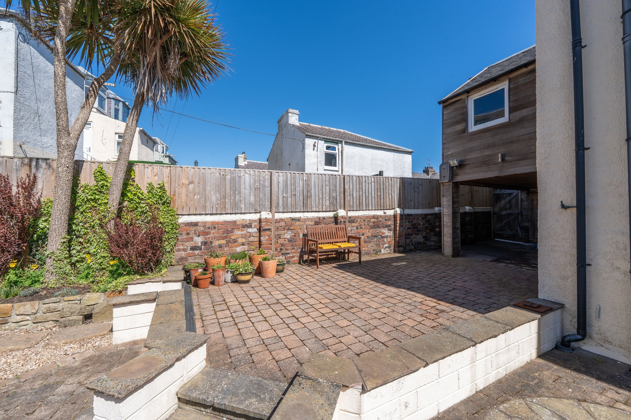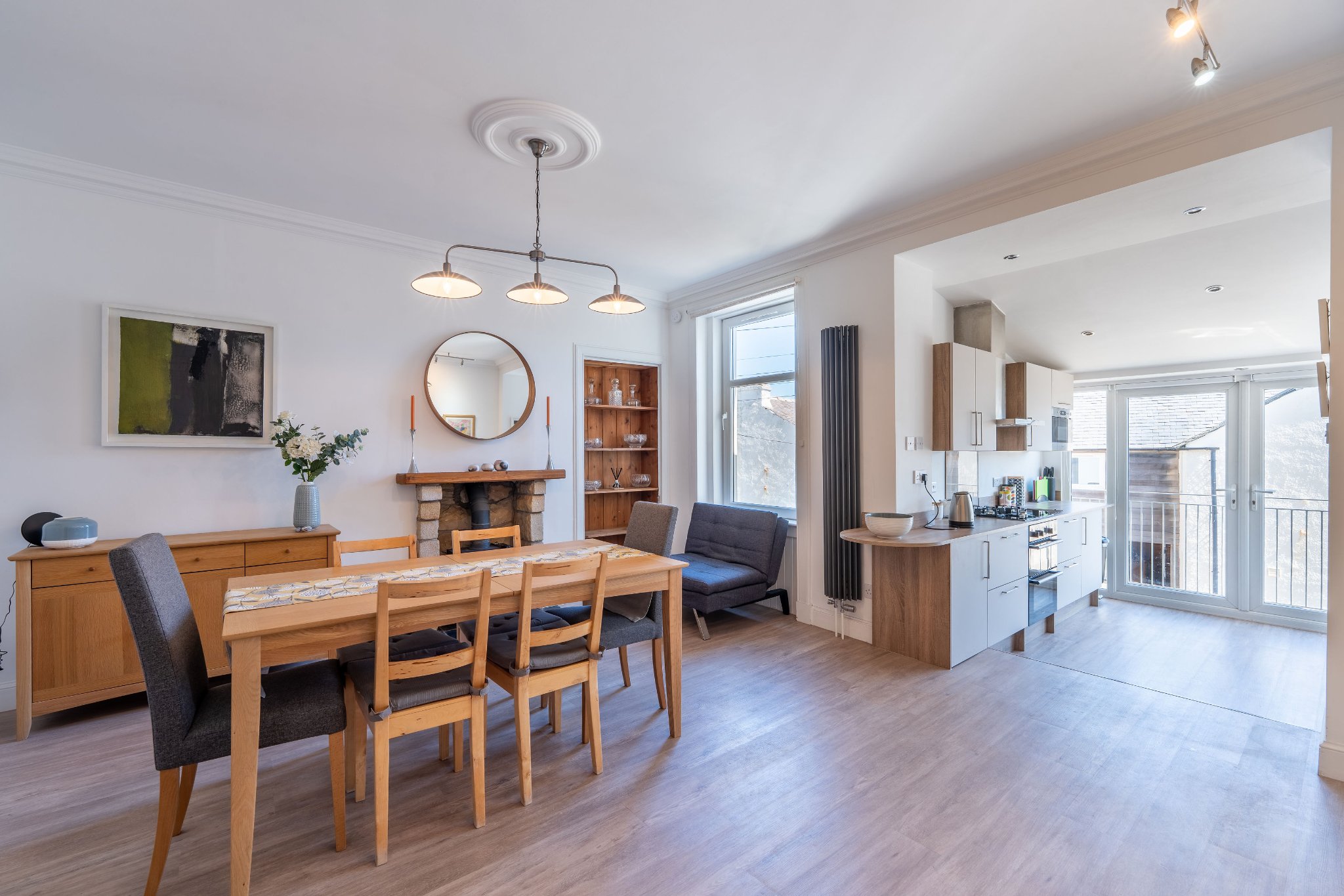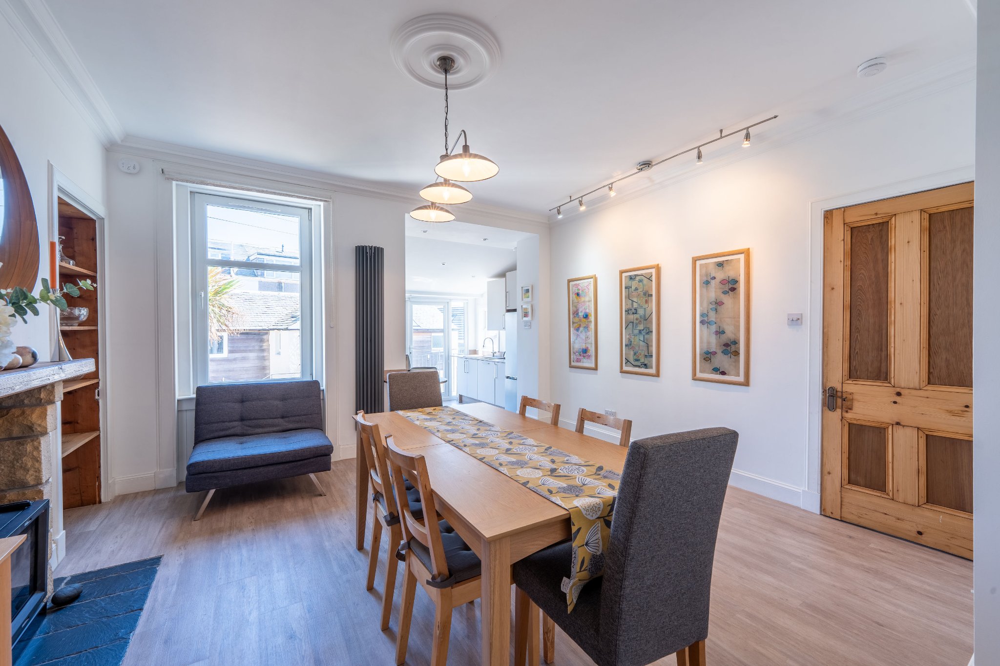 Set within a handsome terrace in the picturesque East Neuk village of Anstruther, just moments from the scenic harbour and coastline, this charming four-bedroom home with a self-contained one-bedroom annexe and gardens offers a comfortable modern family lifestyle in an idyllic setting. A traditional low-walled front garden with decorative stone detailing creates an inviting first impression and leads you to the entrance vestibule and hall equipped with useful storage. To the left, a bay-windowed double bedroom features elegant wooden flooring, an original tiled fireplace with brass hood, a built-in press, and cornicing. Continuing down the hall, a second bright double bedroom to the rear is followed by a utility that opens into a beautifully light-filled sitting room/bedroom with direct access to the south-west-facing rear courtyard garden. A sleek modern shower room with a washbasin built into vanity, and a WC completes the ground floor. On the first floor, a spectacular kitchen and dining room awaits. Bathed in natural light, the contemporary kitchen is appointed with wall and floor cabinetry, wood-effect worktops, and a full suite of high-end Hotpoint appliances, including a microwave, gas hob, grill, oven, fridge/freezer, and extractor hood. A south-west-facing balcony offers a delightful place to relax and leads via steps to the rear courtyard garden. Adjoining, the generous dining room is made for gatherings with a central log-burning stove, built-in press, wooden floors, and a neutral décor. Across the landing, an impressive shower room and a third light and airy double bedroom with built-in storage and a separate dressing room round off the floor. Upstairs, the entire attic has been transformed into a stunning living room. With exposed beams, wooden flooring, and a cosy log-burning stove set within an oak mantle, this expansive and light-filled space enjoys partial views over to the harbour. An adjacent skylit bathroom adds a touch of indulgence with its freestanding bath, countertop washbasin, and a hidden cistern WC.