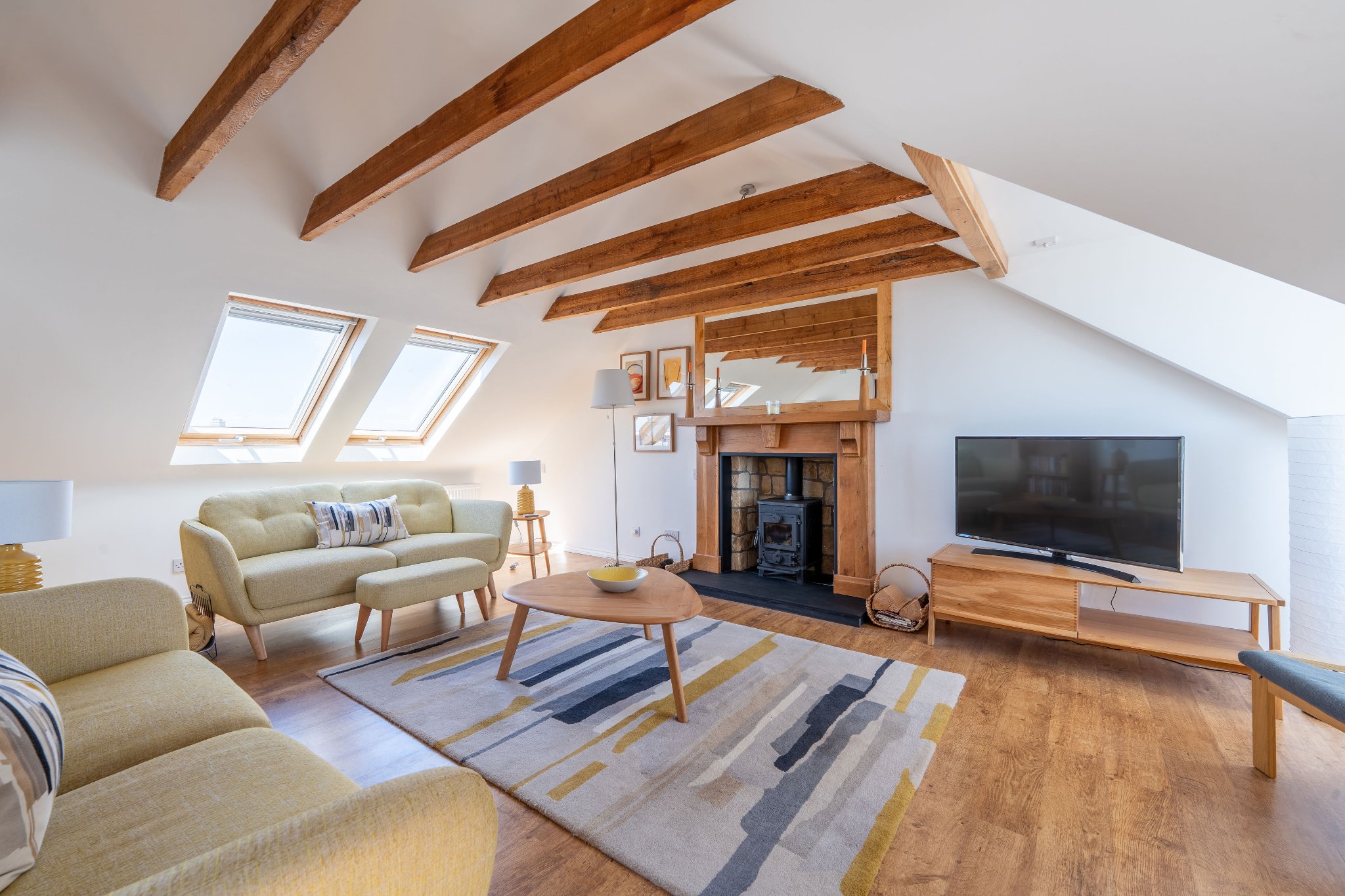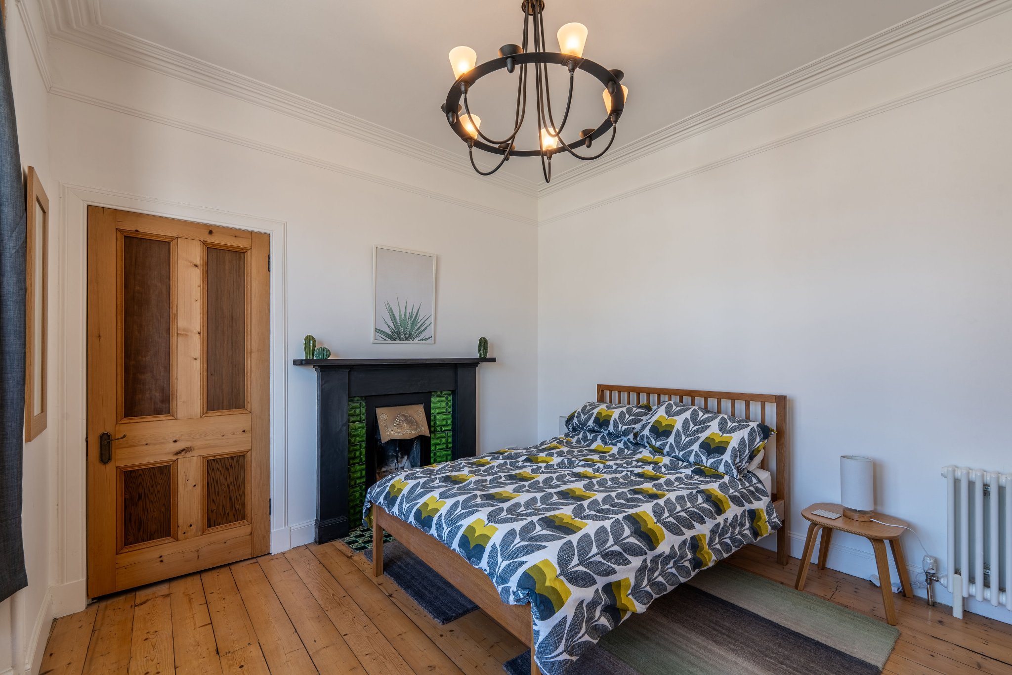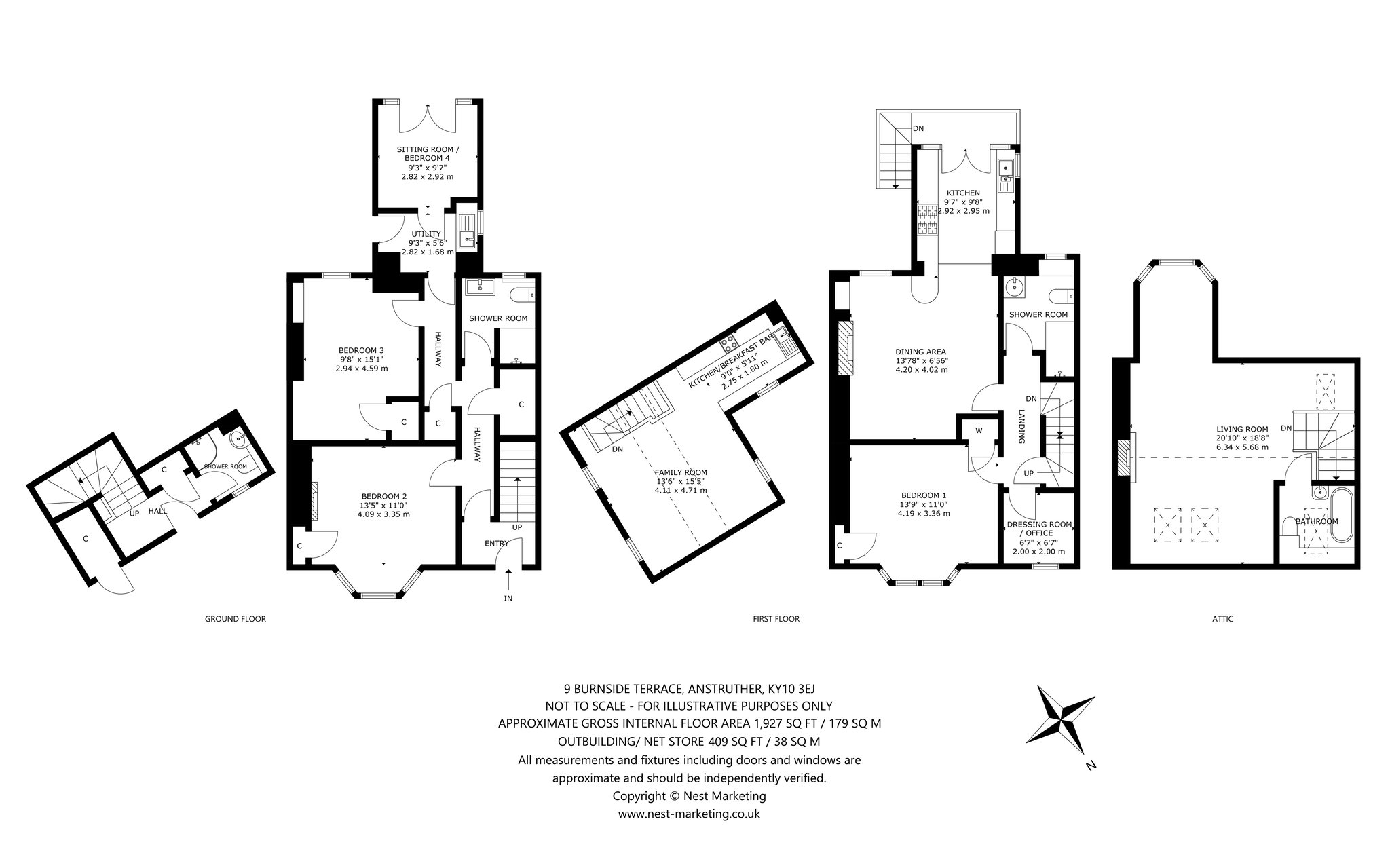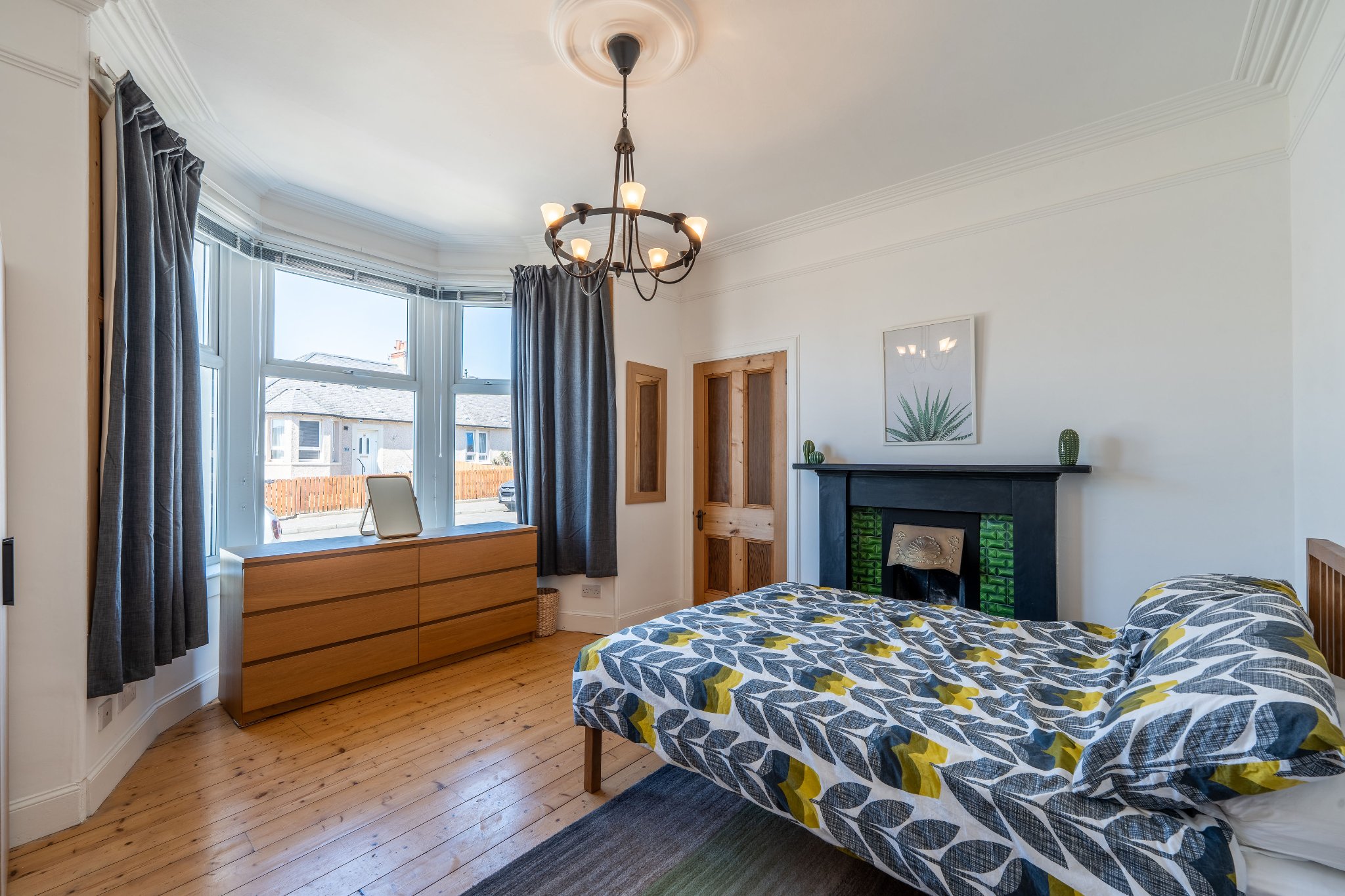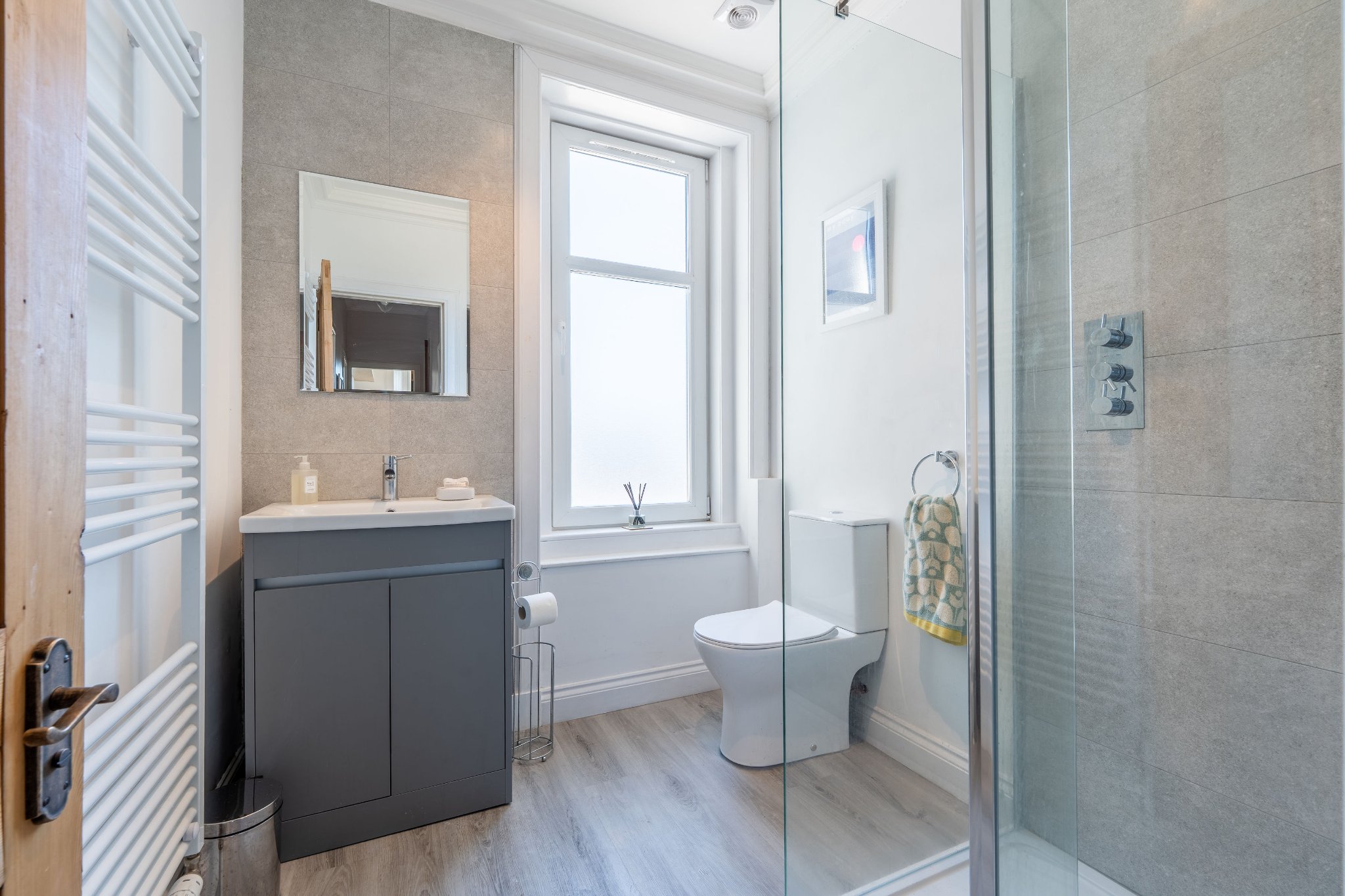 Set within a handsome terrace in the picturesque East Neuk village of Anstruther, just moments from the scenic harbour and coastline, this charming four-bedroom home with a self-contained one-bedroom annexe and gardens offers a comfortable modern family lifestyle in an idyllic setting. A traditional low-walled front garden with decorative stone detailing creates an inviting first impression and leads you to the entrance vestibule and hall equipped with useful storage. To the left, a bay-windowed double bedroom features elegant wooden flooring, an original tiled fireplace with brass hood, a built-in press, and cornicing. Continuing down the hall, a second bright double bedroom to the rear is followed by a utility that opens into a beautifully light-filled sitting room/bedroom with direct access to the south-west-facing rear courtyard garden. A sleek modern shower room with a washbasin built into vanity, and a WC completes the ground floor. On the first floor, a spectacular kitchen and dining room awaits. Bathed in natural light, the contemporary kitchen is appointed with wall and floor cabinetry, wood-effect worktops, and a full suite of high-end Hotpoint appliances, including a microwave, gas hob, grill, oven, fridge/freezer, and extractor hood. A south-west-facing balcony offers a delightful place to relax and leads via steps to the rear courtyard garden. Adjoining, the generous dining room is made for gatherings with a central log-burning stove, built-in press, wooden floors, and a neutral décor. Across the landing, an impressive shower room and a third light and airy double bedroom with built-in storage and a separate dressing room round off the floor. Upstairs, the entire attic has been transformed into a stunning living room. With exposed beams, wooden flooring, and a cosy log-burning stove set within an oak mantle, this expansive and light-filled space enjoys partial views over to the harbour. An adjacent skylit bathroom adds a touch of indulgence with its freestanding bath, countertop washbasin, and a hidden cistern WC.