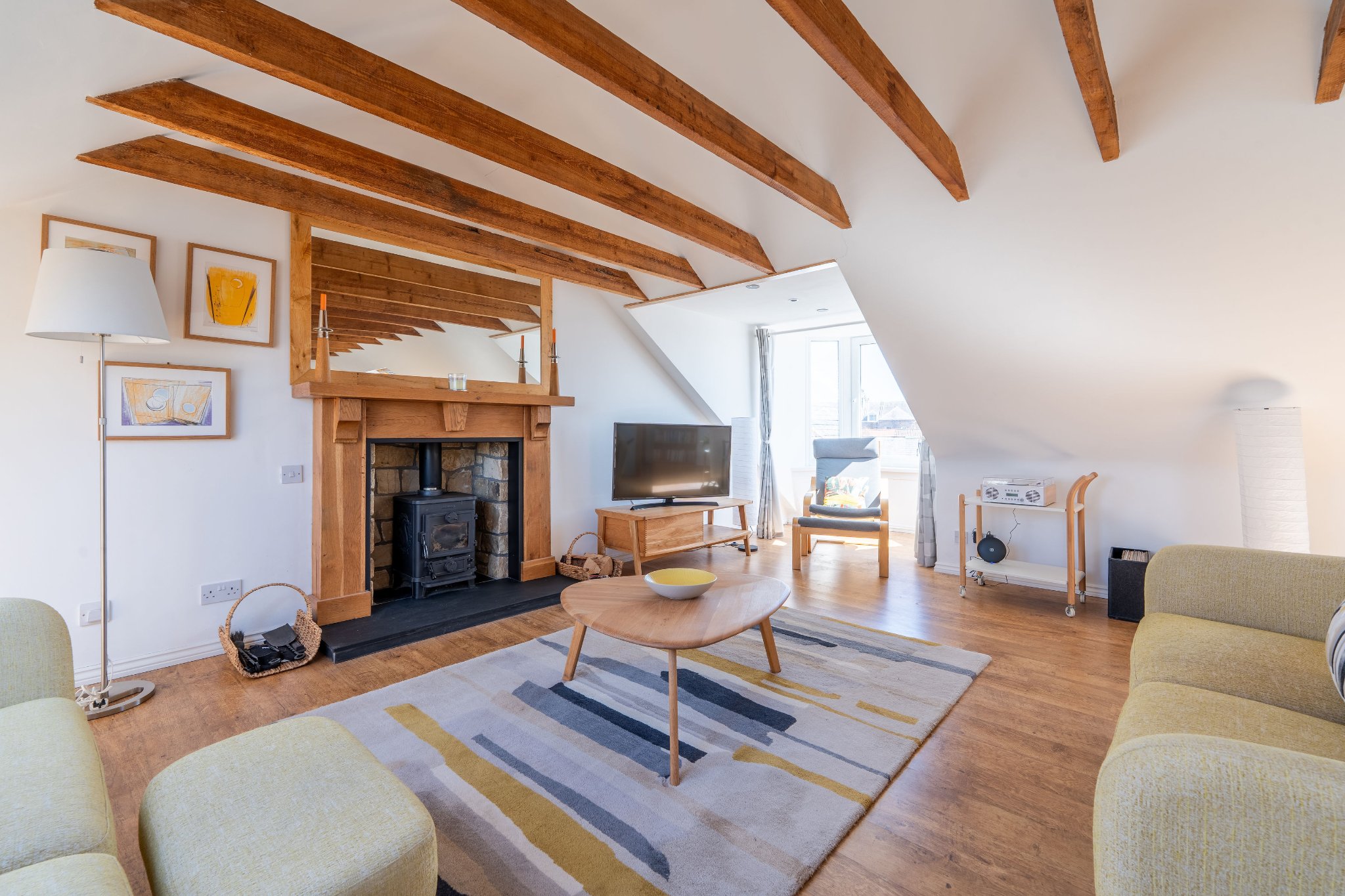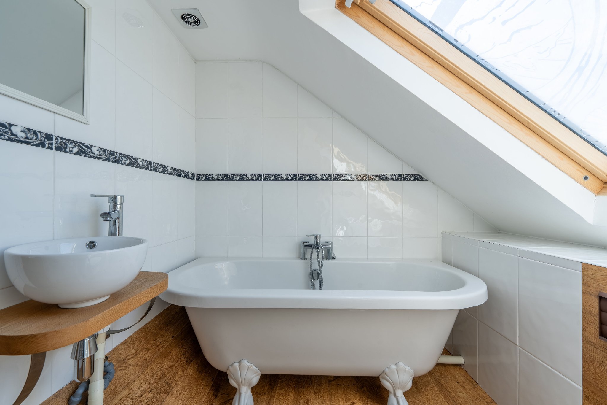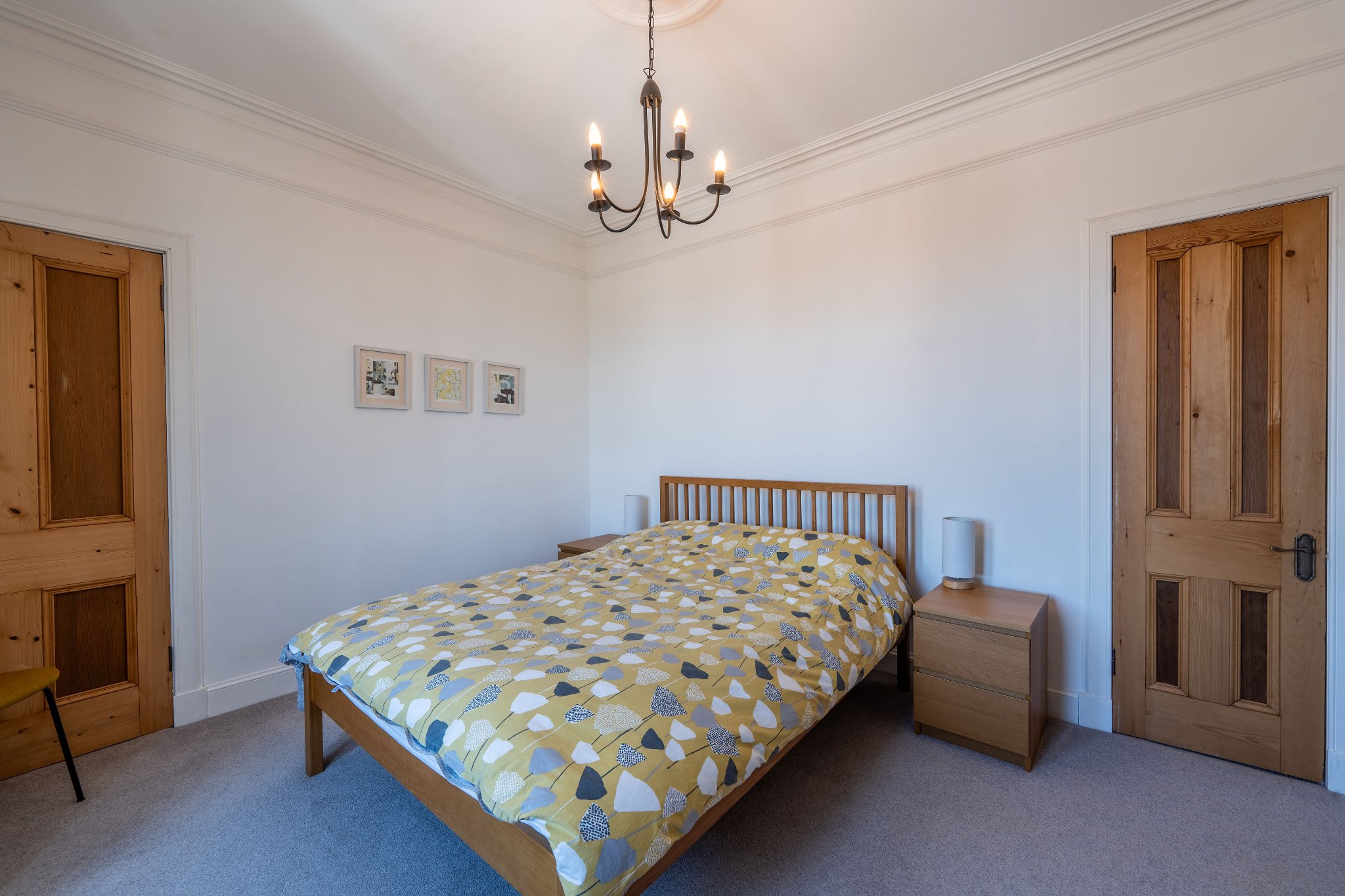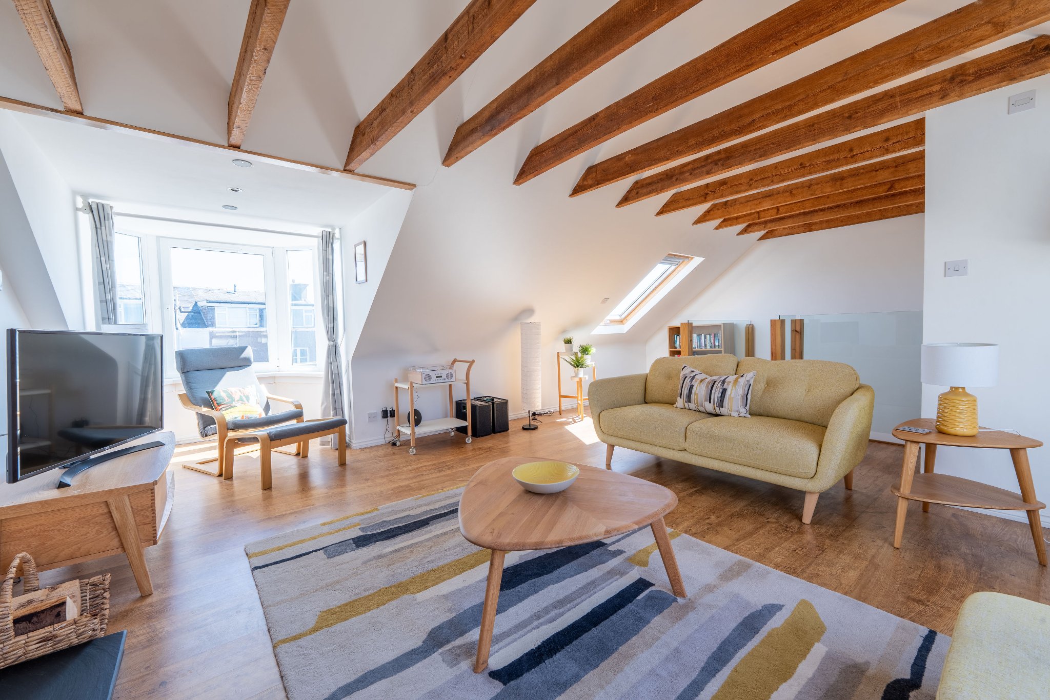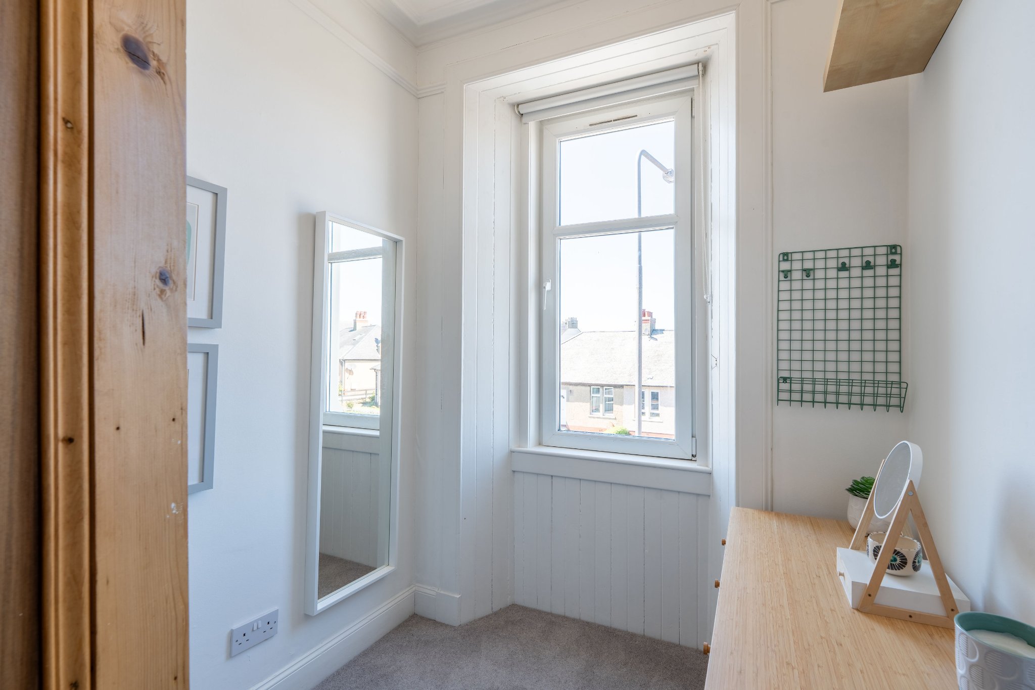 Set within a handsome terrace in the picturesque East Neuk village of Anstruther, just moments from the scenic harbour and coastline, this charming four-bedroom home with a self-contained one-bedroom annexe and gardens offers a comfortable modern family lifestyle in an idyllic setting. A traditional low-walled front garden with decorative stone detailing creates an inviting first impression and leads you to the entrance vestibule and hall equipped with useful storage. To the left, a bay-windowed double bedroom features elegant wooden flooring, an original tiled fireplace with brass hood, a built-in press, and cornicing. Continuing down the hall, a second bright double bedroom to the rear is followed by a utility that opens into a beautifully light-filled sitting room/bedroom with direct access to the south-west-facing rear courtyard garden. A sleek modern shower room with a washbasin built into vanity, and a WC completes the ground floor. On the first floor, a spectacular kitchen and dining room awaits. Bathed in natural light, the contemporary kitchen is appointed with wall and floor cabinetry, wood-effect worktops, and a full suite of high-end Hotpoint appliances, including a microwave, gas hob, grill, oven, fridge/freezer, and extractor hood. A south-west-facing balcony offers a delightful place to relax and leads via steps to the rear courtyard garden. Adjoining, the generous dining room is made for gatherings with a central log-burning stove, built-in press, wooden floors, and a neutral décor. Across the landing, an impressive shower room and a third light and airy double bedroom with built-in storage and a separate dressing room round off the floor. Upstairs, the entire attic has been transformed into a stunning living room. With exposed beams, wooden flooring, and a cosy log-burning stove set within an oak mantle, this expansive and light-filled space enjoys partial views over to the harbour. An adjacent skylit bathroom adds a touch of indulgence with its freestanding bath, countertop washbasin, and a hidden cistern WC.