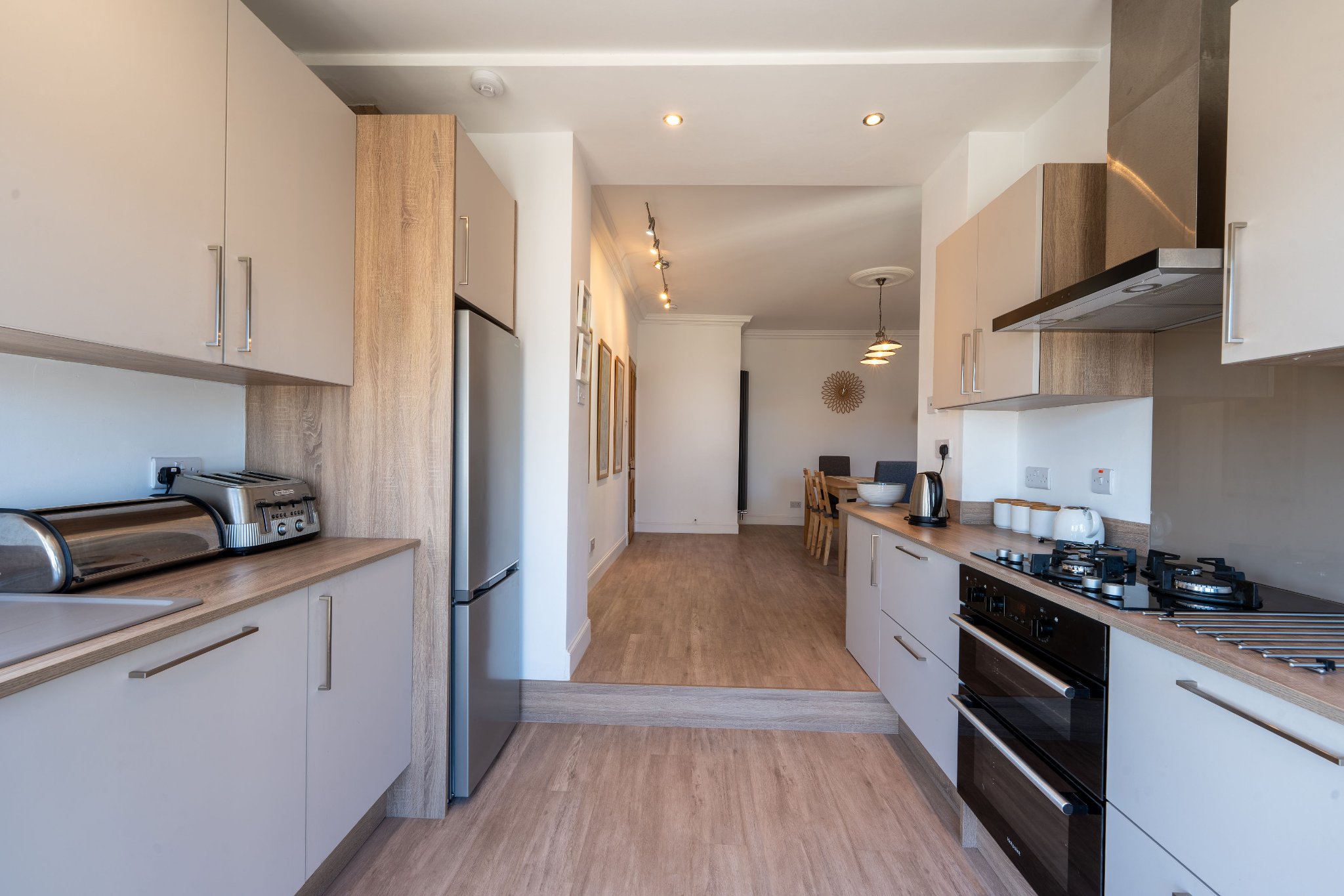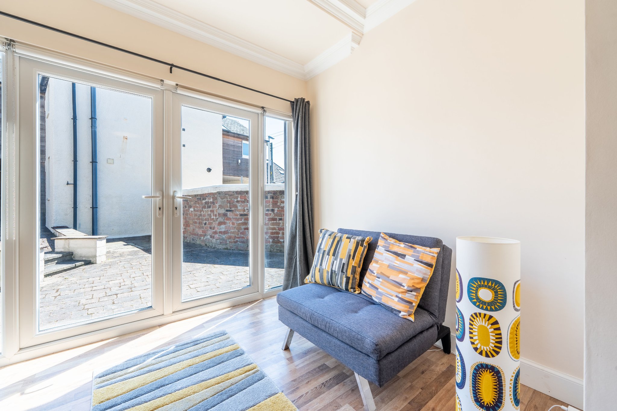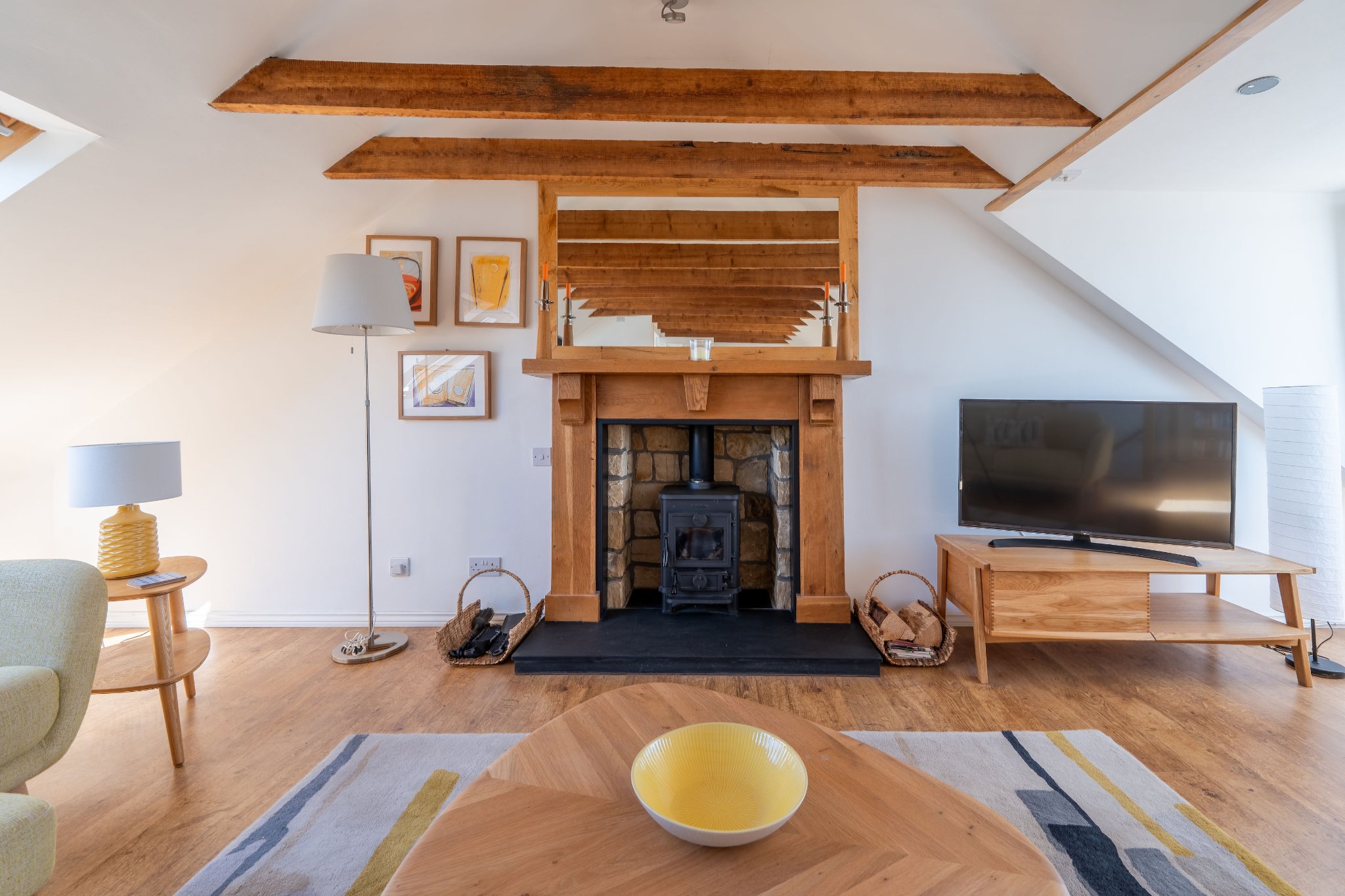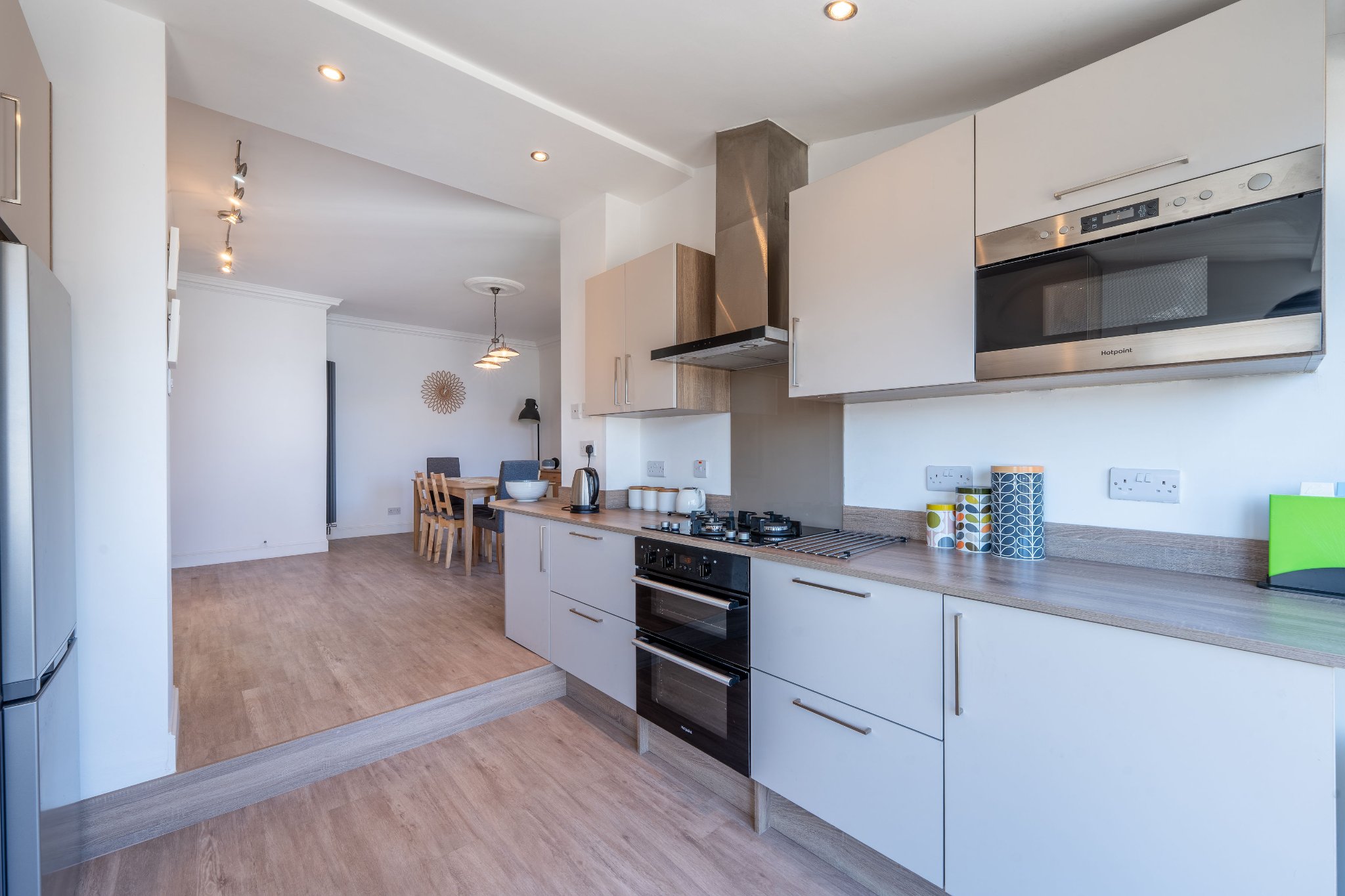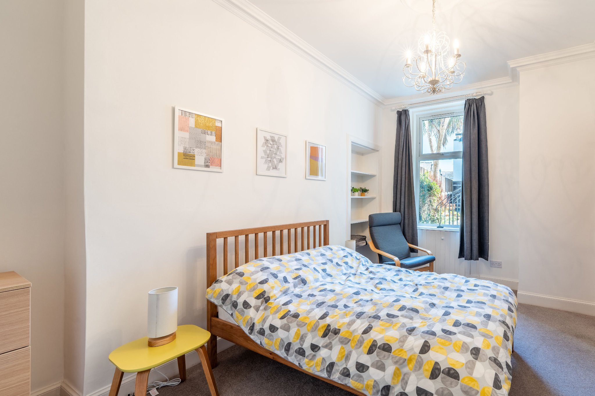 Set within a handsome terrace in the picturesque East Neuk village of Anstruther, just moments from the scenic harbour and coastline, this charming four-bedroom home with a self-contained one-bedroom annexe and gardens offers a comfortable modern family lifestyle in an idyllic setting. A traditional low-walled front garden with decorative stone detailing creates an inviting first impression and leads you to the entrance vestibule and hall equipped with useful storage. To the left, a bay-windowed double bedroom features elegant wooden flooring, an original tiled fireplace with brass hood, a built-in press, and cornicing. Continuing down the hall, a second bright double bedroom to the rear is followed by a utility that opens into a beautifully light-filled sitting room/bedroom with direct access to the south-west-facing rear courtyard garden. A sleek modern shower room with a washbasin built into vanity, and a WC completes the ground floor. On the first floor, a spectacular kitchen and dining room awaits. Bathed in natural light, the contemporary kitchen is appointed with wall and floor cabinetry, wood-effect worktops, and a full suite of high-end Hotpoint appliances, including a microwave, gas hob, grill, oven, fridge/freezer, and extractor hood. A south-west-facing balcony offers a delightful place to relax and leads via steps to the rear courtyard garden. Adjoining, the generous dining room is made for gatherings with a central log-burning stove, built-in press, wooden floors, and a neutral décor. Across the landing, an impressive shower room and a third light and airy double bedroom with built-in storage and a separate dressing room round off the floor. Upstairs, the entire attic has been transformed into a stunning living room. With exposed beams, wooden flooring, and a cosy log-burning stove set within an oak mantle, this expansive and light-filled space enjoys partial views over to the harbour. An adjacent skylit bathroom adds a touch of indulgence with its freestanding bath, countertop washbasin, and a hidden cistern WC.