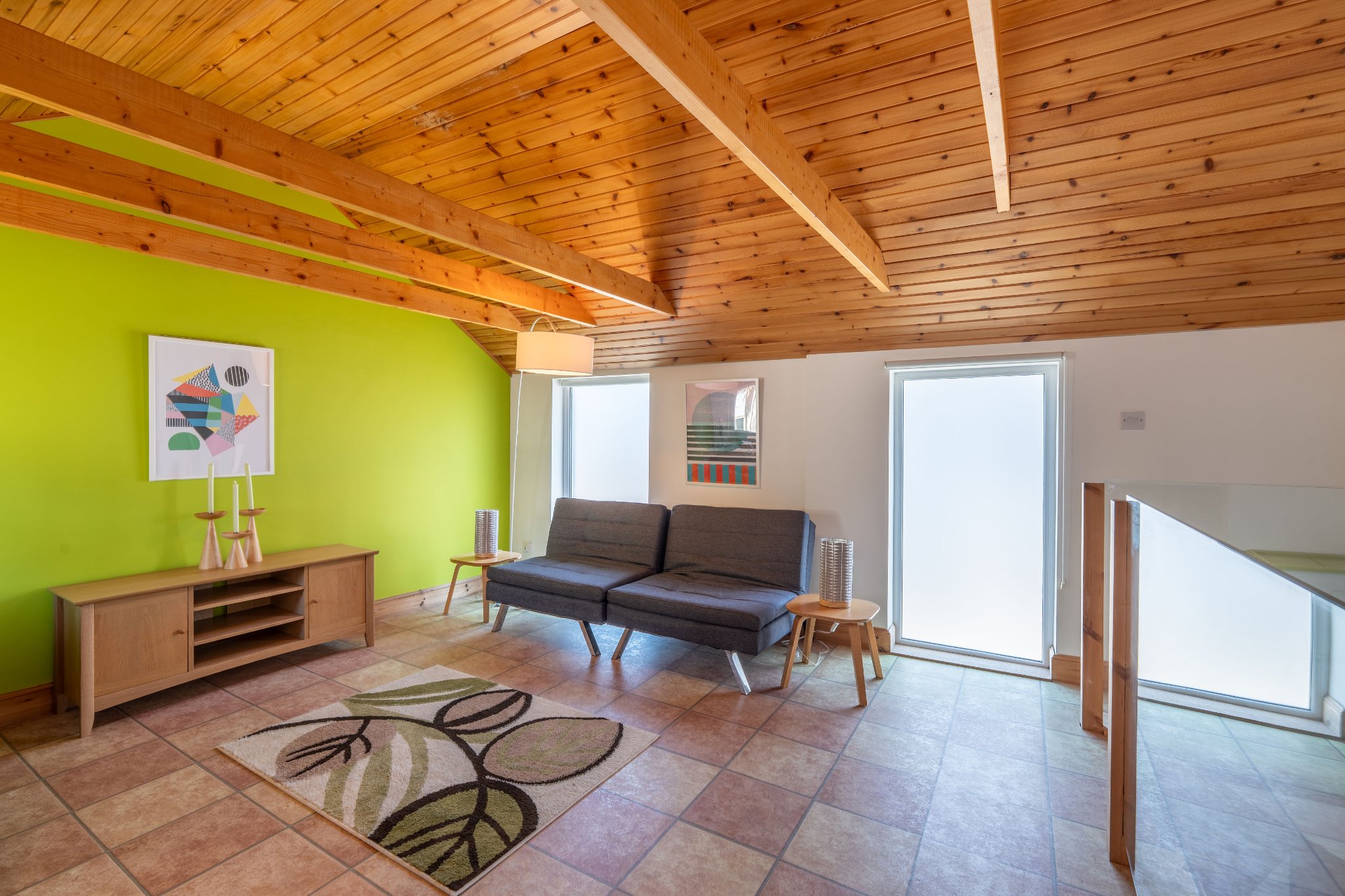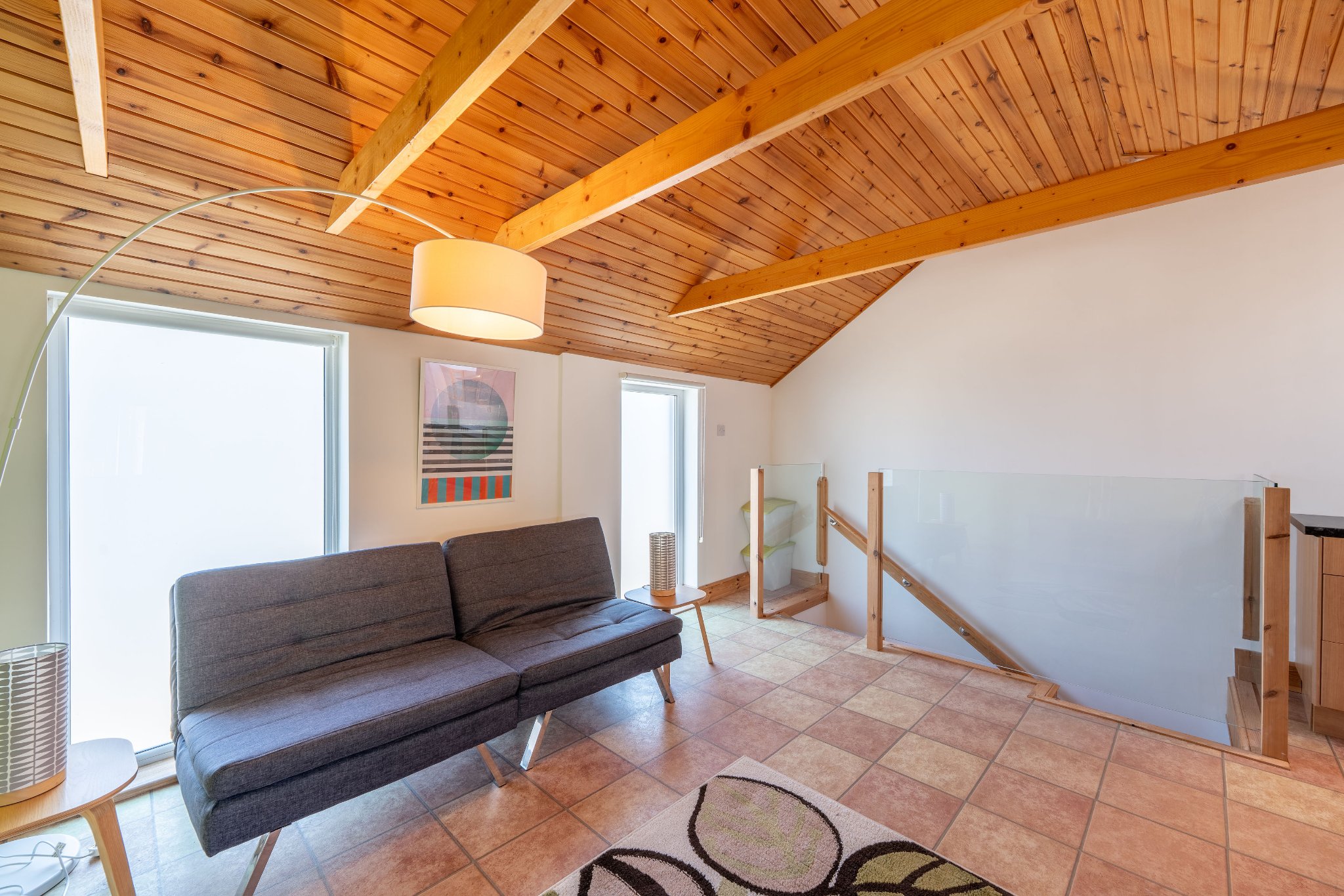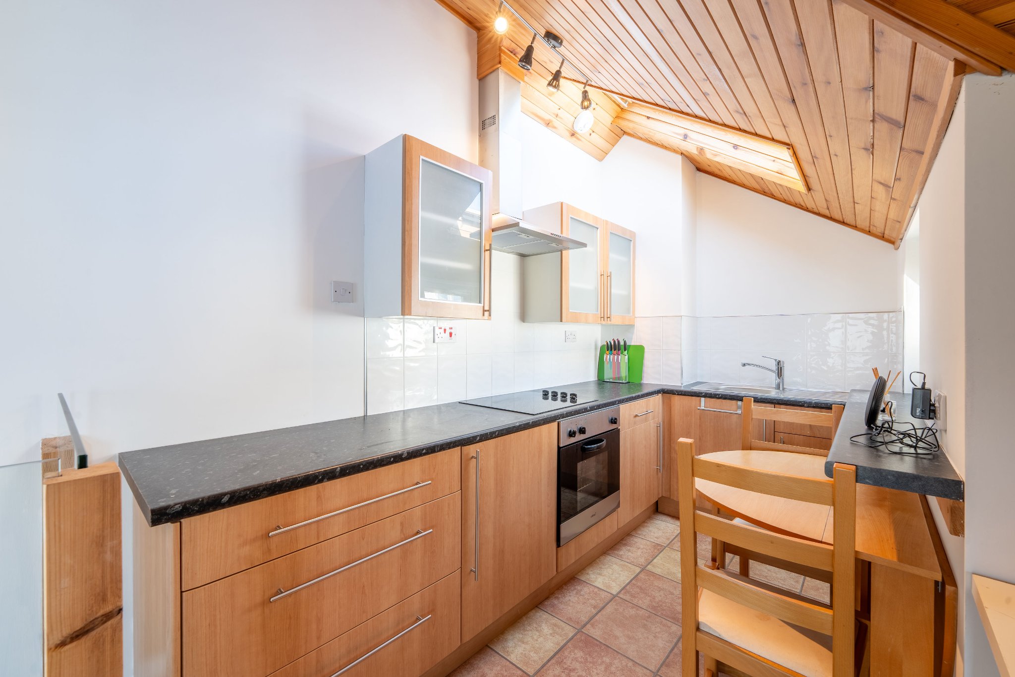 Perfect for hosting guests, family, or as a separate holiday let, the two-storey annexe at the foot of the garden offers modern, flexible accommodation. Entering the hallway, you’ll find a sleek shower room with a hidden-cistern WC and washbasin built into vanity. Upstairs, a generous living room/bedroom enjoys an east-west-facing orientation and leads into a breakfasting kitchen. Fitted with wood-effect and glass-fronted cabinetry, black quartz-effect worktops, and integrated appliances including a hob, oven, and extractor hood, the kitchen showcases a well-appointed design.