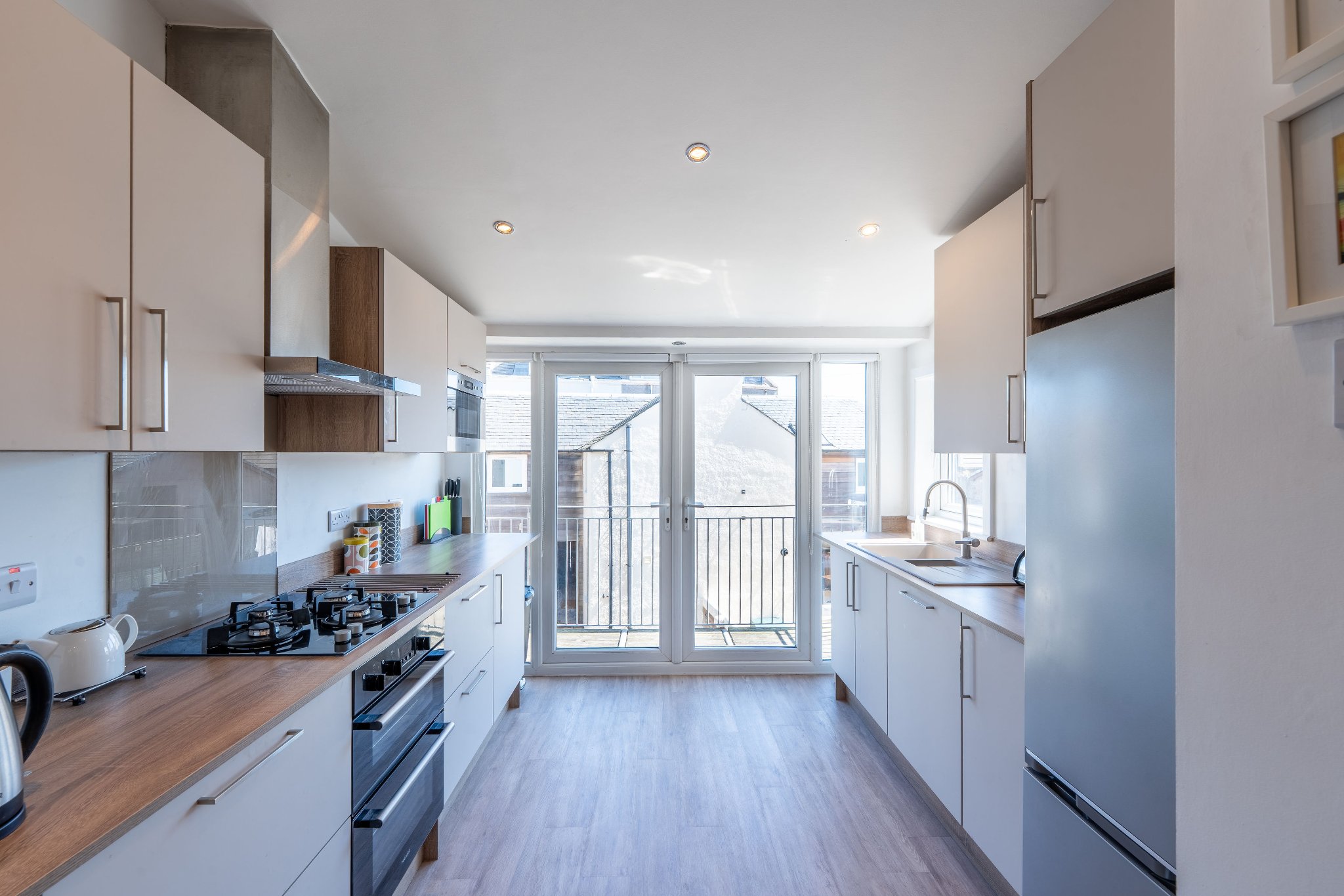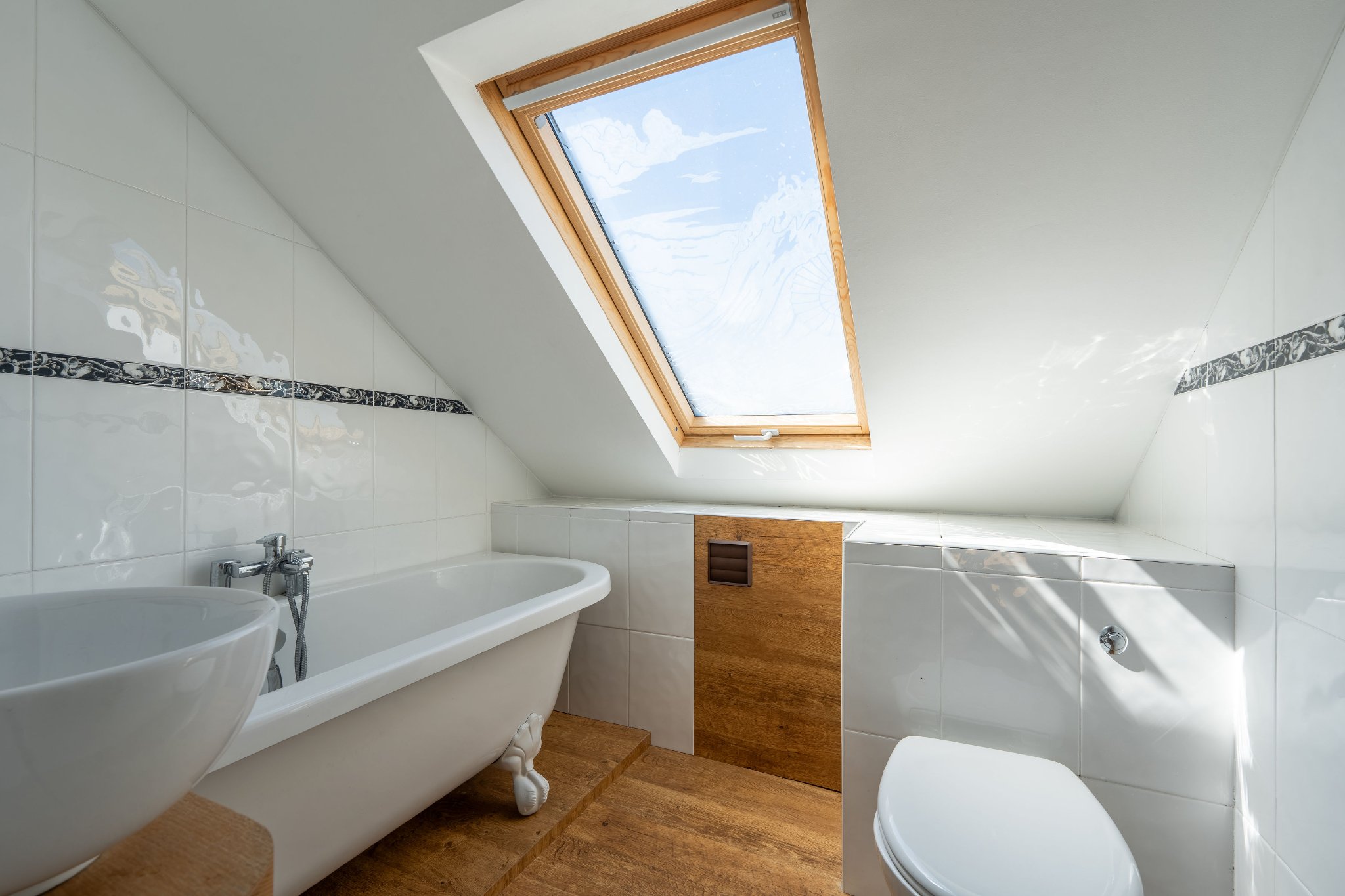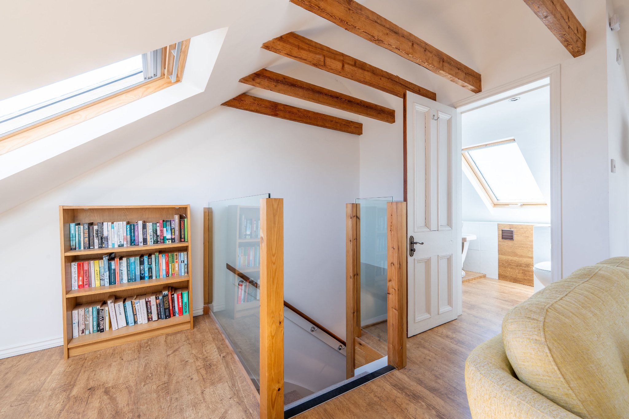 Perfect for hosting guests, family, or as a separate holiday let, the two-storey annexe at the foot of the garden offers modern, flexible accommodation. Entering the hallway, you’ll find a sleek shower room with a hidden-cistern WC and washbasin built into vanity. Upstairs, a generous living room/bedroom enjoys an east-west-facing orientation and leads into a breakfasting kitchen. Fitted with wood-effect and glass-fronted cabinetry, black quartz-effect worktops, and integrated appliances including a hob, oven, and extractor hood, the kitchen showcases a well-appointed design.