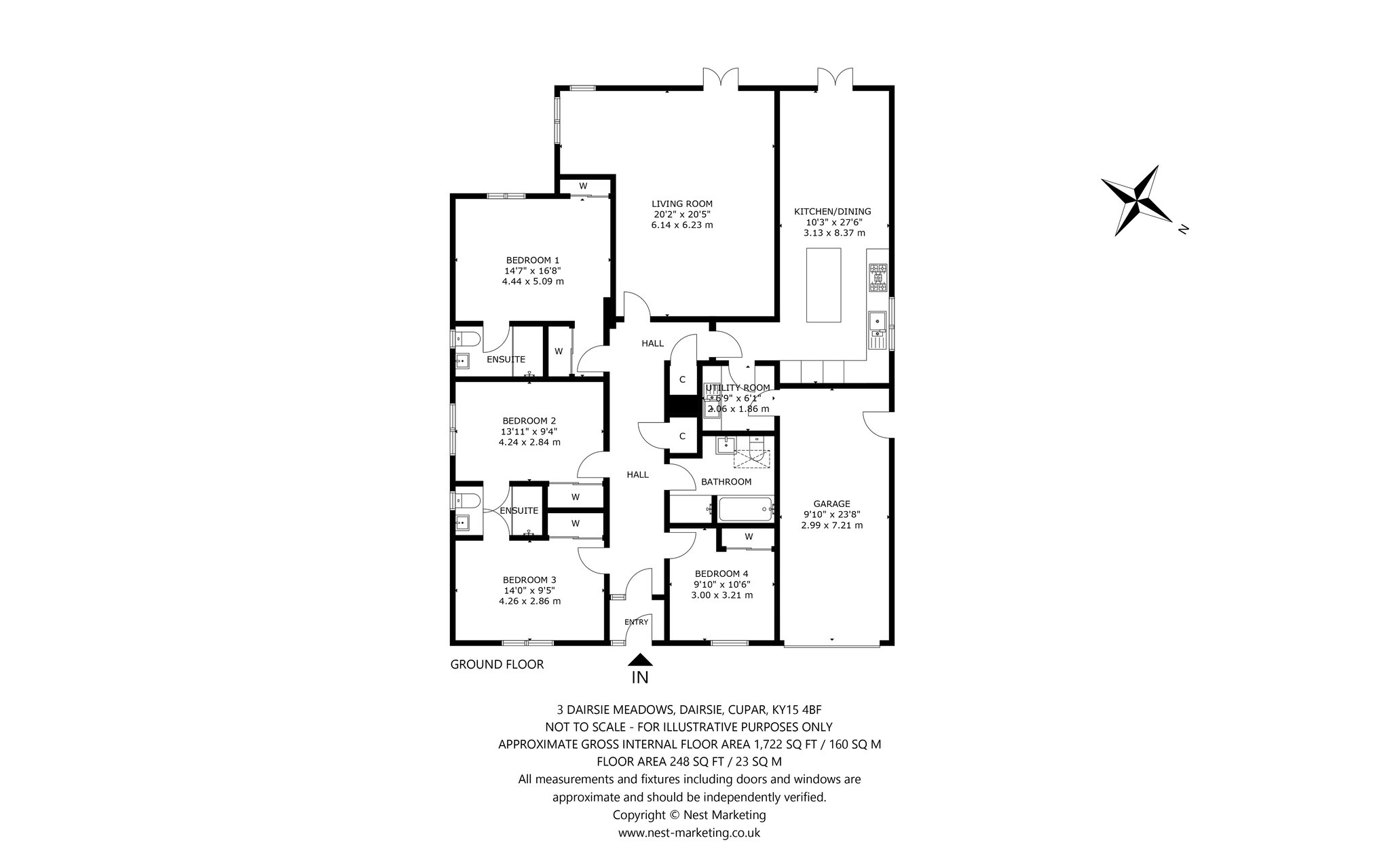 Forming part of an exclusive development in the idyllic village of Dairsie, this four-bedroom bungalow offers a rare opportunity, showcasing high-spec finishes, exceptional attention to detail, and a bright, spacious layout designed for modern living. With hardwood flooring and a chic interior design, the entrance vestibule creates a striking first impression, setting the tone for the stylish accommodation beyond. From here, you enter a carpeted hallway that leads to a generously proportioned, south-west-facing living room. Bathed in natural light and offering captivating countryside views, this inviting space seamlessly blends indoor and outdoor living with French doors opening directly onto the garden. Plush carpeting, a statement accent wall, and a crisp, modern colour palette enhance the ambience, making it the perfect setting for everyday living, relaxation, and entertaining. Returning to the hallway, the contemporary kitchen is a true highlight. Bright and airy, with French doors leading to the garden, the space features an appealing décor including Amtico flooring and a comfortable seating area. A central breakfast bar anchors the room, surrounded by sleek, under-base-lit cabinetry in natural tones paired with high-gloss white finishes and smooth stone countertops. High-spec integrated appliances include a five-ring gas hob, oven, and eye-level grill, all add to the kitchen’s premium feel and there is a laundry room for additional storage. The principal double bedroom is a luxurious retreat, with an elegant interior scheme, a south-west-facing aspect, and built-in mirrored wardrobes. It is further enhanced by a spa-like en-suite shower room, showcasing a WC, wall-hung vanity with washbasin, and a chrome towel radiator, all set against high-quality tiling. Three additional double bedrooms offer equally impressive accommodation, each with built-in mirrored wardrobes and two sharing an en-suite shower room with high-end finishes that echo the principal suite’s refined style. Completing the layout is a serene and skylit family bathroom, featuring a bath, shower enclosure, WC, and washbasin set into a wall-hung vanity unit. Framed by premium porcelain tiling, this spa-inspired space adds the perfect final touch to this outstanding home.