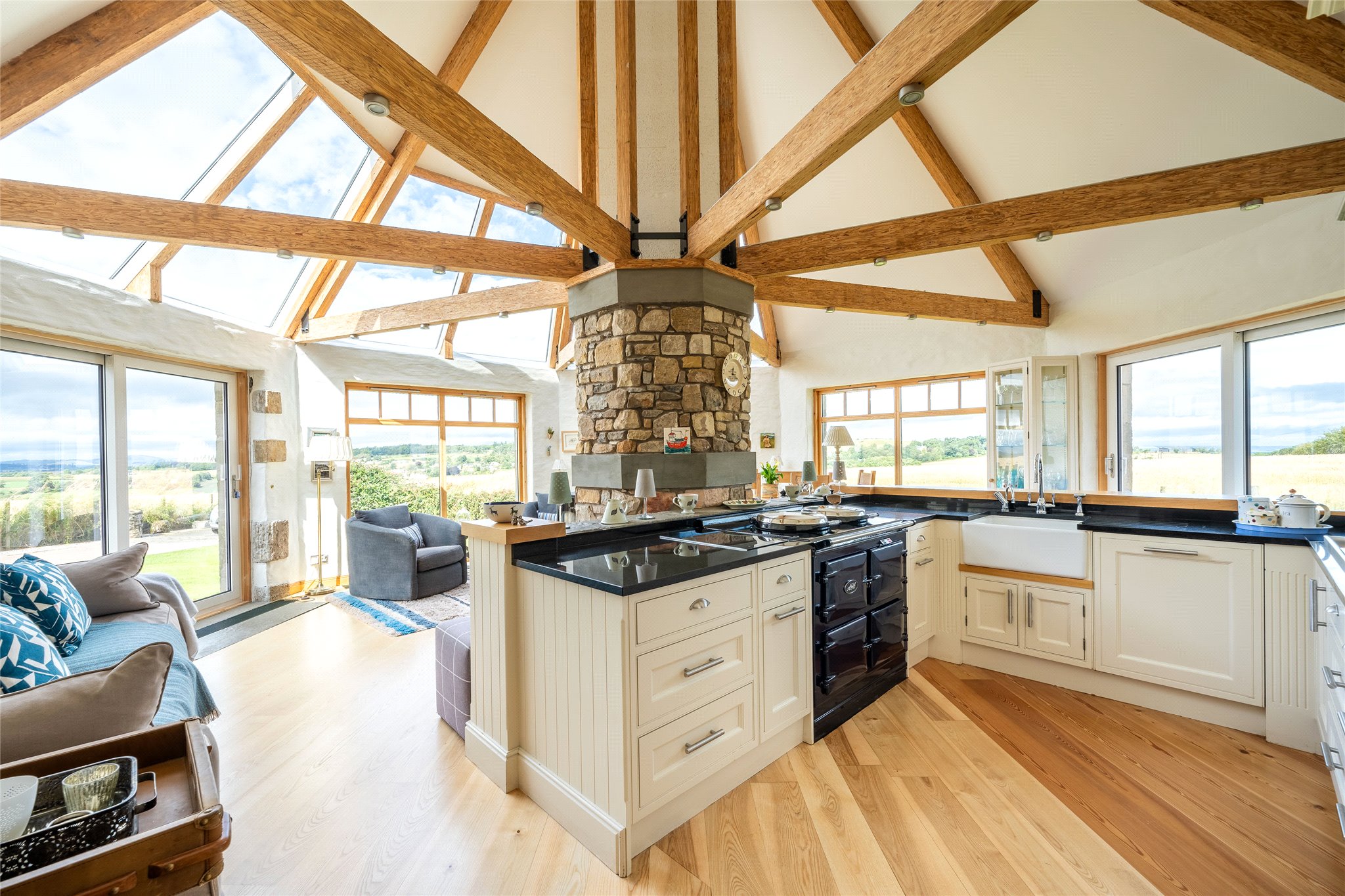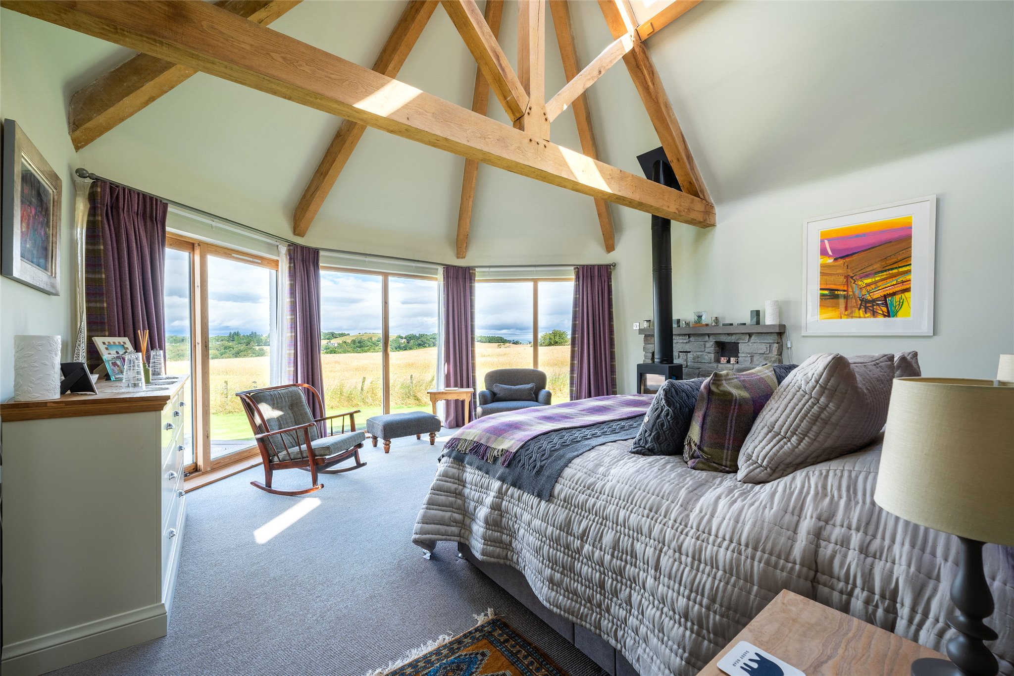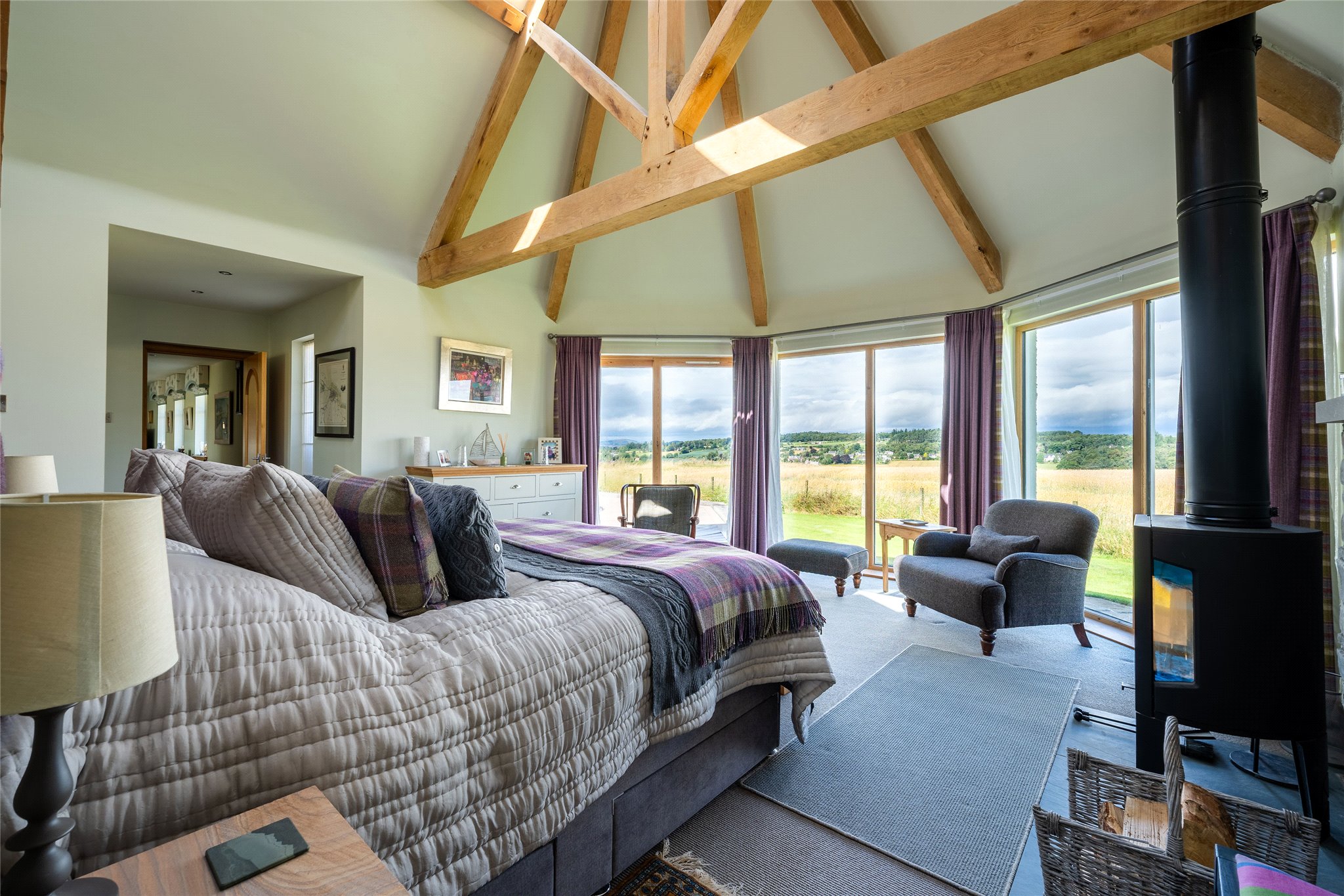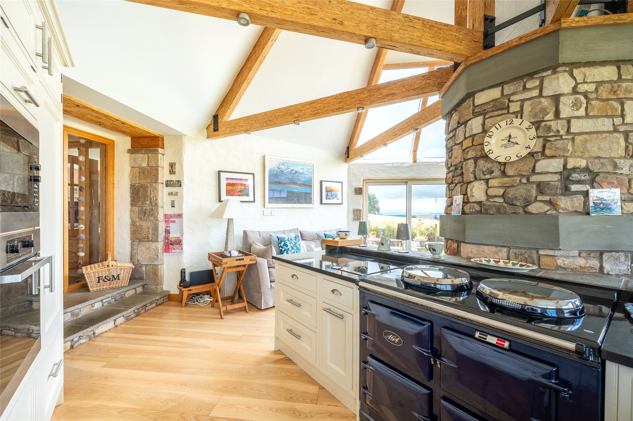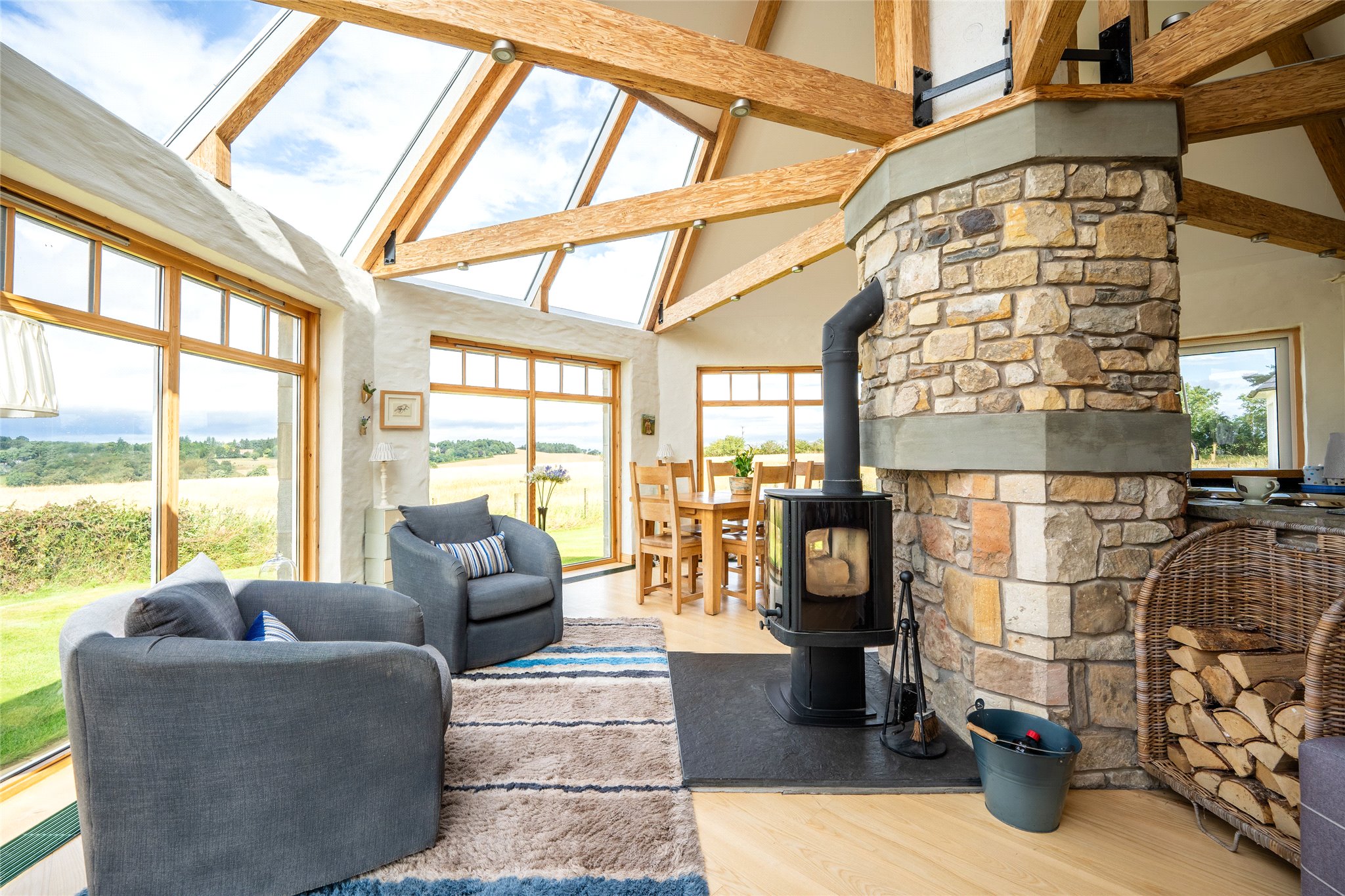 Enveloped in picturesque open countryside, St Andrews Wells lying on the pilgrim route to St Andrews, was sympathetically converted from a former smiddy in 2000 to form a stunning family home and was further extended in 2012 by the current owners. Approached by a sweeping monoblock driveway, a neat lawn guides you to the semi-glazed timber front door and into the welcoming hallway adorned with high-quality Amtico flooring. From here an astragal door with side panel ushers you into a spectacular west-facing living room. Boasting a warm colour palette, plush Crucial Trading carpeting throughout the house, charming window seats, and an original stone fireplace housing a wood-burning stove it exudes warmth and comfort. Returning to the hallway, a spectacular roundel with garden access has been beautifully finished, to create an open kitchen, dining, and family room enjoying breathtaking countryside views. Showcasing a stone column with a wood-burning stove, ash flooring, and a vaulted ceiling with exposed beams and LED lights this light-filled space perfectly balances modern living with rustic charm. The bespoke handcrafted kitchen by David L Douglas of Cairneyhill, Fife, a three oven electric Aga, a Quooker hot tap, Belfast sink, and a full suite of integrated Miele appliances including a dishwasher, Miele fan oven and grill, and microwave. A breakfast bar allows for comfortable informal dining. Featuring a Belfast sink, washing machine and tumble dryer a useful utility ensures the kitchen remains streamlined. A second carpeted hallway flooded with natural light leads to the magnificent principal double bedroom. Lying beneath a vaulted ceiling with beautiful French oak beams this luxurious room features a wood-burning stove, a feature wall with inglenooks, and captivating open countryside views. It is complemented by a separate dressing area with a built-in walnut dressing table and cupboard space, three double mirrored wardrobes, and a stunning en-suite bathroom. The spa-like en-suite includes a large double-ended Porcelanosa bath, a shower, a Duravit double sink unit with built-in cupboards, underfloor heating, a heated towel rail, and tiling from Kirkstone Quarry in the Lake District. Completing the ground-floor are two south-facing double bedrooms one of which has been converted into a handsome bespoke study with two walnut workstations. The other has a charming outlook over the front garden to the original well and features a built-in double wardrobe. They share access to a design-led family bathroom featuring a Duravit bath with shower overhead, washbasin, WC, and porcelain floor tiles. Ascending the carpeted staircase with rope banister, the first-floor houses two light and airy double bedrooms boasting a delightful aspect of the rolling countryside. Thoughtfully designed they each benefit from a contemporary en-suite shower room with unique Phillipe Starck style washbasins, hidden cistern wall-hung WCs, Amtico flooring, and heated towel rails.