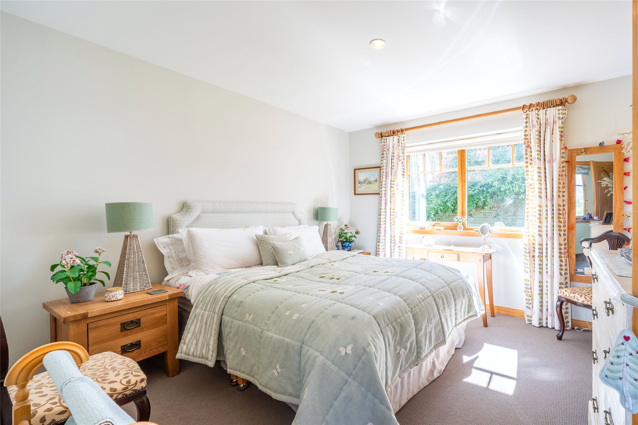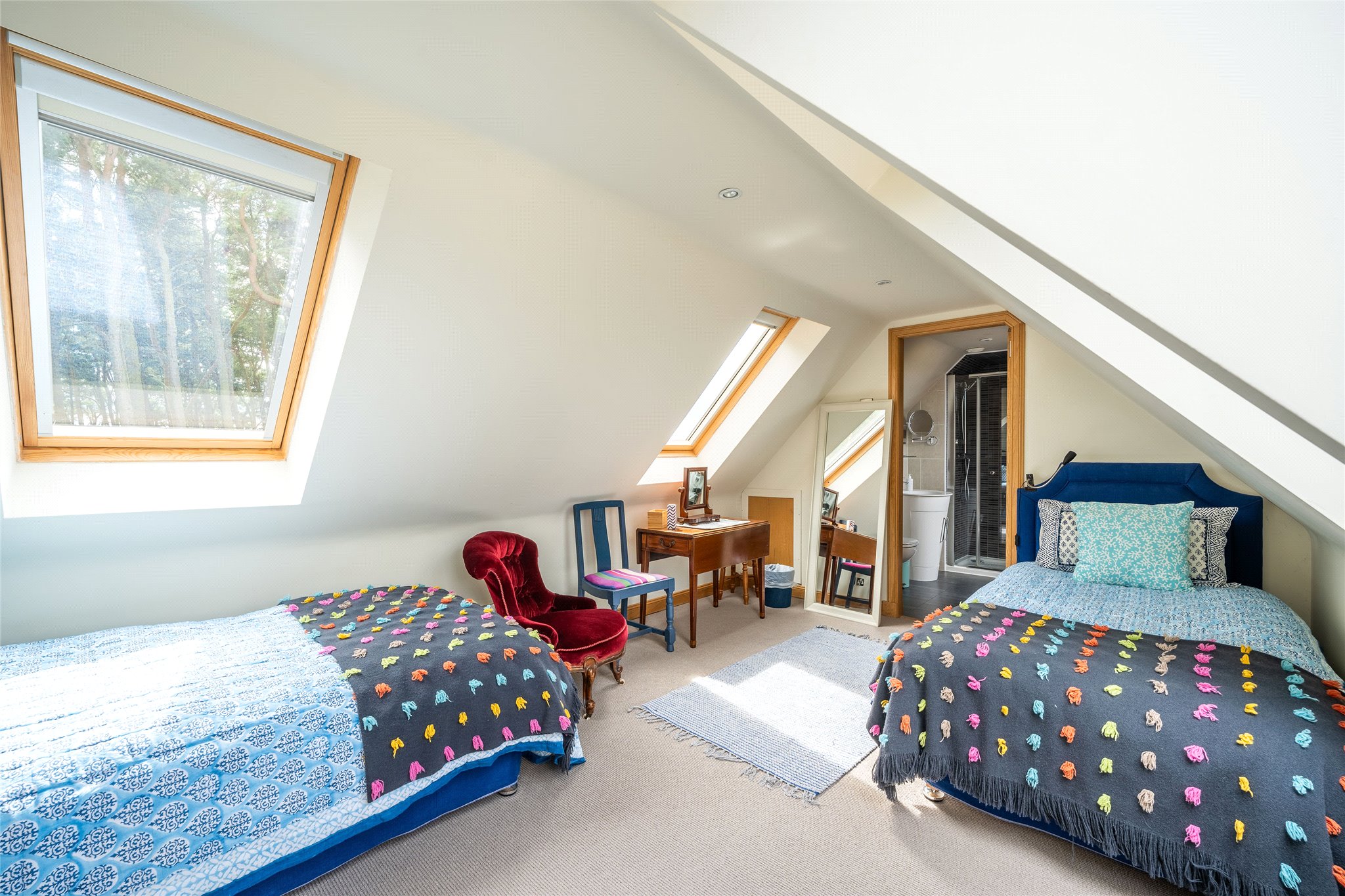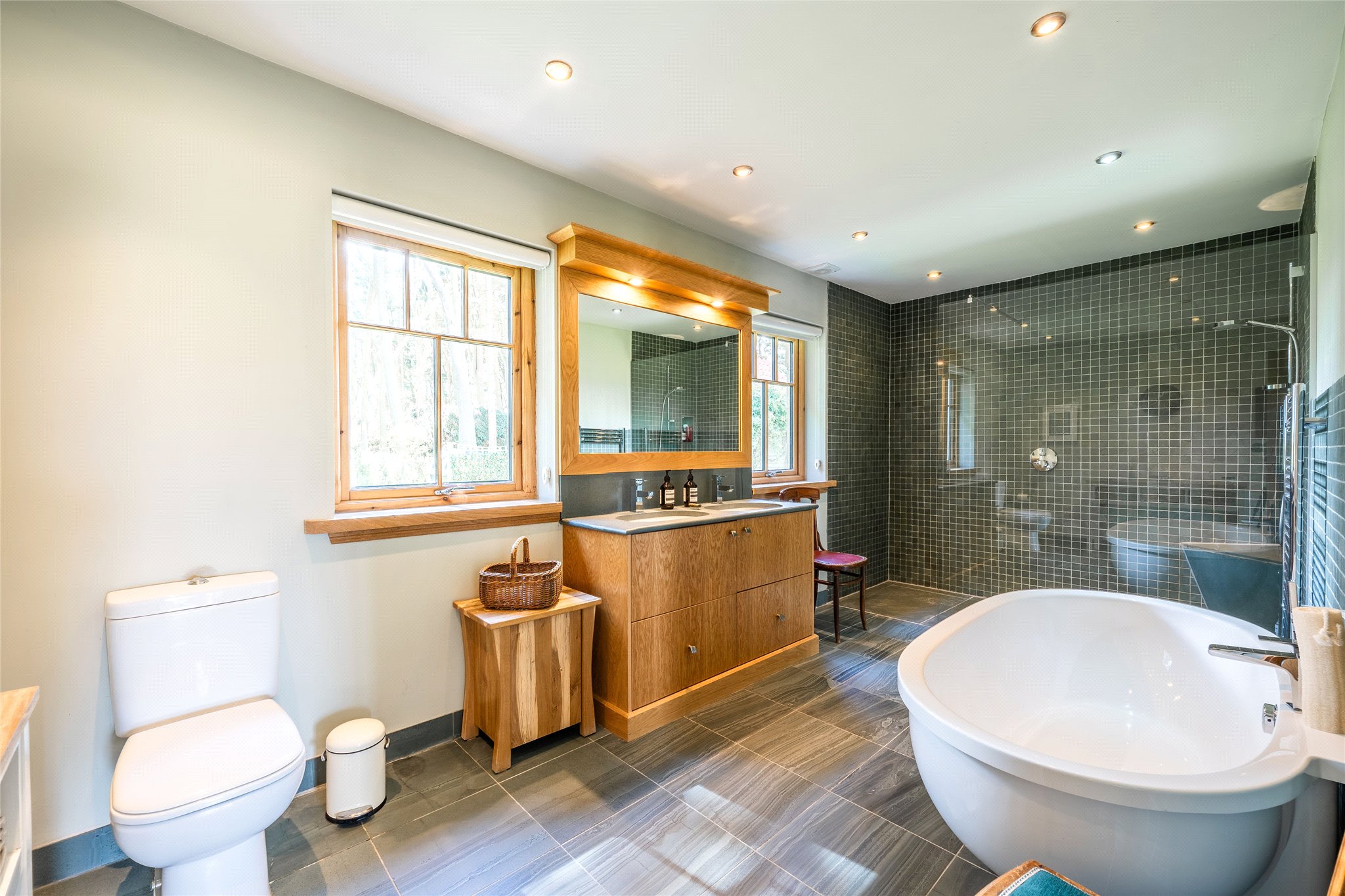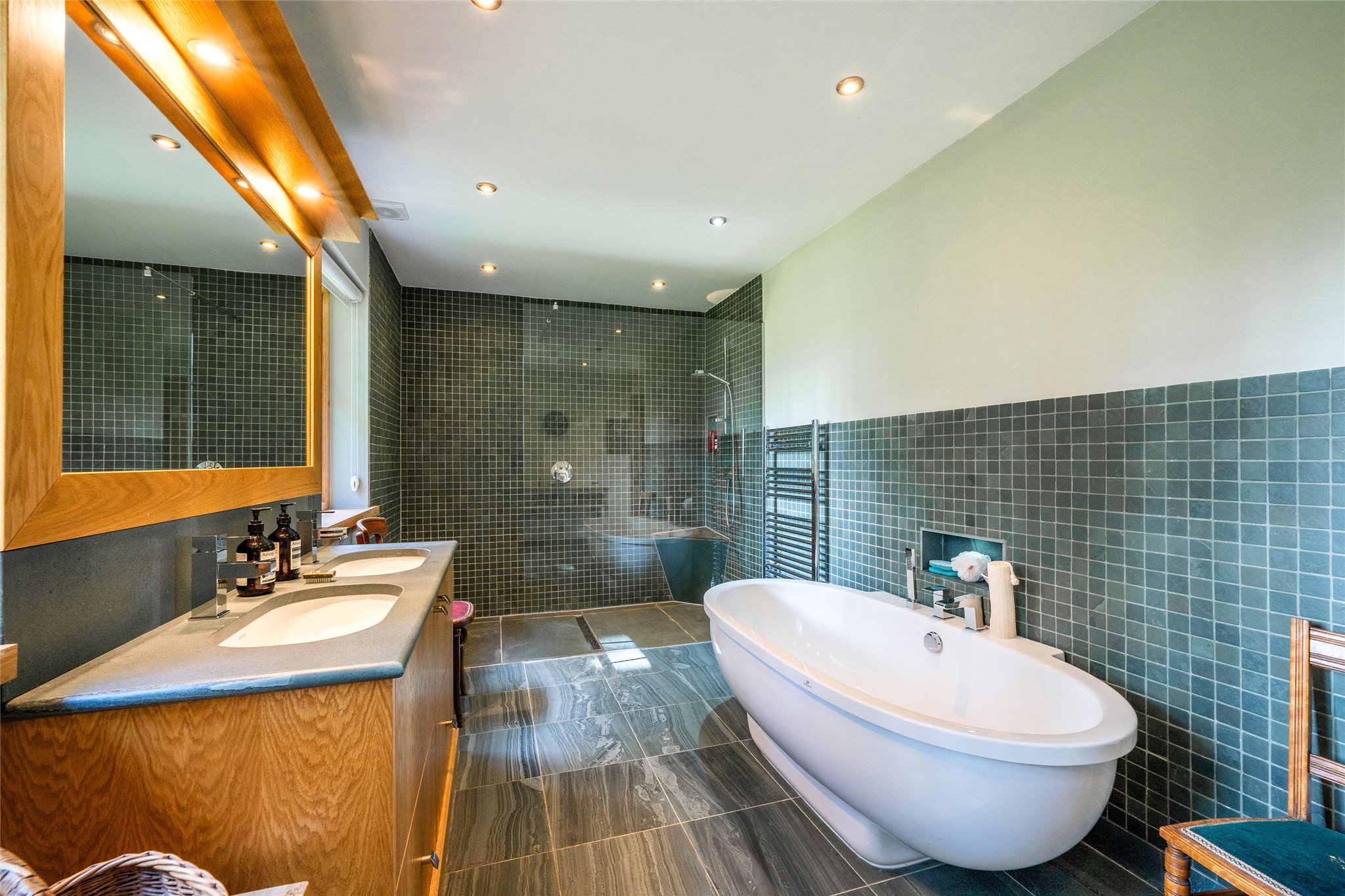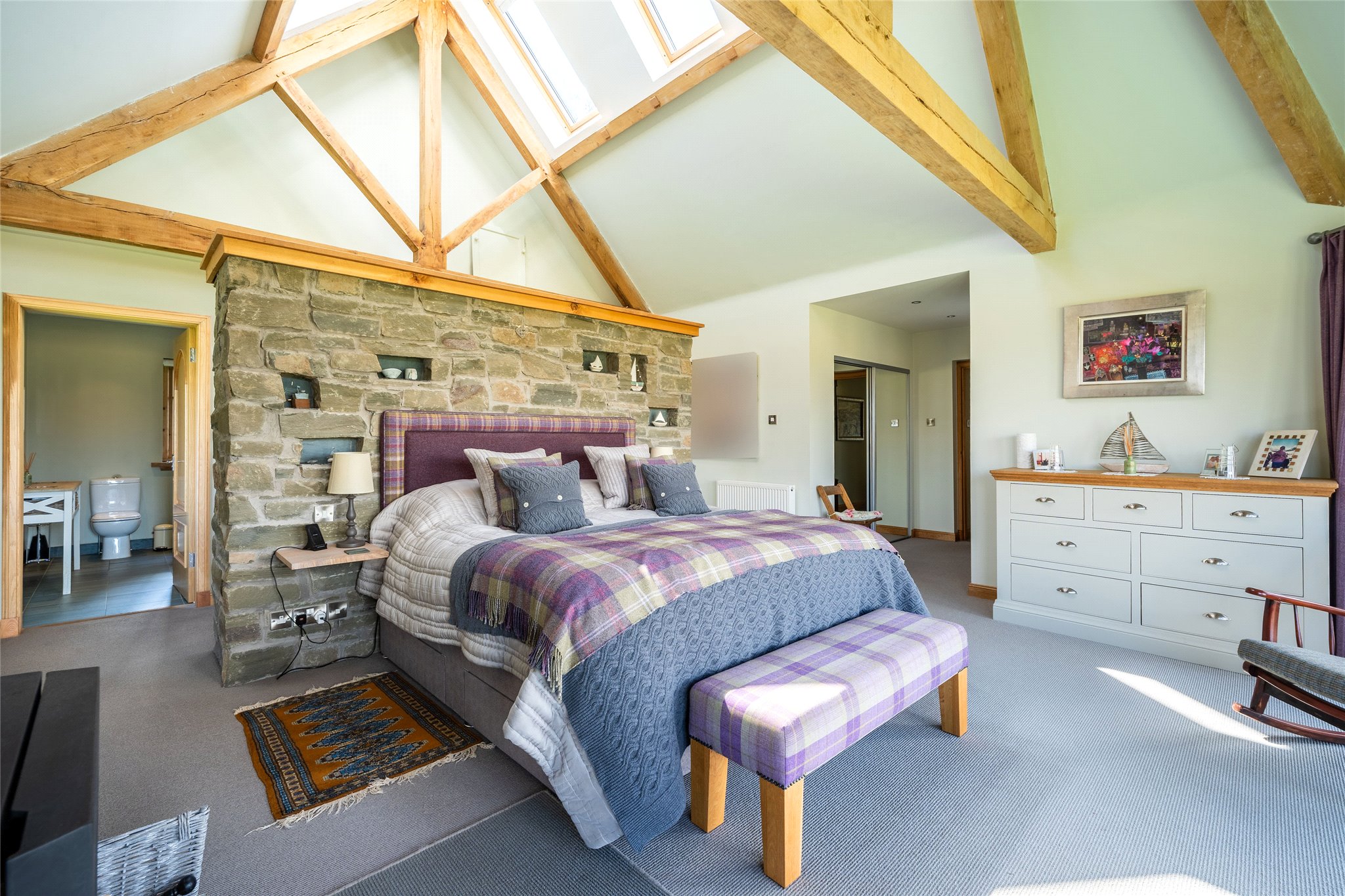 Enveloped in picturesque open countryside, St Andrews Wells lying on the pilgrim route to St Andrews, was sympathetically converted from a former smiddy in 2000 to form a stunning family home and was further extended in 2012 by the current owners. Approached by a sweeping monoblock driveway, a neat lawn guides you to the semi-glazed timber front door and into the welcoming hallway adorned with high-quality Amtico flooring. From here an astragal door with side panel ushers you into a spectacular west-facing living room. Boasting a warm colour palette, plush Crucial Trading carpeting throughout the house, charming window seats, and an original stone fireplace housing a wood-burning stove it exudes warmth and comfort. Returning to the hallway, a spectacular roundel with garden access has been beautifully finished, to create an open kitchen, dining, and family room enjoying breathtaking countryside views. Showcasing a stone column with a wood-burning stove, ash flooring, and a vaulted ceiling with exposed beams and LED lights this light-filled space perfectly balances modern living with rustic charm. The bespoke handcrafted kitchen by David L Douglas of Cairneyhill, Fife, a three oven electric Aga, a Quooker hot tap, Belfast sink, and a full suite of integrated Miele appliances including a dishwasher, Miele fan oven and grill, and microwave. A breakfast bar allows for comfortable informal dining. Featuring a Belfast sink, washing machine and tumble dryer a useful utility ensures the kitchen remains streamlined. A second carpeted hallway flooded with natural light leads to the magnificent principal double bedroom. Lying beneath a vaulted ceiling with beautiful French oak beams this luxurious room features a wood-burning stove, a feature wall with inglenooks, and captivating open countryside views. It is complemented by a separate dressing area with a built-in walnut dressing table and cupboard space, three double mirrored wardrobes, and a stunning en-suite bathroom. The spa-like en-suite includes a large double-ended Porcelanosa bath, a shower, a Duravit double sink unit with built-in cupboards, underfloor heating, a heated towel rail, and tiling from Kirkstone Quarry in the Lake District. Completing the ground-floor are two south-facing double bedrooms one of which has been converted into a handsome bespoke study with two walnut workstations. The other has a charming outlook over the front garden to the original well and features a built-in double wardrobe. They share access to a design-led family bathroom featuring a Duravit bath with shower overhead, washbasin, WC, and porcelain floor tiles. Ascending the carpeted staircase with rope banister, the first-floor houses two light and airy double bedrooms boasting a delightful aspect of the rolling countryside. Thoughtfully designed they each benefit from a contemporary en-suite shower room with unique Phillipe Starck style washbasins, hidden cistern wall-hung WCs, Amtico flooring, and heated towel rails.