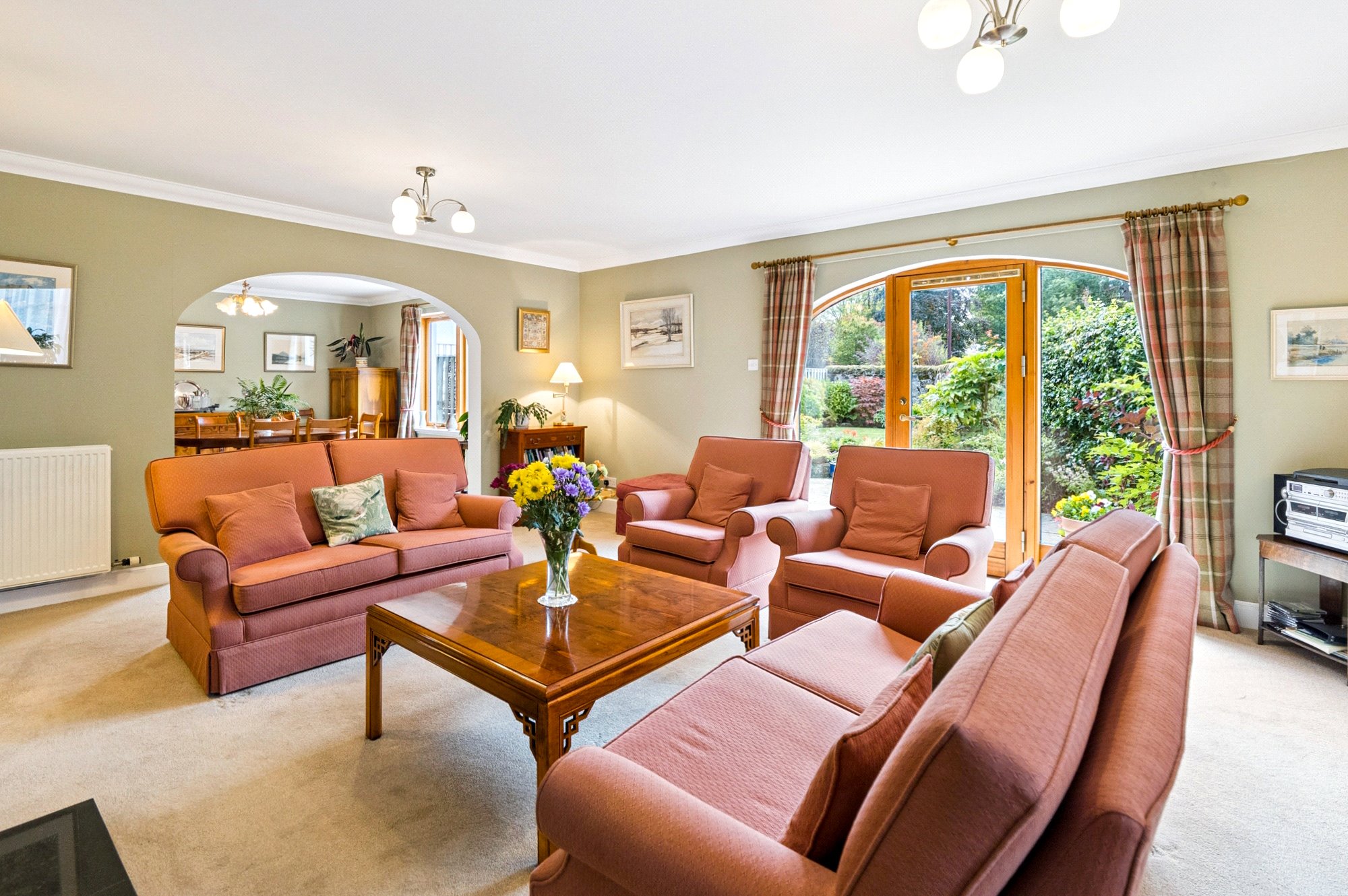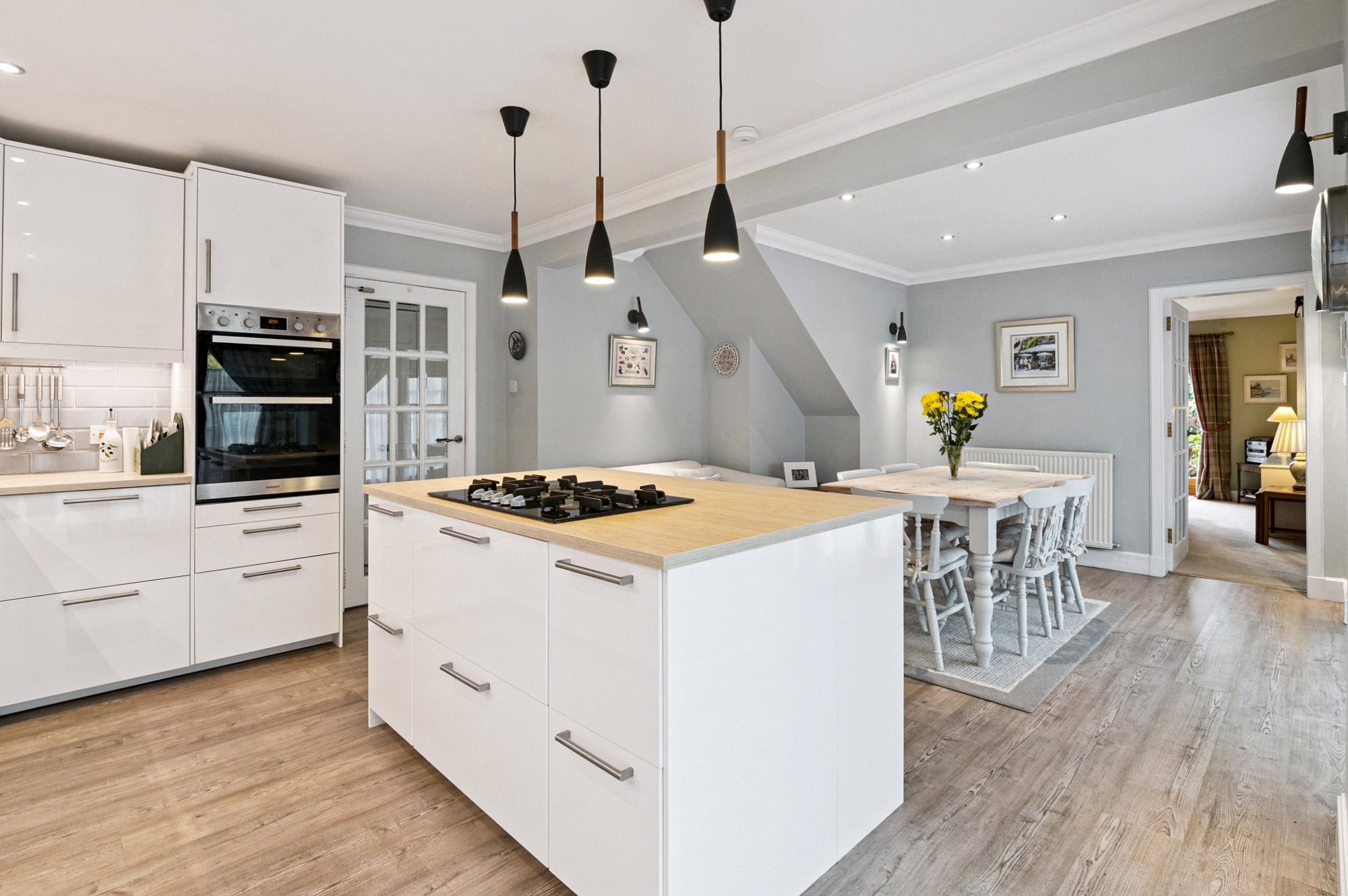 The home is entered via a charming stone turret into a welcoming reception hall with useful built-in storage and a cloakroom/WC. From here, double doors open into the elegant open-plan living and dining room; a wonderful space for both family living and entertaining. Dual-aspect windows, including a near full-height arched feature window with garden access, flood the space with natural light and frame pleasant outlooks. A contemporary fireplace adds a focal point to the living area, while the adjoining dining space offers ample room for formal gatherings.