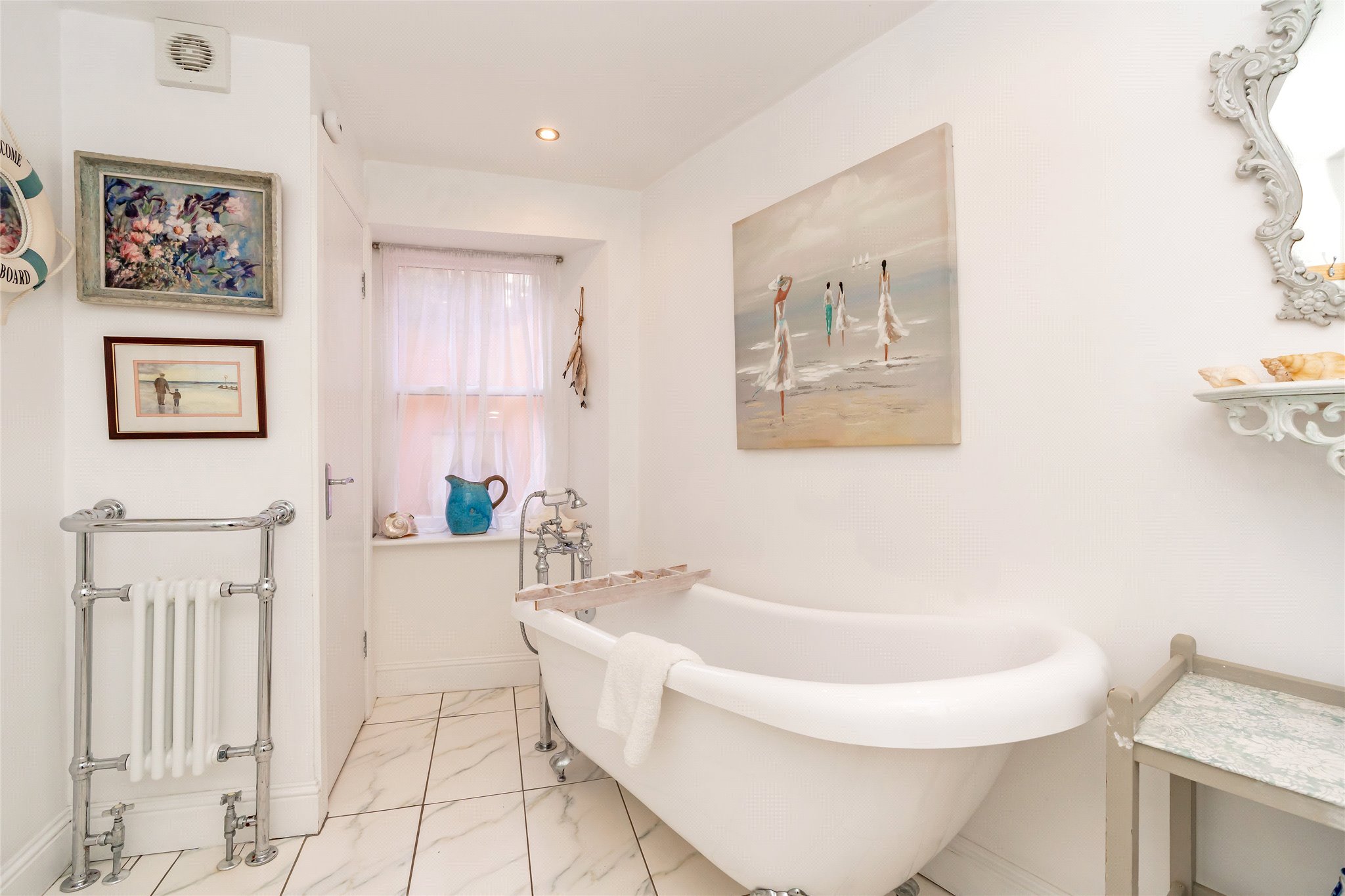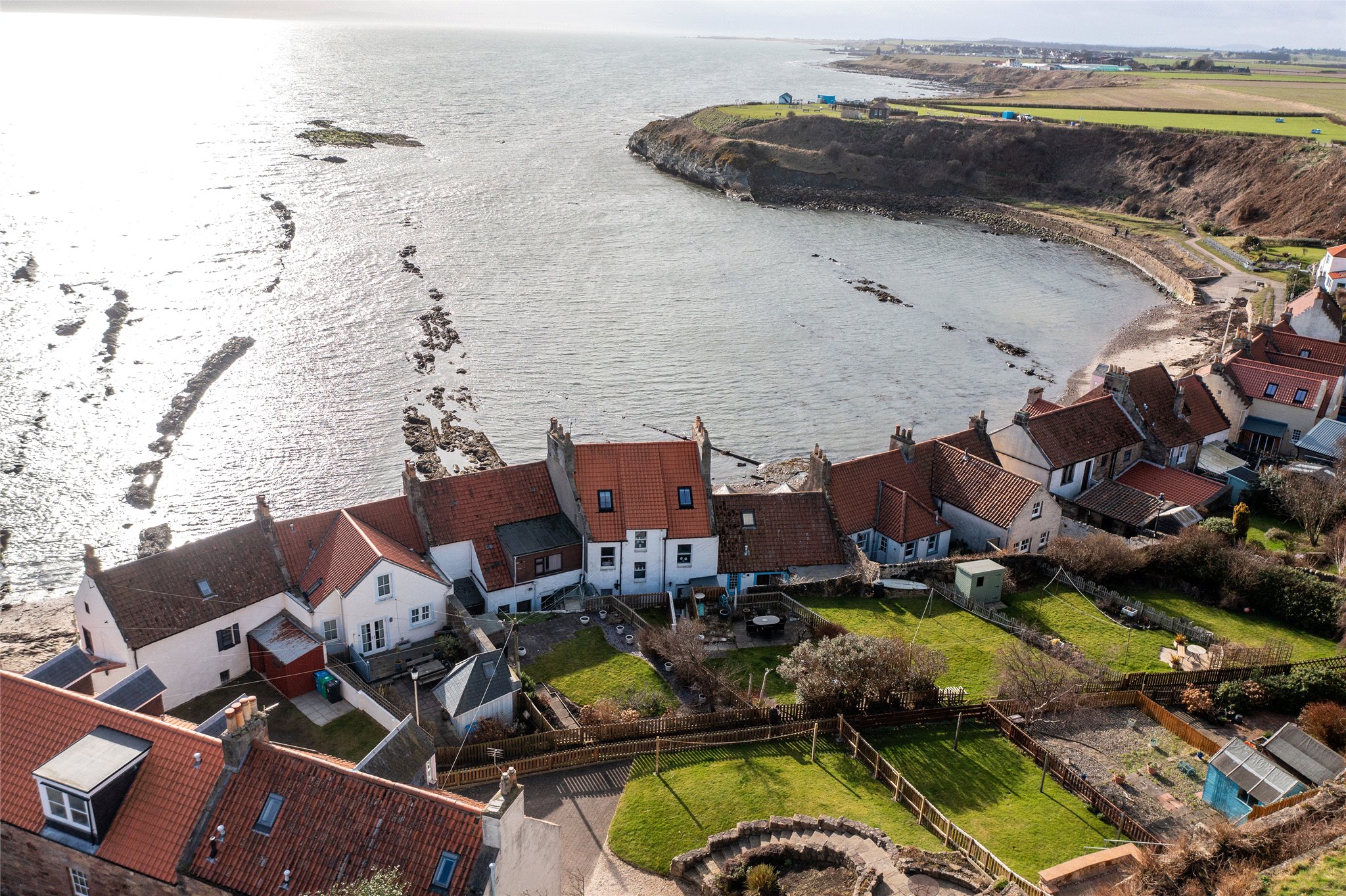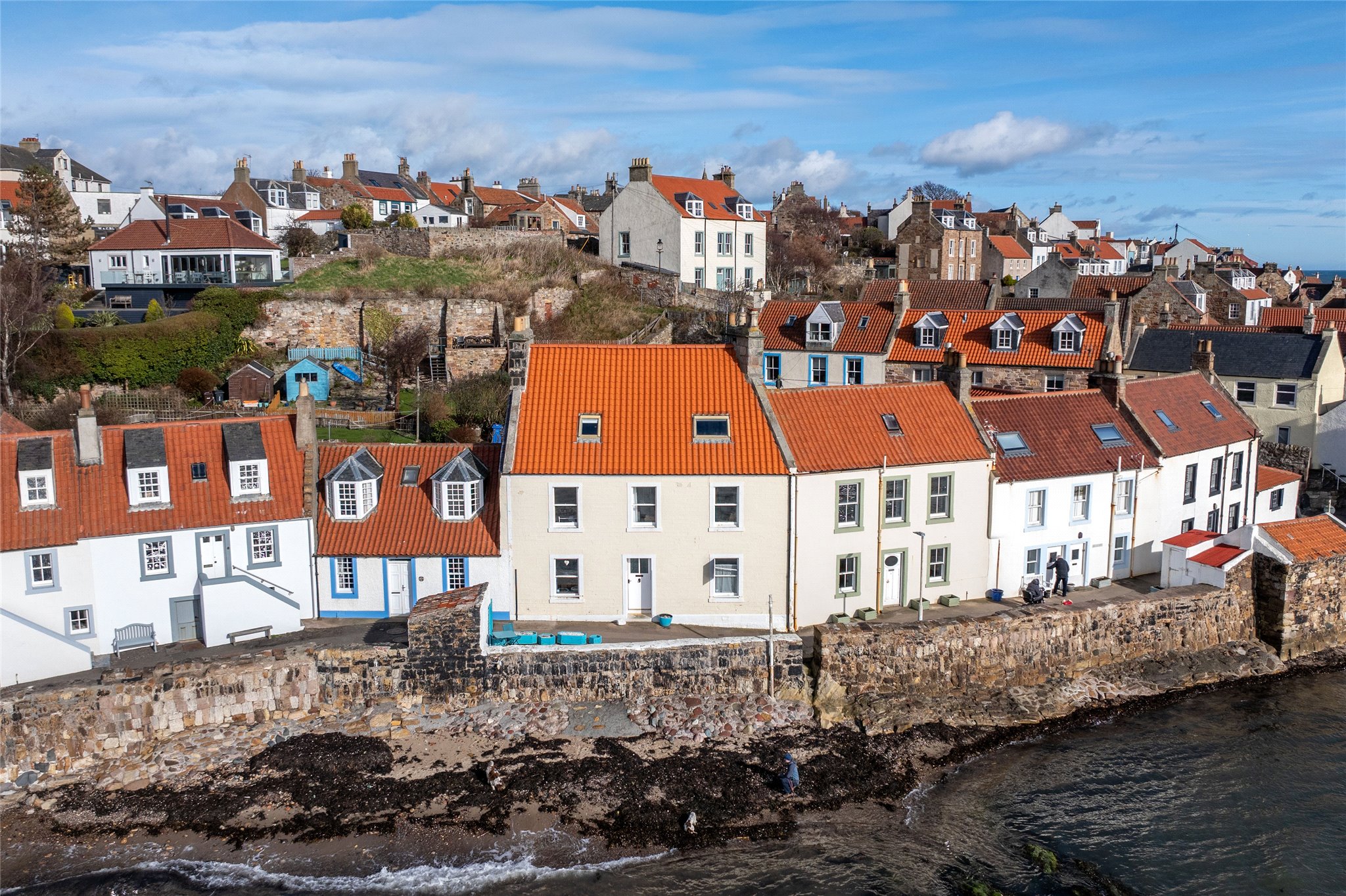 A highly established holiday let, this beautifully presented and rarely available five-bedroom seafront Pittenweem home spanning three floors, blends comfort, style, and timeless charm with breathtaking views. Lying behind a low stone seawall the property immediately captivates with its outstanding position and outlook. Stepping inside, you are welcomed by a light and airy entrance vestibule and hallway featuring a crisp décor and leading out to the rear garden. To the right, a south-east-facing living room overlooking the sea exudes a wonderful feeling of warmth and cosiness thanks to its décor of wooden flooring, soft neutral wall finishes, and a living flame fireplace nestled in an oak mantle. Opposite the dining kitchen impresses with its generous proportions and high-quality finishes. Opening to the garden from the kitchen and with an outlook across the coastline from the dining area, it is very much at the heart of the home and its thoughtful design and log-burning stove help to differentiate the two spaces. Predominantly boasting white base units, a metro-tiled splashback, and bespoke solid oak worktops, the kitchen remains streamlined with a charming rustic quality, enhanced by the presence of an integrated range cooker. An adjoining utility provides further storage. Completing the ground floor layout is a luxurious, classically-styled bathroom with marble-effect floor tiles providing the backdrop to an indulgent freestanding roll-top bath, rainfall shower enclosure, WC, washbasin, and chrome towel radiator. A traditional whitewashed box staircase ushers you to the first floor and a stunning south-east-facing living room. Twin windows frame spectacular sea views and flood the space with light. Adorned with an elegant ceiling rose and a cast iron fireplace set in a white mantle it is the perfect place to relax as you take in the natural landscape. On this floor lie three light and airy bedrooms, two double and a single, each enjoying a sophisticated minimalist aesthetic. Sea facing, the double bedroom to the front, features a focal white mantlepiece and a ceiling rose which add to its charm, whilst a second bedroom overlooking the garden, boasts a focal oak mantlepiece with ornate decoration above. Ascending to the second floor, a magnificent principal double bedroom enjoys a refined interior design along with an inviting seating area and a striking white feature sandstone mantlepiece. Along with the second double bedroom on this floor, it benefits from Velux windows offering a captivating aspect and ensuring an abundance of natural light. They share access to a well-appointed bathroom with a bath with a wall-mounted shower, WC, and washbasin built into vanity.