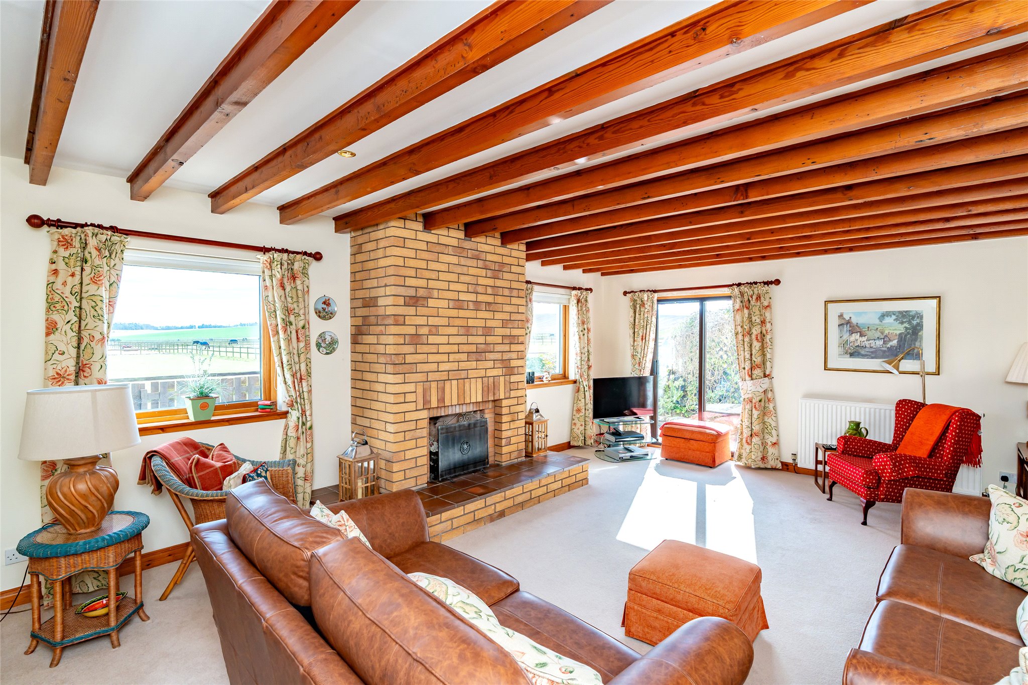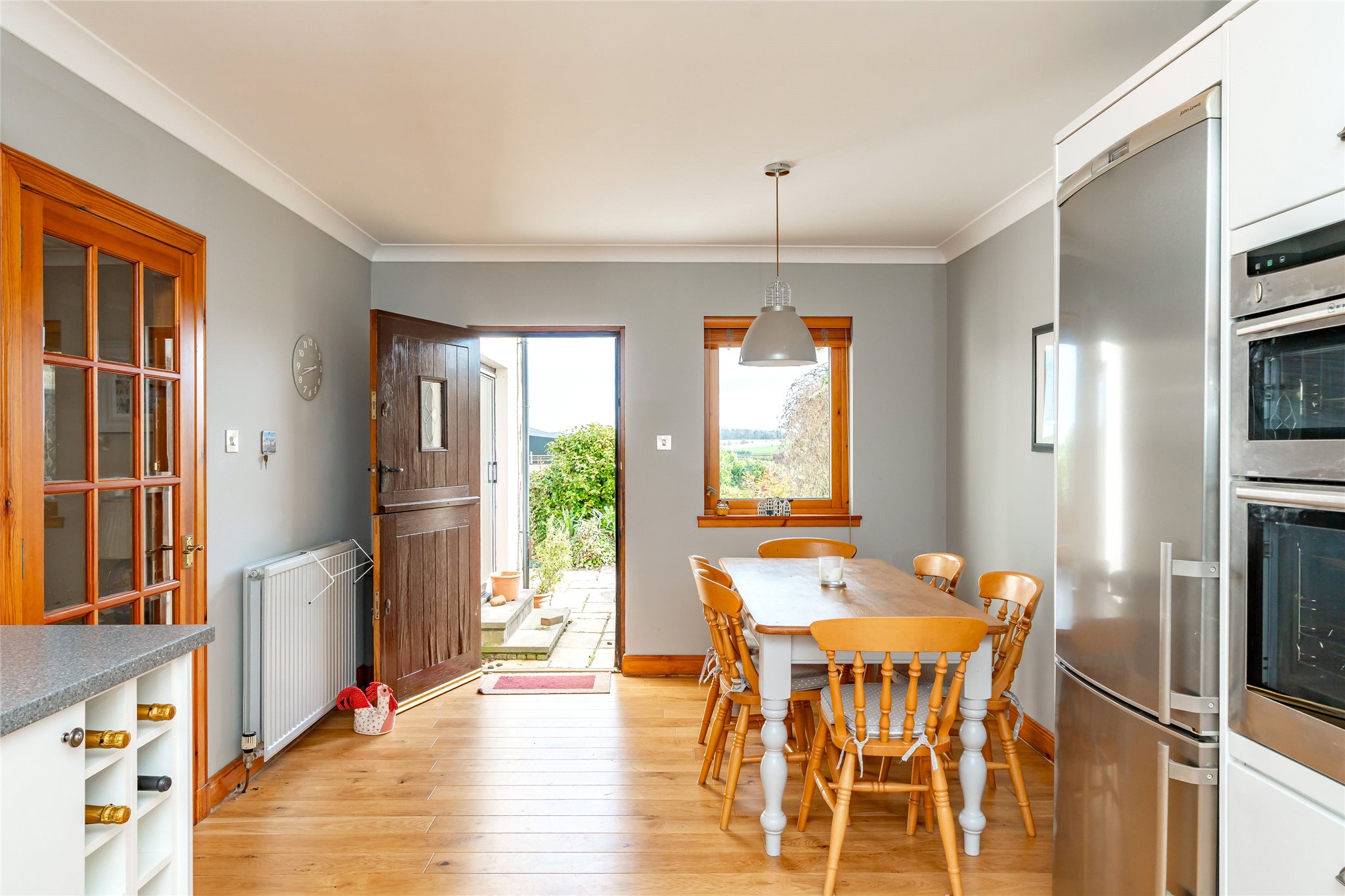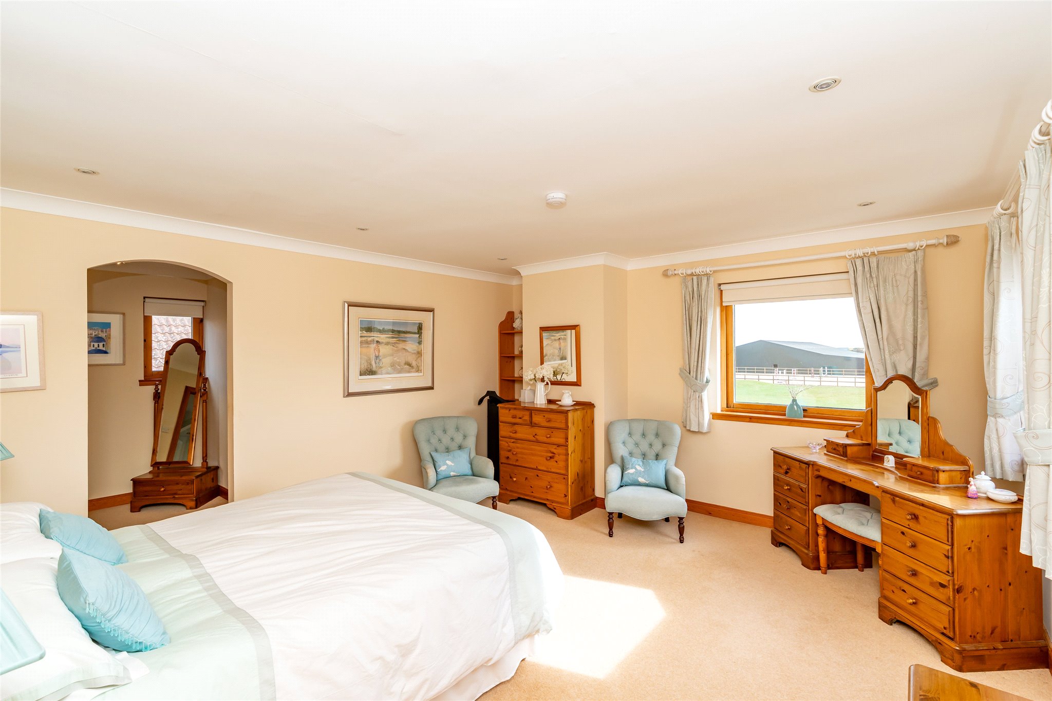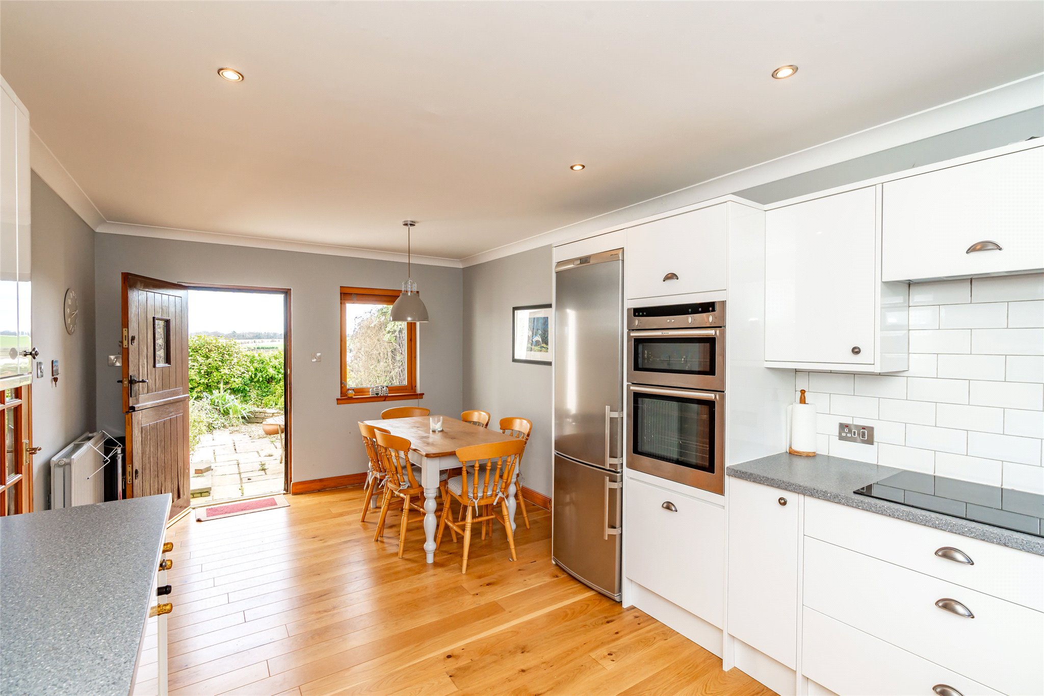 Enjoying a picturesque rural position on the outskirts of St Andrews and forming part of a carefully considered steading conversion, this spacious, comfortable, and bright four-bedroom home promises buyers an idyllic lifestyle. From its charming stone-built exterior with cottage-style multi-pane windows, the front door opens into a welcoming entrance vestibule, leading to an inviting hallway. Straight ahead, a sizeable living room is flooded with natural light from south-east-facing twin windows that frame picturesque landscape and paddock views. Exposed beams and a brick hearth with an open fireplace add character, while sliding patio doors seamlessly connect the room to the rear garden. Adjacent to the living room, a bright, dual-aspect dining kitchen offers an additional living and entertaining space. Wooden flooring and a calming grey colour palette create an airy and relaxed atmosphere, perfect for everyday living. The modern kitchen is equipped with sleek white wall and floor units, grey worktops, and a classic white metro-tiled splashback. High-spec integrated NEFF appliances, including a microwave, eye-level grill, oven, and hob, provide both style and functionality. Completing the ground floor is a spacious office with built-in cabinetry and a convenient WC. Upstairs, the principal double bedroom is a serene retreat, boasting a breathtaking south-east-facing rural outlook. This tranquil space is complemented by a dressing area with mirrored wardrobes and an en-suite shower room featuring Jack and Jill washbasins set into a sleek vanity unit and a WC. Three additional double bedrooms, each thoughtfully decorated and offering a scenic aspect, provide ample space for family or guests. Two of these bedrooms include built-in wardrobes. A well-appointed and stylish family shower room, complete with a washbasin built into vanity and a hidden cistern WC, serves these rooms.