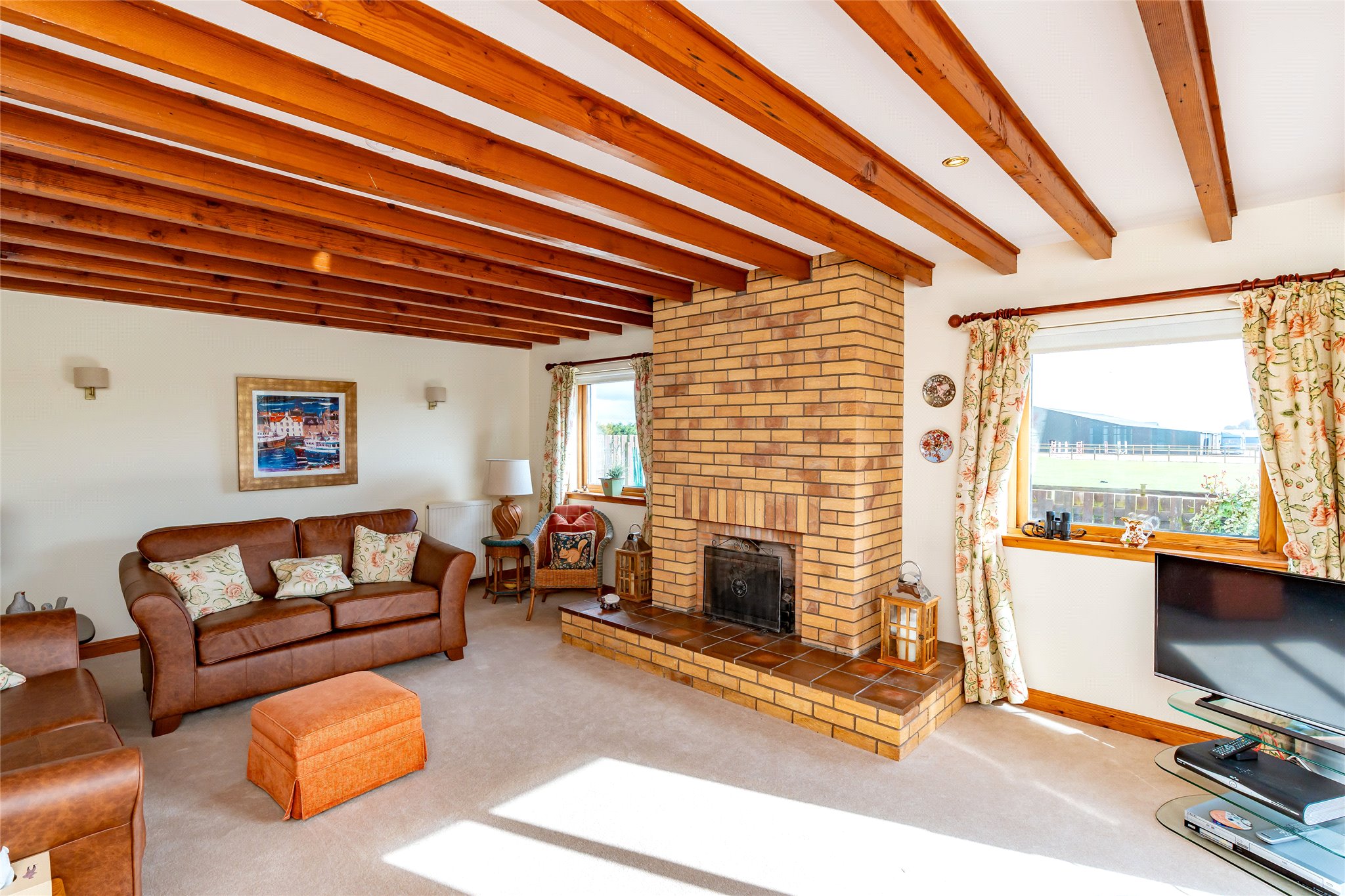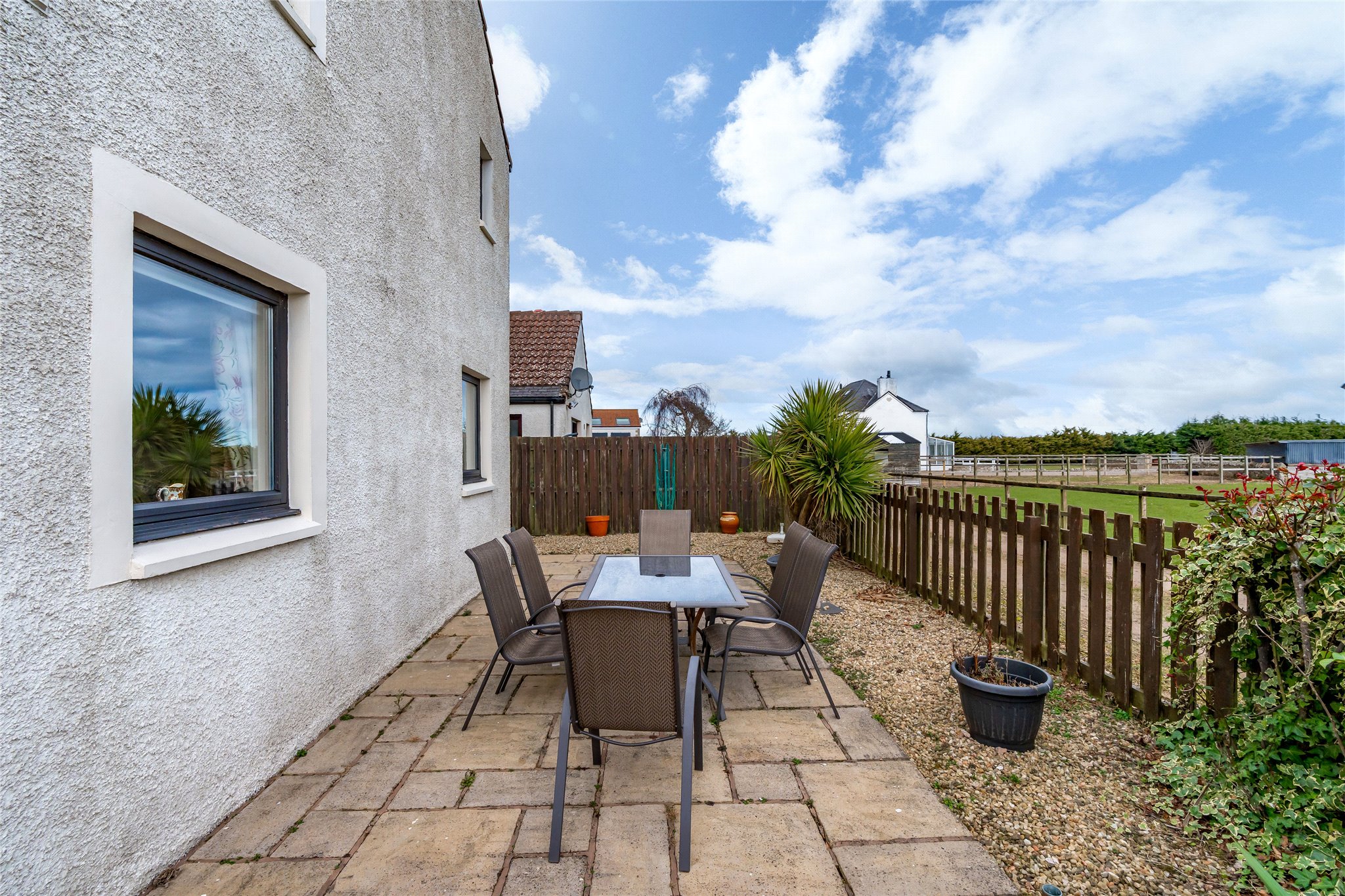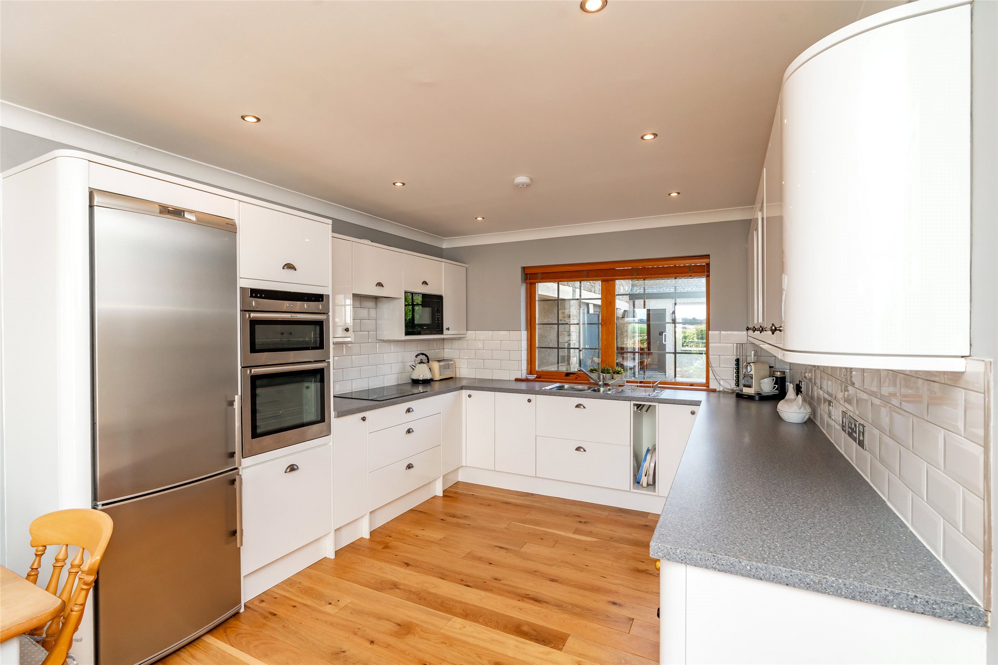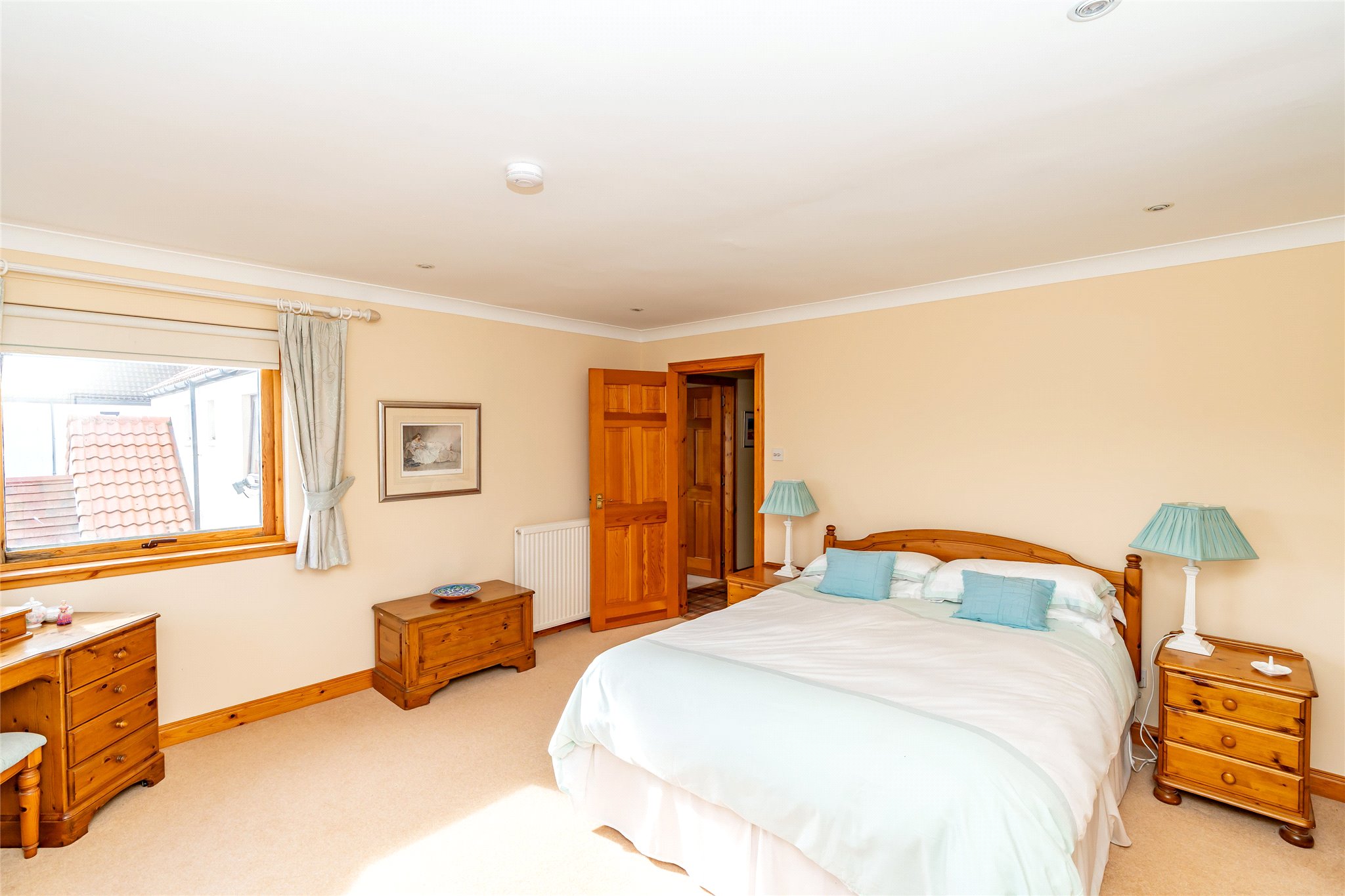 Enjoying a picturesque rural position on the outskirts of St Andrews and forming part of a carefully considered steading conversion, this spacious, comfortable, and bright four-bedroom home promises buyers an idyllic lifestyle. From its charming stone-built exterior with cottage-style multi-pane windows, the front door opens into a welcoming entrance vestibule, leading to an inviting hallway. Straight ahead, a sizeable living room is flooded with natural light from south-east-facing twin windows that frame picturesque landscape and paddock views. Exposed beams and a brick hearth with an open fireplace add character, while sliding patio doors seamlessly connect the room to the rear garden. Adjacent to the living room, a bright, dual-aspect dining kitchen offers an additional living and entertaining space. Wooden flooring and a calming grey colour palette create an airy and relaxed atmosphere, perfect for everyday living. The modern kitchen is equipped with sleek white wall and floor units, grey worktops, and a classic white metro-tiled splashback. High-spec integrated NEFF appliances, including a microwave, eye-level grill, oven, and hob, provide both style and functionality. Completing the ground floor is a spacious office with built-in cabinetry and a convenient WC. Upstairs, the principal double bedroom is a serene retreat, boasting a breathtaking south-east-facing rural outlook. This tranquil space is complemented by a dressing area with mirrored wardrobes and an en-suite shower room featuring Jack and Jill washbasins set into a sleek vanity unit and a WC. Three additional double bedrooms, each thoughtfully decorated and offering a scenic aspect, provide ample space for family or guests. Two of these bedrooms include built-in wardrobes. A well-appointed and stylish family shower room, complete with a washbasin built into vanity and a hidden cistern WC, serves these rooms.