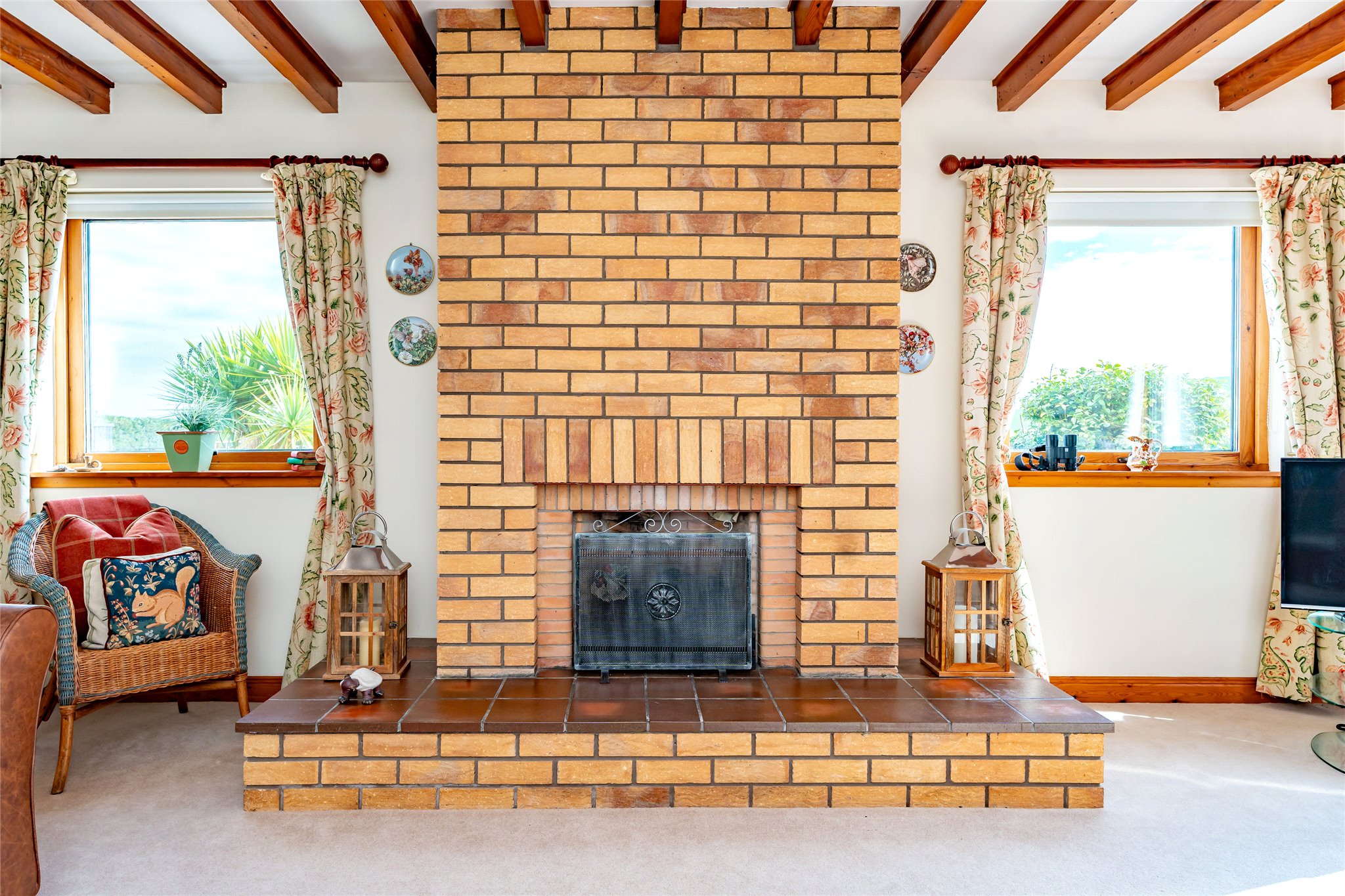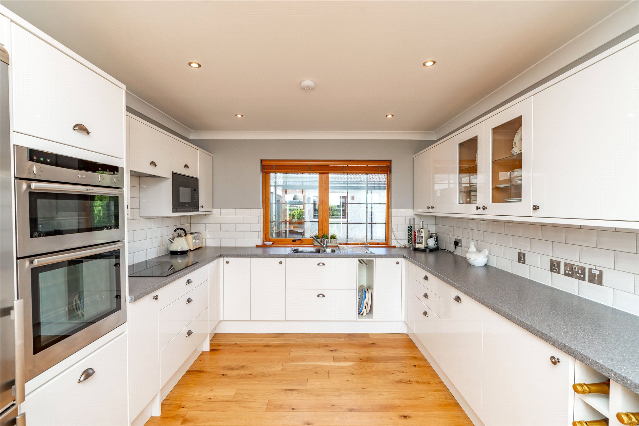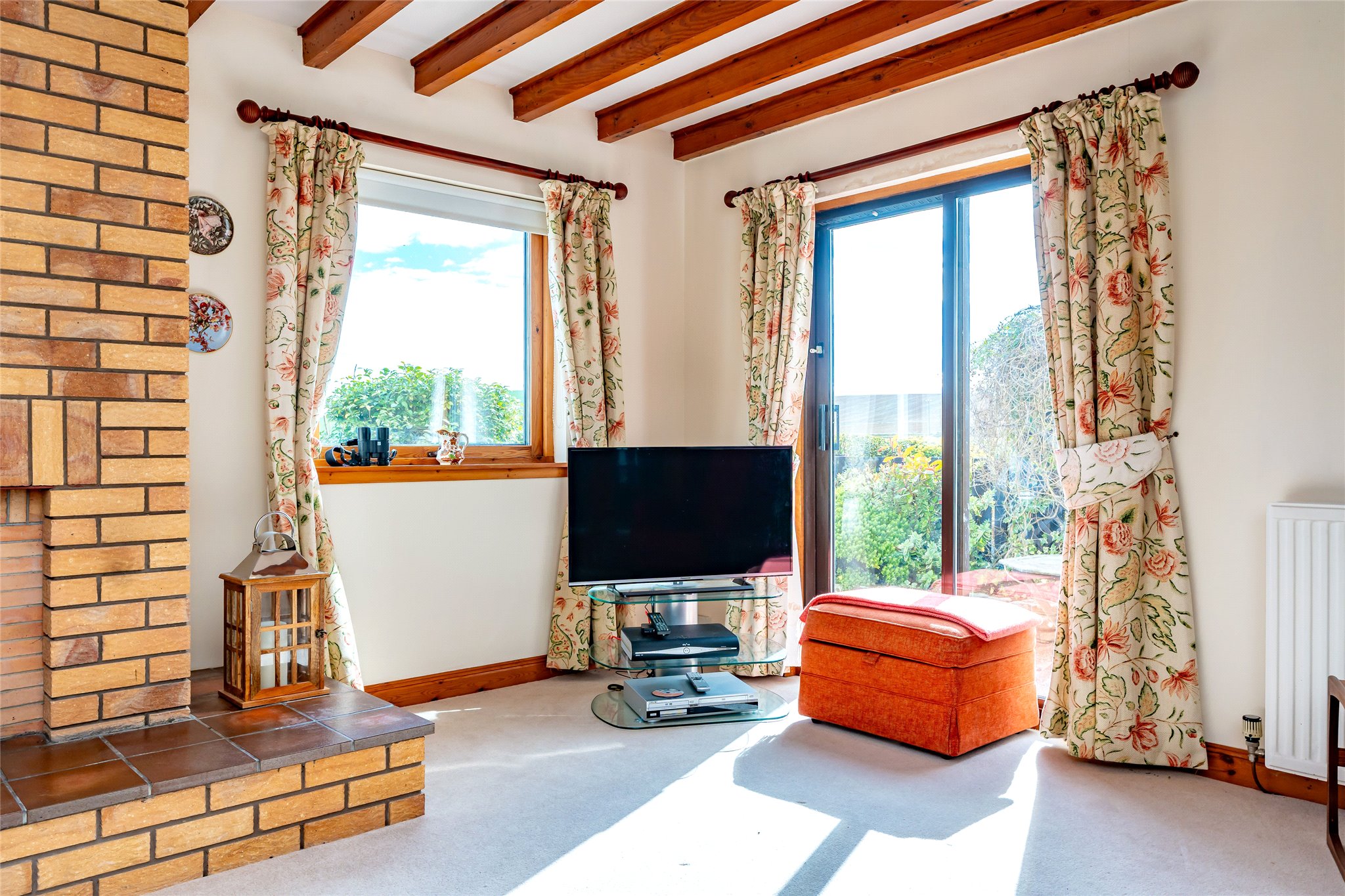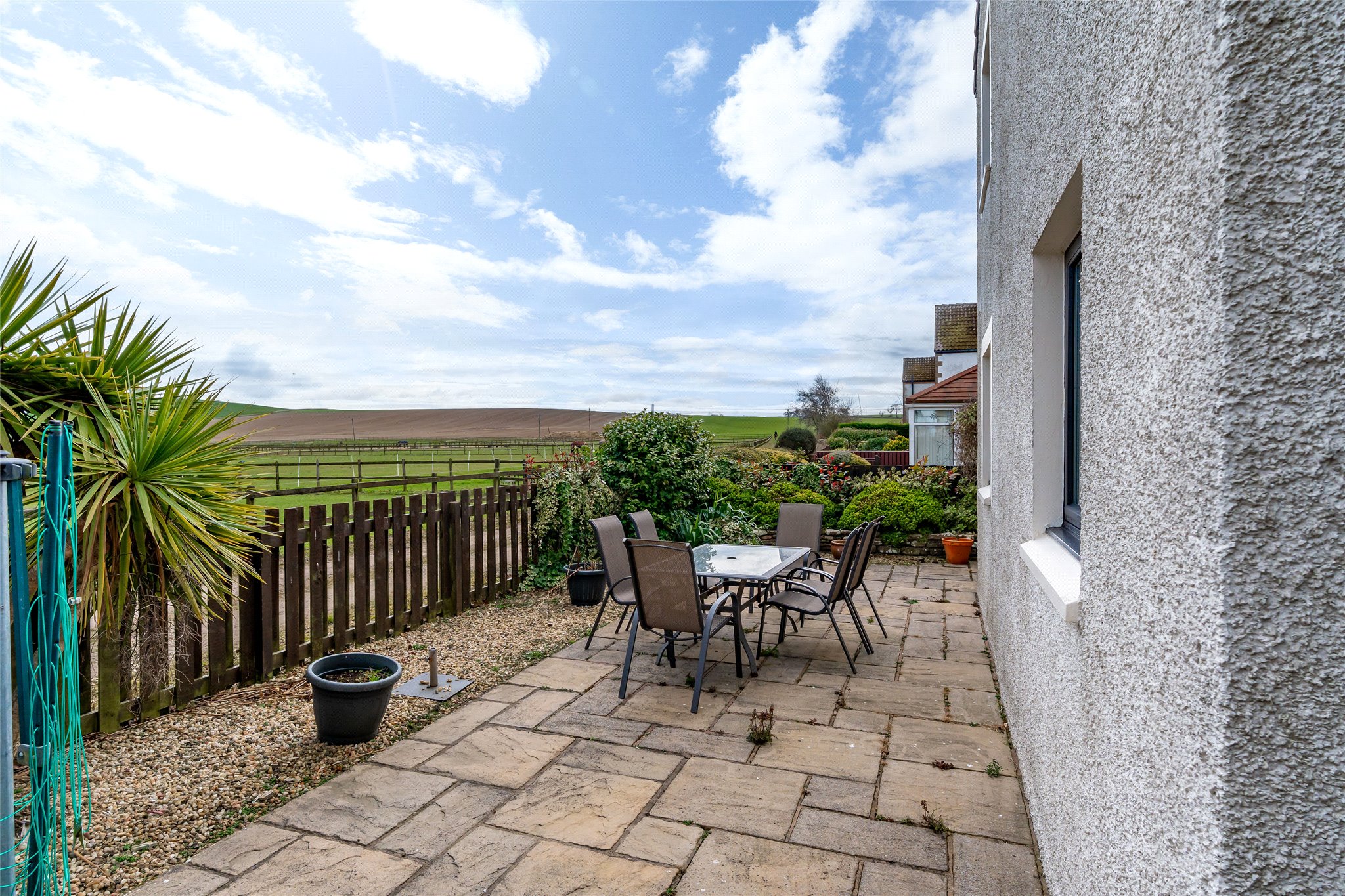 Enjoying a picturesque rural position on the outskirts of St Andrews and forming part of a carefully considered steading conversion, this spacious, comfortable, and bright four-bedroom home promises buyers an idyllic lifestyle. From its charming stone-built exterior with cottage-style multi-pane windows, the front door opens into a welcoming entrance vestibule, leading to an inviting hallway. Straight ahead, a sizeable living room is flooded with natural light from south-east-facing twin windows that frame picturesque landscape and paddock views. Exposed beams and a brick hearth with an open fireplace add character, while sliding patio doors seamlessly connect the room to the rear garden. Adjacent to the living room, a bright, dual-aspect dining kitchen offers an additional living and entertaining space. Wooden flooring and a calming grey colour palette create an airy and relaxed atmosphere, perfect for everyday living. The modern kitchen is equipped with sleek white wall and floor units, grey worktops, and a classic white metro-tiled splashback. High-spec integrated NEFF appliances, including a microwave, eye-level grill, oven, and hob, provide both style and functionality. Completing the ground floor is a spacious office with built-in cabinetry and a convenient WC. Upstairs, the principal double bedroom is a serene retreat, boasting a breathtaking south-east-facing rural outlook. This tranquil space is complemented by a dressing area with mirrored wardrobes and an en-suite shower room featuring Jack and Jill washbasins set into a sleek vanity unit and a WC. Three additional double bedrooms, each thoughtfully decorated and offering a scenic aspect, provide ample space for family or guests. Two of these bedrooms include built-in wardrobes. A well-appointed and stylish family shower room, complete with a washbasin built into vanity and a hidden cistern WC, serves these rooms.