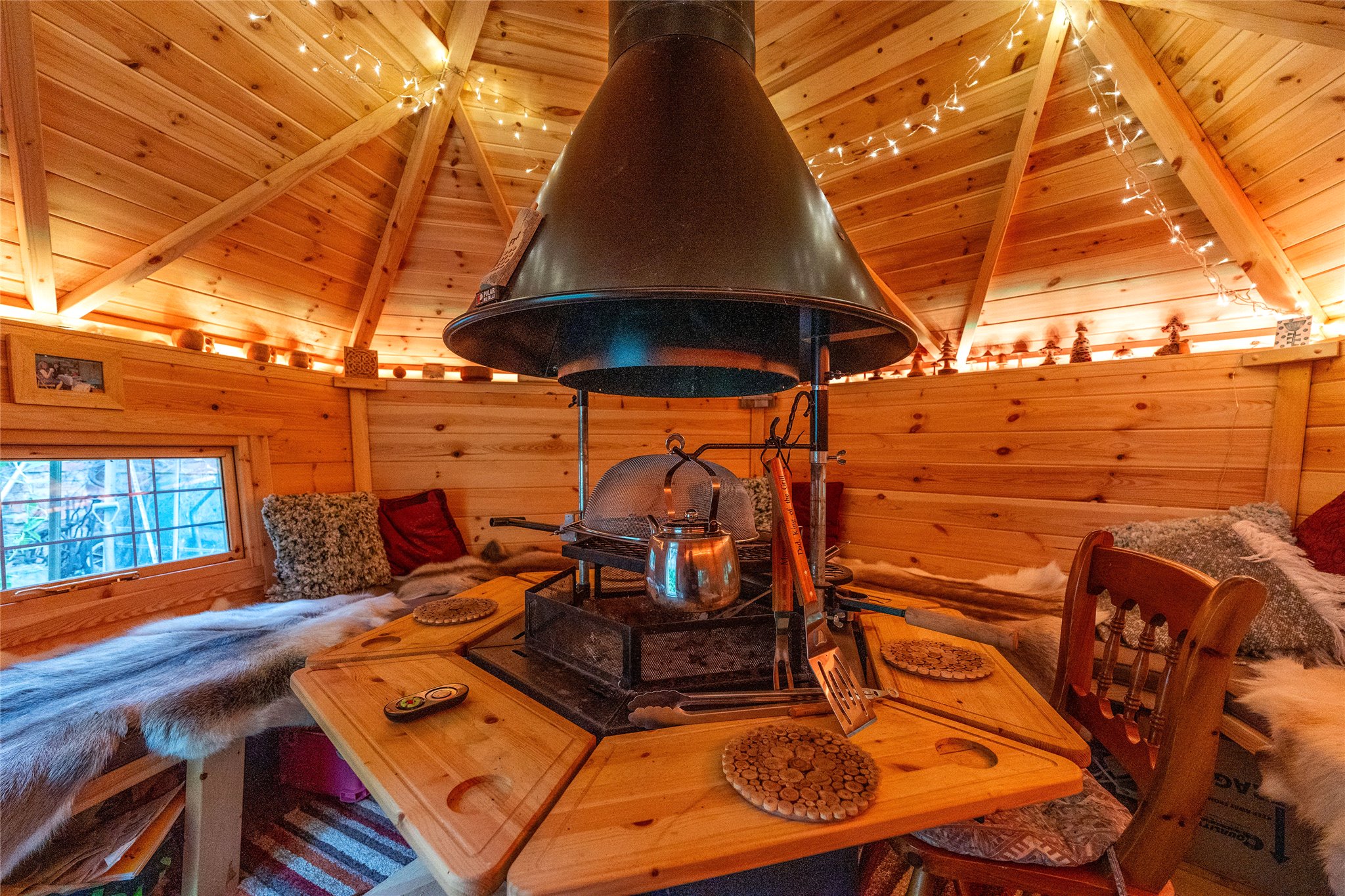 A highlight of the property is the cosy and inviting Scandinavian barbecue hut. Fully insulated and timber-framed, it features soft ambient lighting, bespoke seating, and a central open fire—creating the perfect setting for tranquil evenings