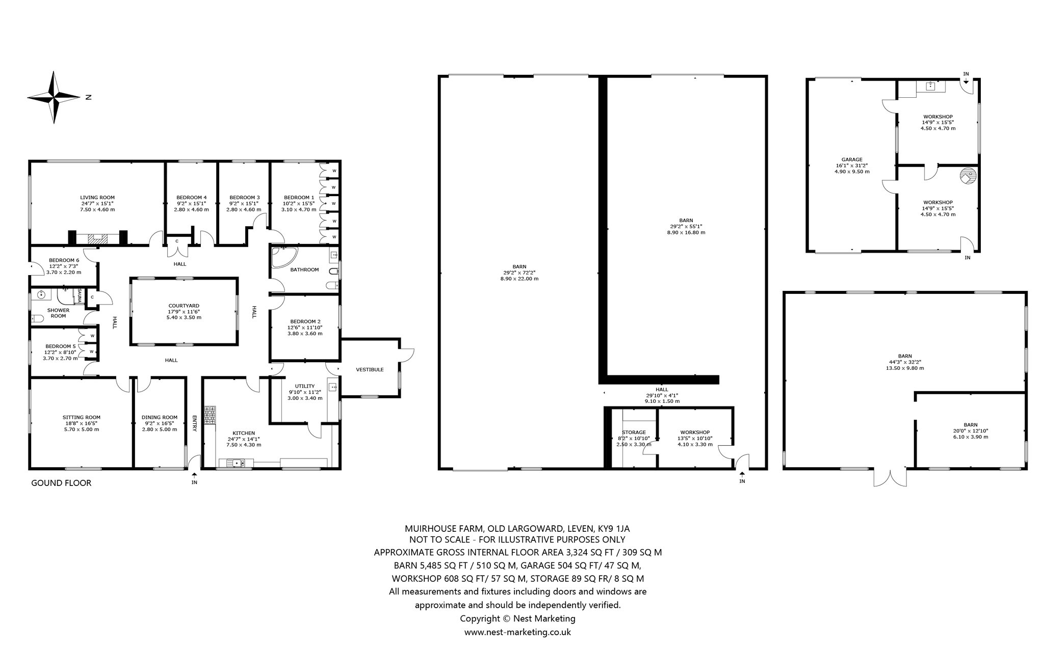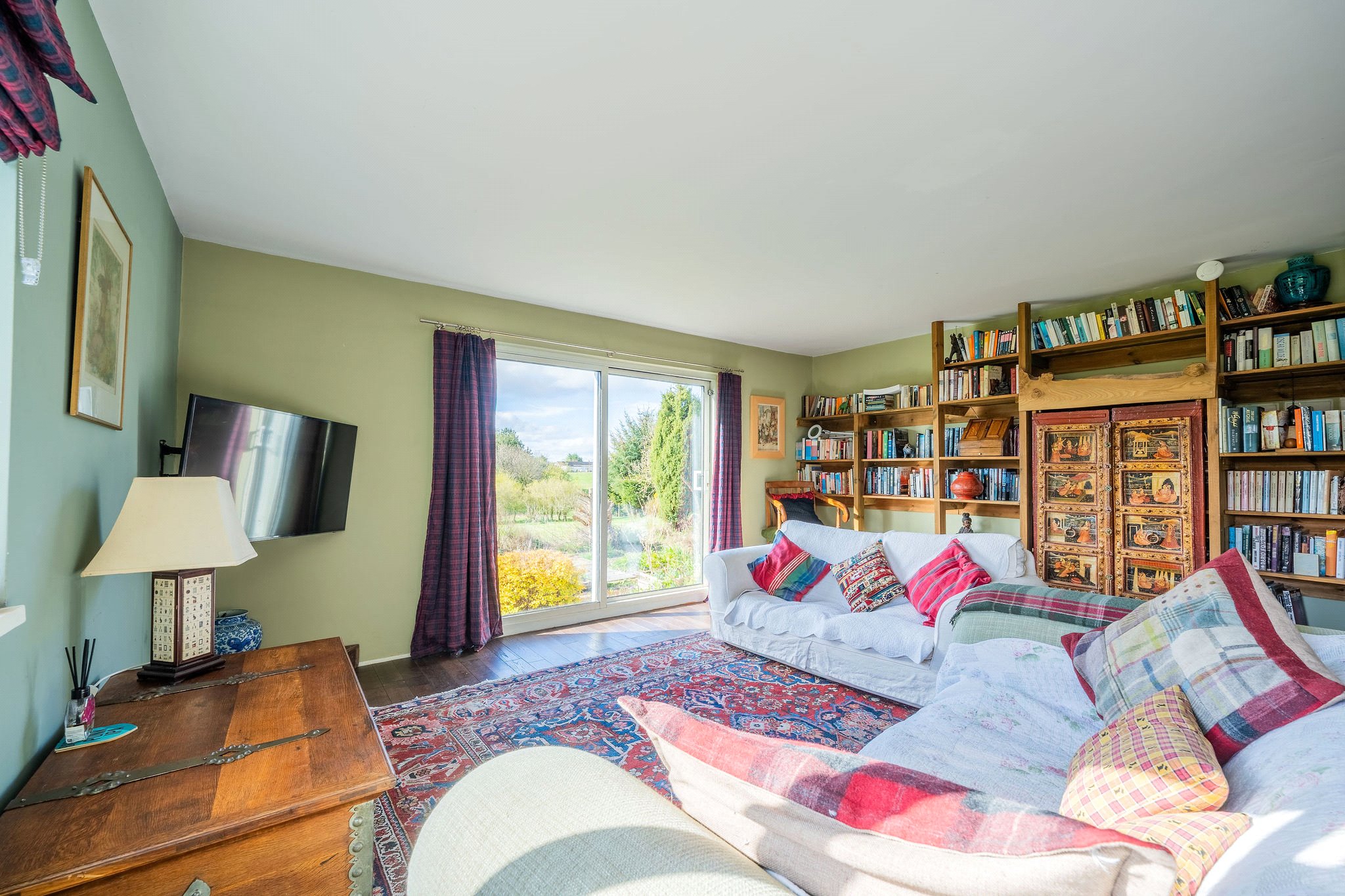 Occupying an enviable East Fife countryside position Muirhouse Farm boasts captivating views and is an impressive six-bedroom residence characterized by generous proportions, well-presented interiors, an abundance of natural light, and a flexible layout The front door opens into a light and airy hallway showcasing original wooden flooring and soft grey wall finishes, from here the accommodation is centred around an inner hallway overlooking an external decked courtyard. To your right, the generously proportioned and bright dining kitchen is adorned with handsome wooden flooring and a striking accent wall of gloss white metro tiles. Rustic wooden cabinetry is complemented by quartz-effect worktops and high-quality freestanding appliances including a SMEG range cooker and extractor hood. It benefits from a sizeable adjacent utility that offers additional storage space and leads to an entrance vestibule, which is the perfect place after a day spent exploring outdoors for storing walking boots, umbrellas, etc. Across the hallway the dual-aspect sitting room with wooden flooring, a tasteful colour palette, breathtaking garden views through sliding patio doors, and a south and west-facing orientation exudes a cosy and welcoming ambience. Lying adjacent is a versatile carpeted dining room that is perfect for entertaining or formal family gatherings. Towards the opposite end of the residence, a further dual-aspect living room boasting a log-burning stove nestled in a brick chimney breast, wooden flooring, and lofty wood-panelled ceilings creates an inviting ambience for entertaining and family life. The property benefits from six appealing bedrooms. A light-filled principal double bedroom enjoys wall-to-wall built-in wardrobes, wooden flooring, and a statement accent wall, whilst each of the remaining, is well-presented, bright, and spacious. They benefit from a good-sized modern family bathroom complete with a corner bath, bidet, countertop washbasin and WC. In addition, there is a well-appointed shower room with a corner body jet shower enclosure situated next to an indulgent sauna.