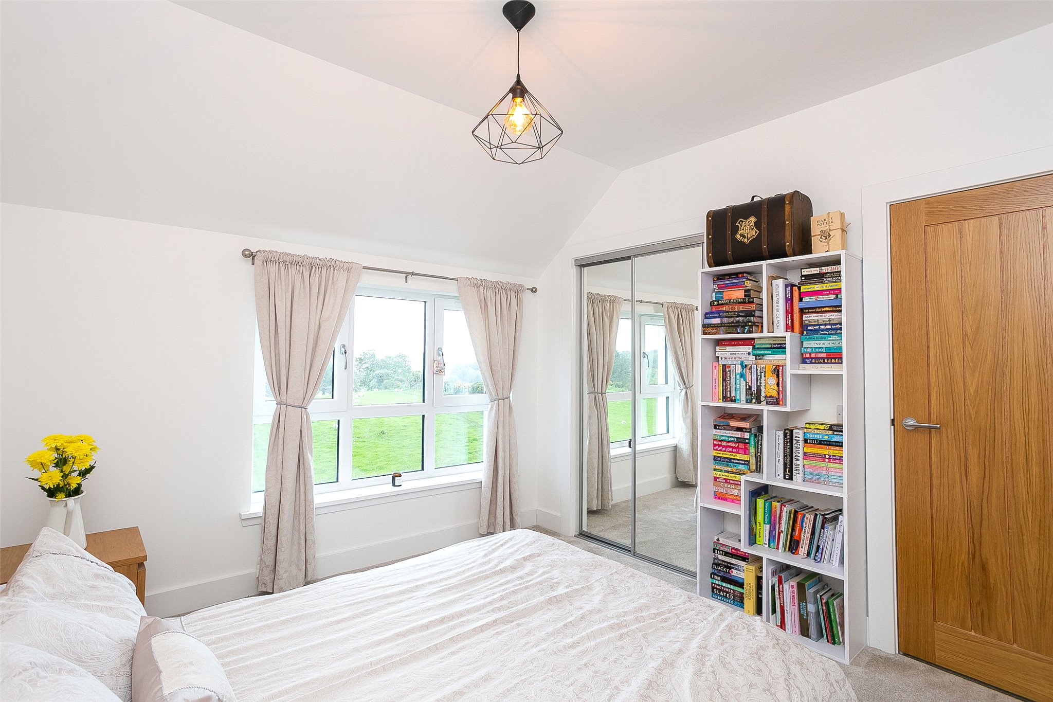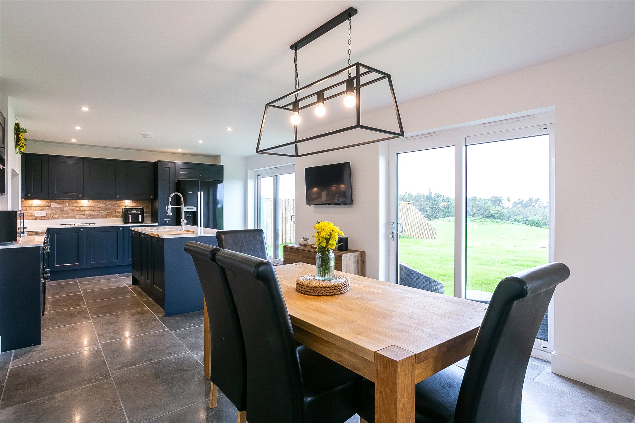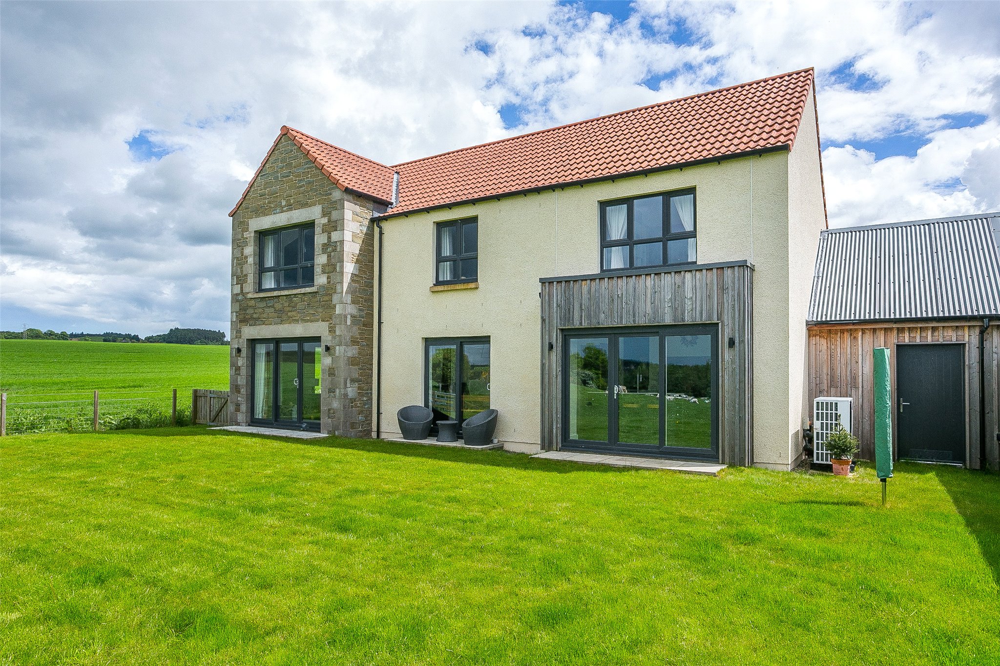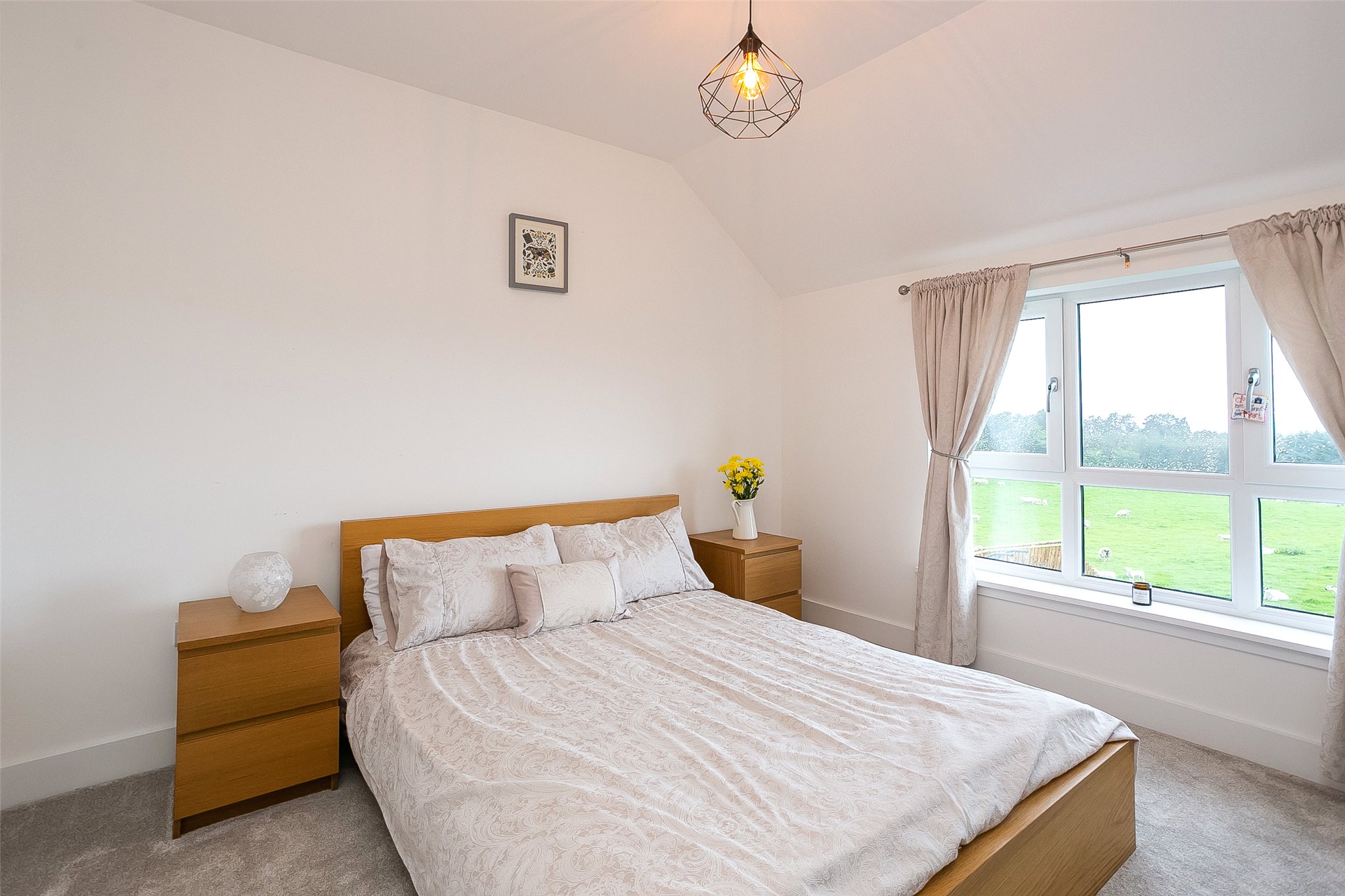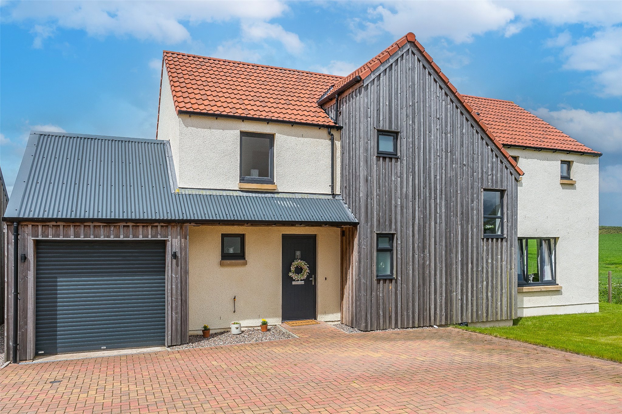 Surrounded by rolling countryside, this outstanding bespoke detached four-bedroom home in an exclusive and peaceful hamlet offers a superb opportunity to enjoy rural living while remaining within easy reach of Glenrothes. A driveway flanking the lush lawn leads to the front door and into a welcoming entrance hall off which lies a utility offering garden access and a stylish monochrome shower room. From here a central reception hall ushers you into a generously proportioned living room showcasing breathtaking views. Triple aspect with sliding doors opening to the rear garden it is a spectacular space. Exuding a warm and comfortable ambience the décor includes black tumbled limestone floor tiling and a brick mantle. Adjoining and accessed through sliding oak barn doors as well as from the reception hall, is a beautifully appointed and light-filled dining kitchen opening to the garden. The custom-made contemporary kitchen showcases wall and floor cabinetry in a sophisticated blue complemented by under-base-lit quartz worktops, a brick splashback, and high-spec integrated appliances including a range cooker and space for a American-style fridge/freezer. A kitchen island provides seating for two. Moving to the first floor, you arrive at the stunning principal bedroom. Decorated with plush carpeting and a statement accent wall and boasting a captivating aspect it is a wonderful retreat, enhanced further by a walk-in-wardrobe and en-suite shower room. Three additional double bedrooms each enjoying a scenic outlook and tasteful décor, feature built-in wardrobes and share access to a design-led bathroom with a hidden cistern WC, washbasin built into vanity, bath with rainfall shower, and chrome towel radiator. An attic provides additional storage. Underfloor heating and an air source pump heating system ensure the home is comfortable and energy-efficient year-round.