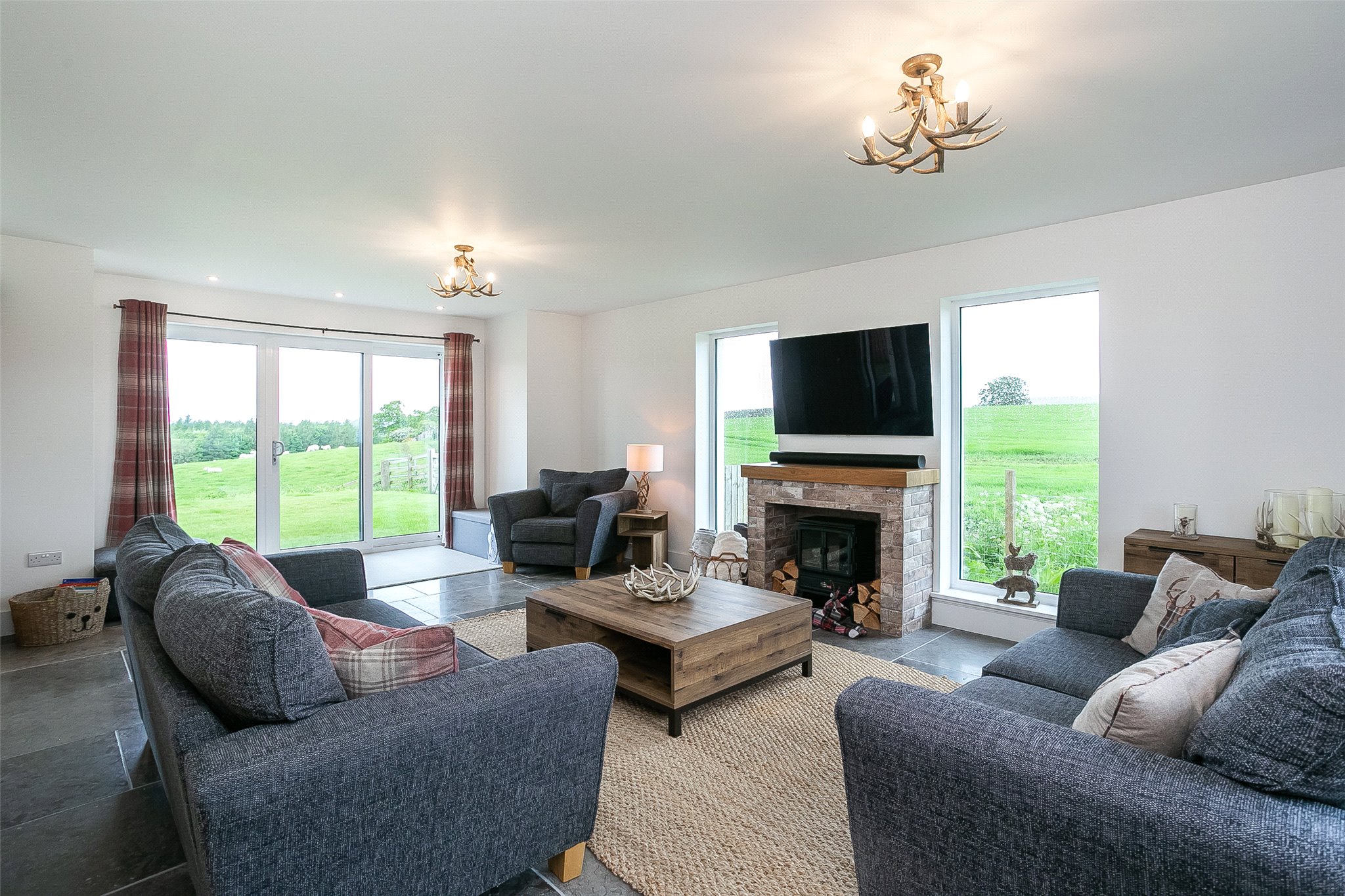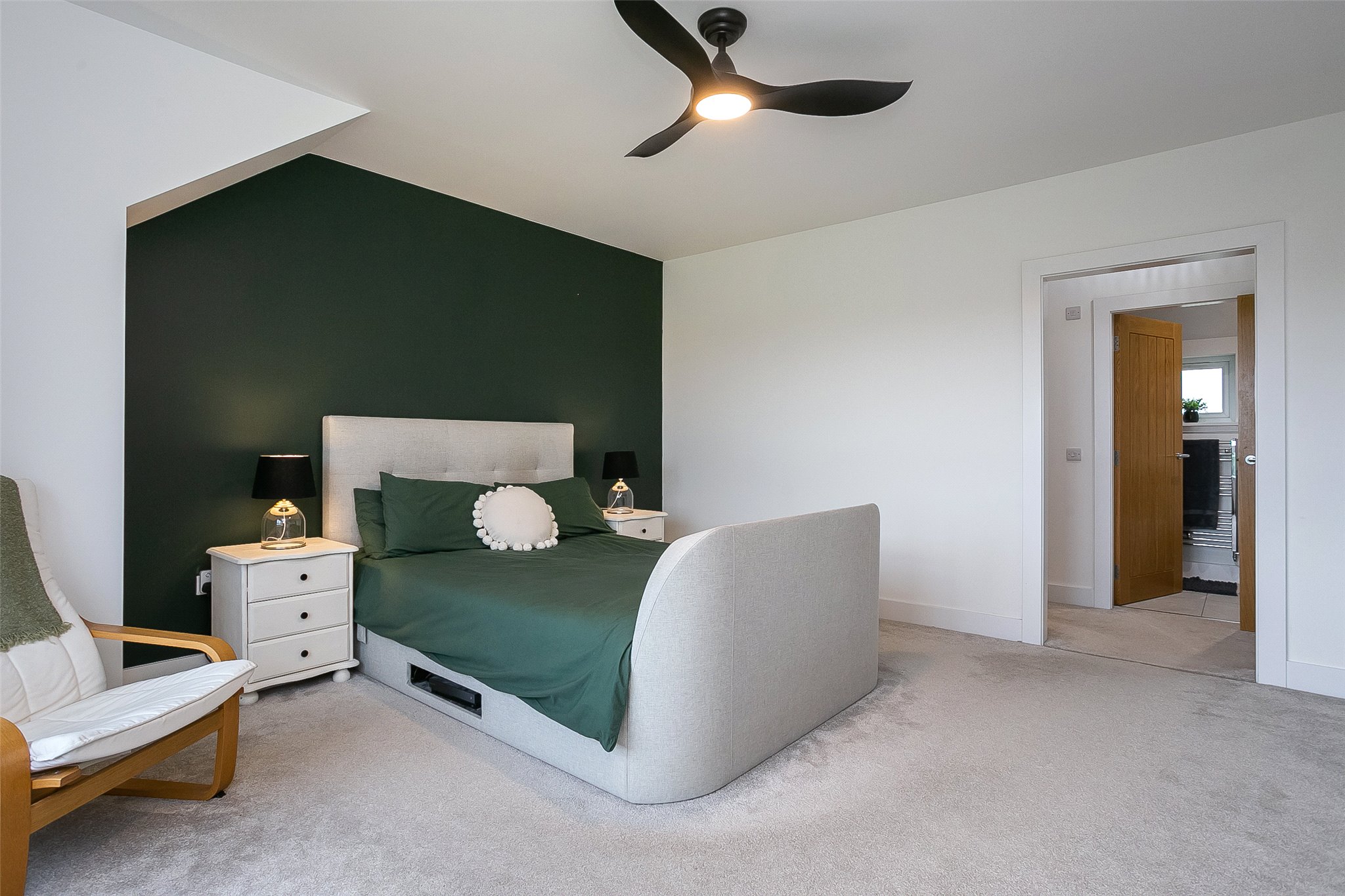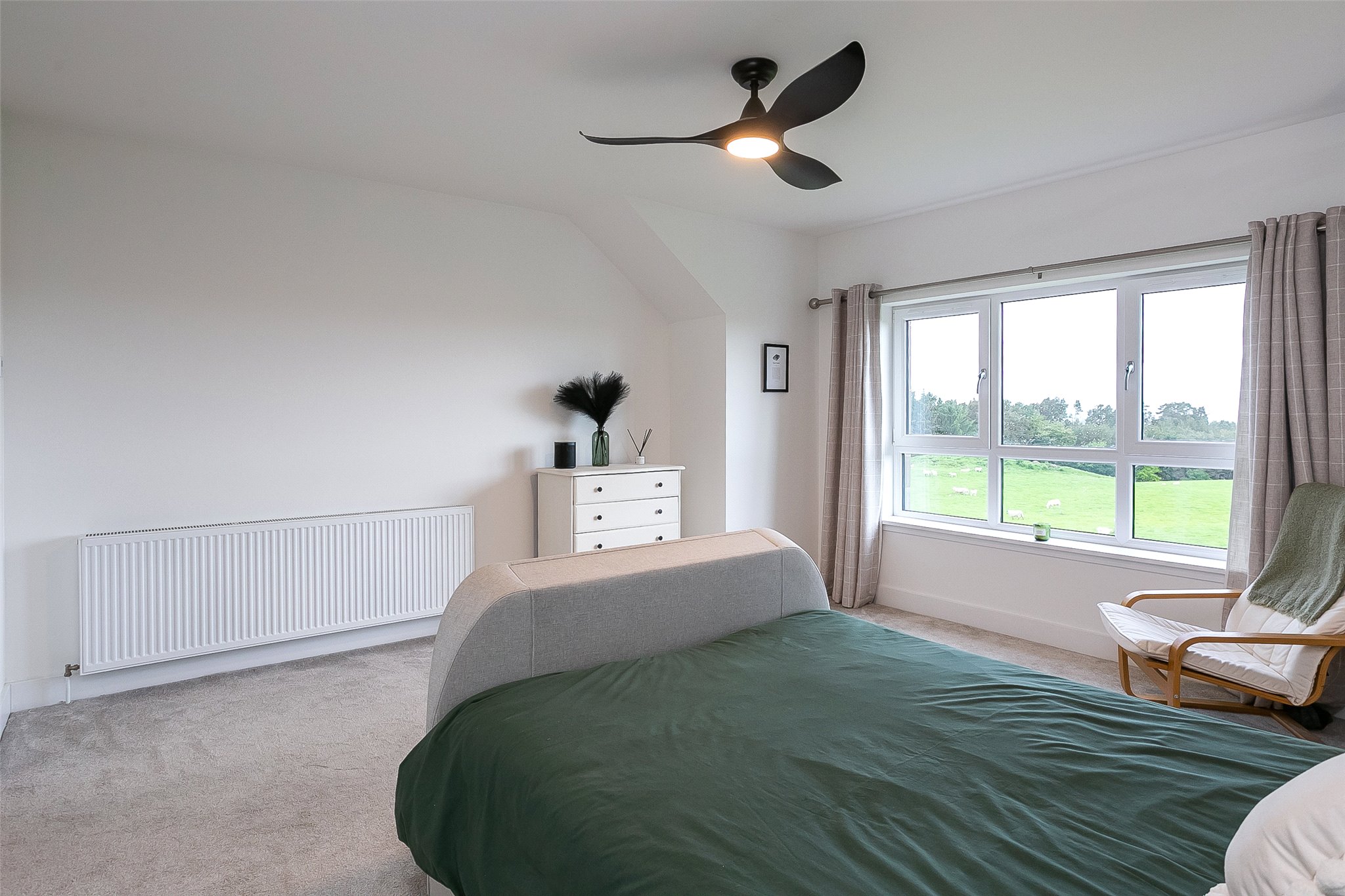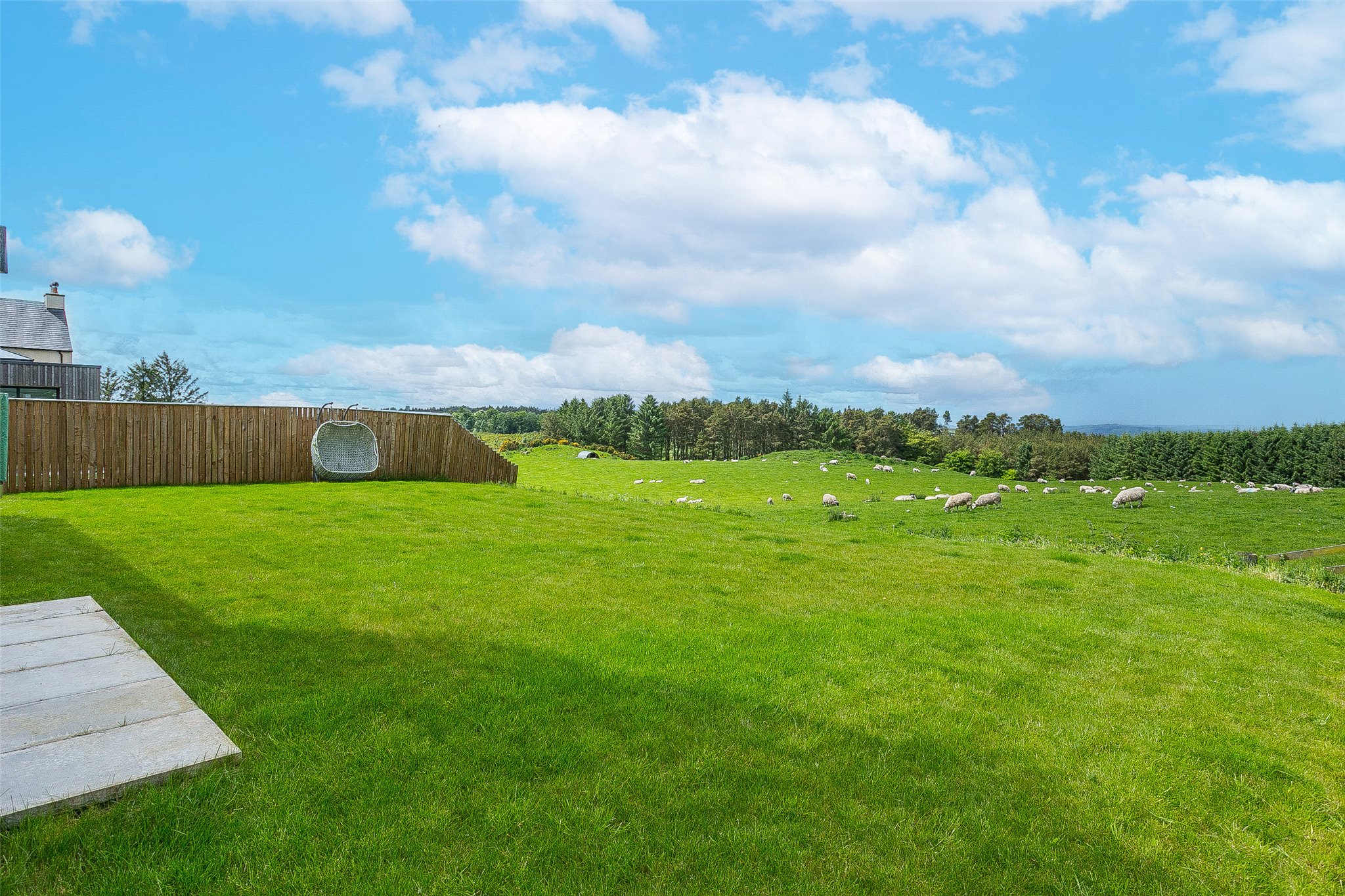 Surrounded by rolling countryside, this outstanding bespoke detached four-bedroom home in an exclusive and peaceful hamlet offers a superb opportunity to enjoy rural living while remaining within easy reach of Glenrothes. A driveway flanking the lush lawn leads to the front door and into a welcoming entrance hall off which lies a utility offering garden access and a stylish monochrome shower room. From here a central reception hall ushers you into a generously proportioned living room showcasing breathtaking views. Triple aspect with sliding doors opening to the rear garden it is a spectacular space. Exuding a warm and comfortable ambience the décor includes black tumbled limestone floor tiling and a brick mantle. Adjoining and accessed through sliding oak barn doors as well as from the reception hall, is a beautifully appointed and light-filled dining kitchen opening to the garden. The custom-made contemporary kitchen showcases wall and floor cabinetry in a sophisticated blue complemented by under-base-lit quartz worktops, a brick splashback, and high-spec integrated appliances including a range cooker and space for a American-style fridge/freezer. A kitchen island provides seating for two. Moving to the first floor, you arrive at the stunning principal bedroom. Decorated with plush carpeting and a statement accent wall and boasting a captivating aspect it is a wonderful retreat, enhanced further by a walk-in-wardrobe and en-suite shower room. Three additional double bedrooms each enjoying a scenic outlook and tasteful décor, feature built-in wardrobes and share access to a design-led bathroom with a hidden cistern WC, washbasin built into vanity, bath with rainfall shower, and chrome towel radiator. An attic provides additional storage. Underfloor heating and an air source pump heating system ensure the home is comfortable and energy-efficient year-round.