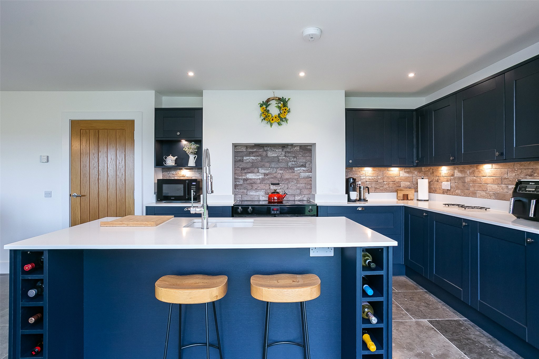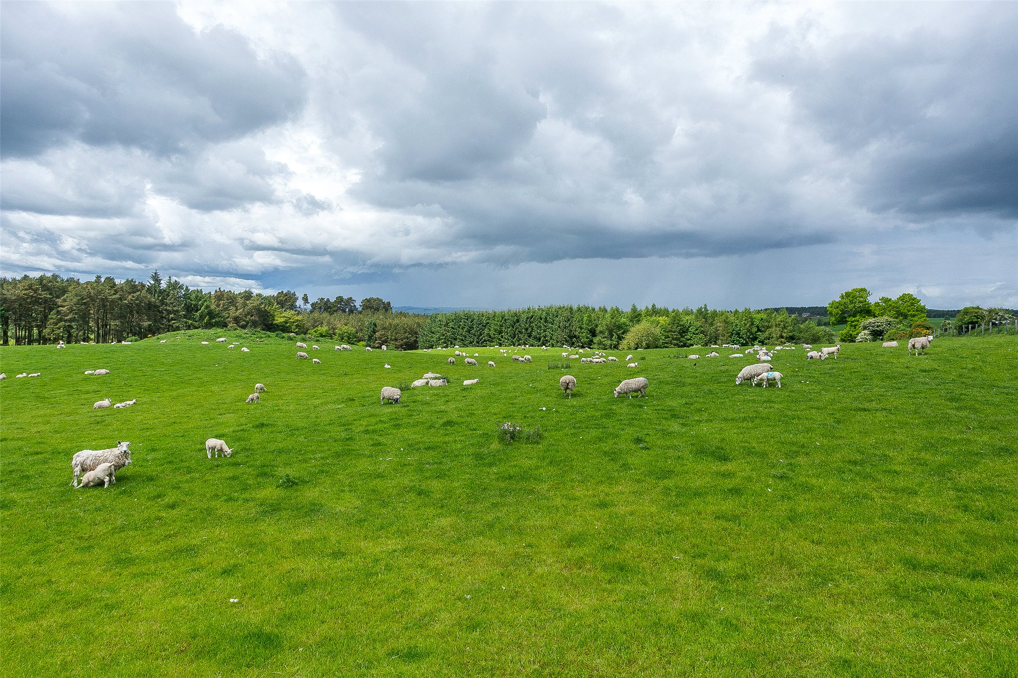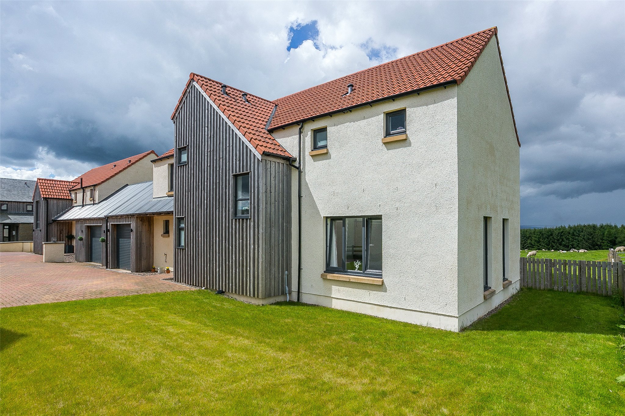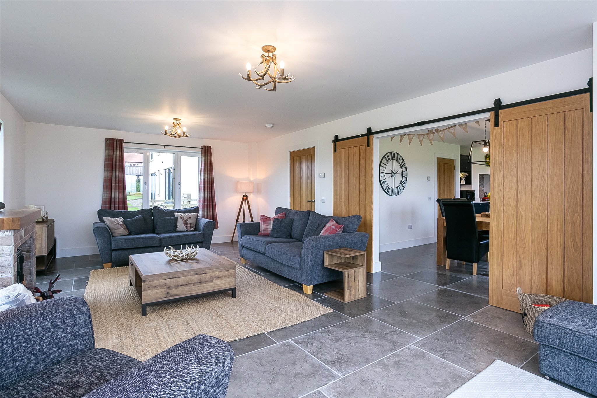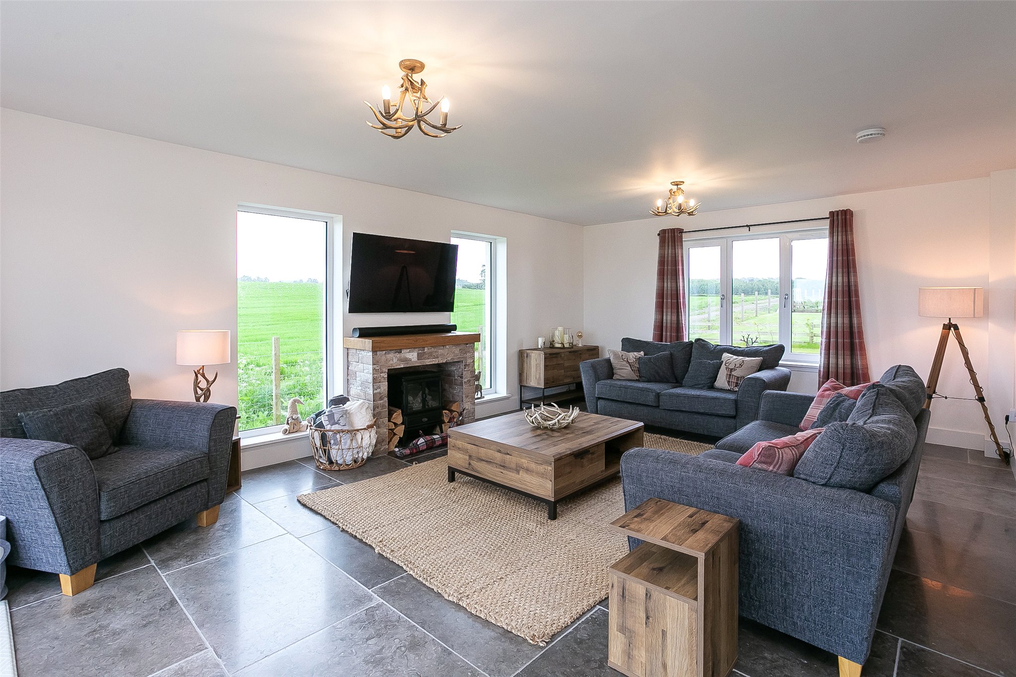 Surrounded by rolling countryside, this outstanding bespoke detached four-bedroom home in an exclusive and peaceful hamlet offers a superb opportunity to enjoy rural living while remaining within easy reach of Glenrothes. A driveway flanking the lush lawn leads to the front door and into a welcoming entrance hall off which lies a utility offering garden access and a stylish monochrome shower room. From here a central reception hall ushers you into a generously proportioned living room showcasing breathtaking views. Triple aspect with sliding doors opening to the rear garden it is a spectacular space. Exuding a warm and comfortable ambience the décor includes black tumbled limestone floor tiling and a brick mantle. Adjoining and accessed through sliding oak barn doors as well as from the reception hall, is a beautifully appointed and light-filled dining kitchen opening to the garden. The custom-made contemporary kitchen showcases wall and floor cabinetry in a sophisticated blue complemented by under-base-lit quartz worktops, a brick splashback, and high-spec integrated appliances including a range cooker and space for a American-style fridge/freezer. A kitchen island provides seating for two. Moving to the first floor, you arrive at the stunning principal bedroom. Decorated with plush carpeting and a statement accent wall and boasting a captivating aspect it is a wonderful retreat, enhanced further by a walk-in-wardrobe and en-suite shower room. Three additional double bedrooms each enjoying a scenic outlook and tasteful décor, feature built-in wardrobes and share access to a design-led bathroom with a hidden cistern WC, washbasin built into vanity, bath with rainfall shower, and chrome towel radiator. An attic provides additional storage. Underfloor heating and an air source pump heating system ensure the home is comfortable and energy-efficient year-round.