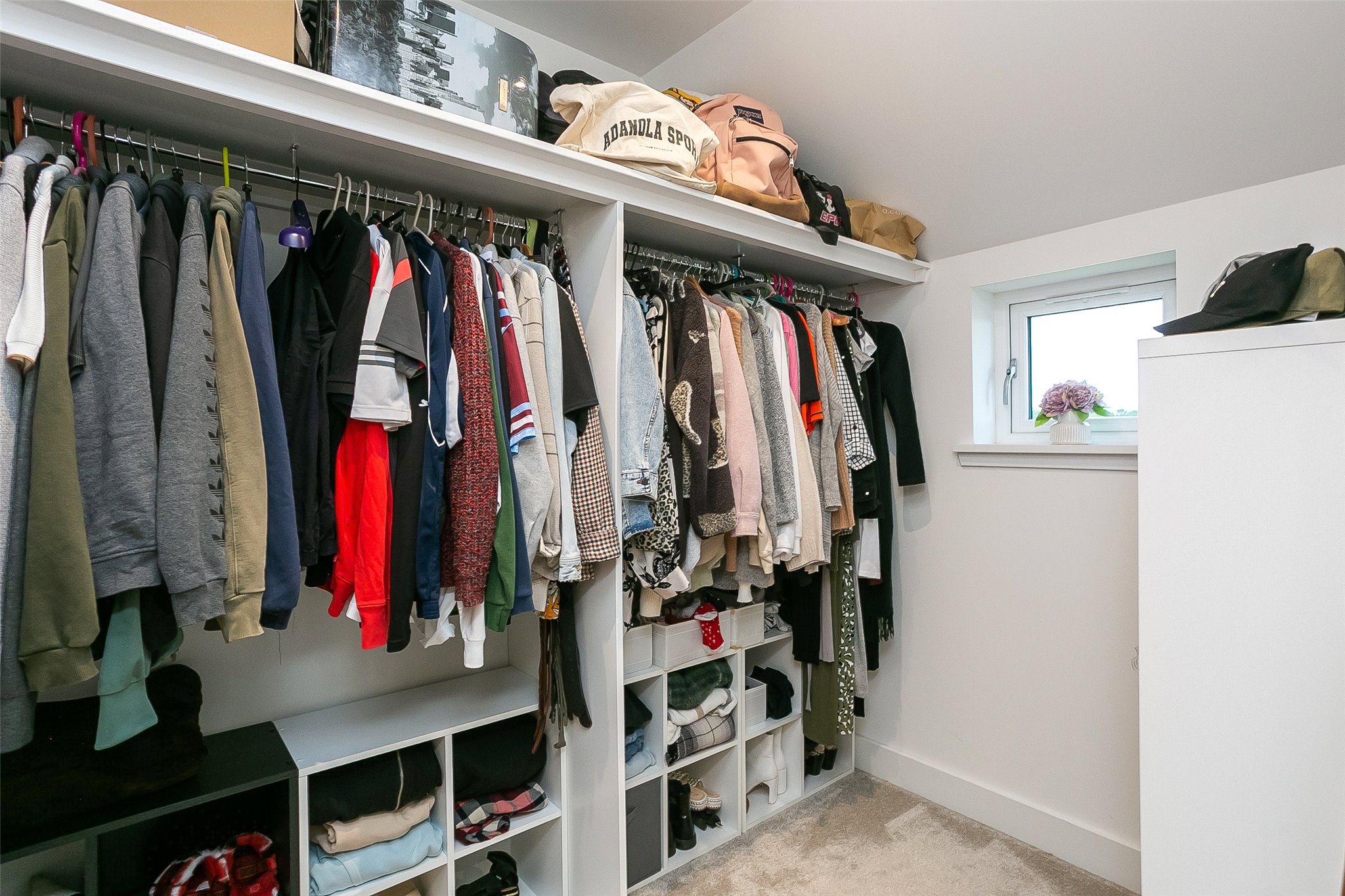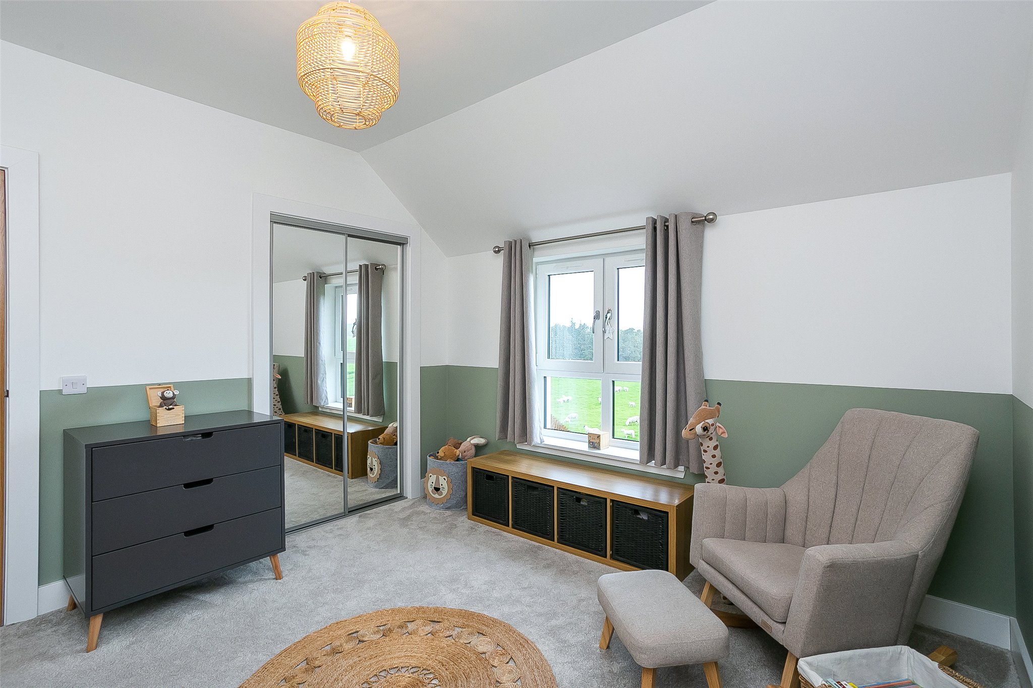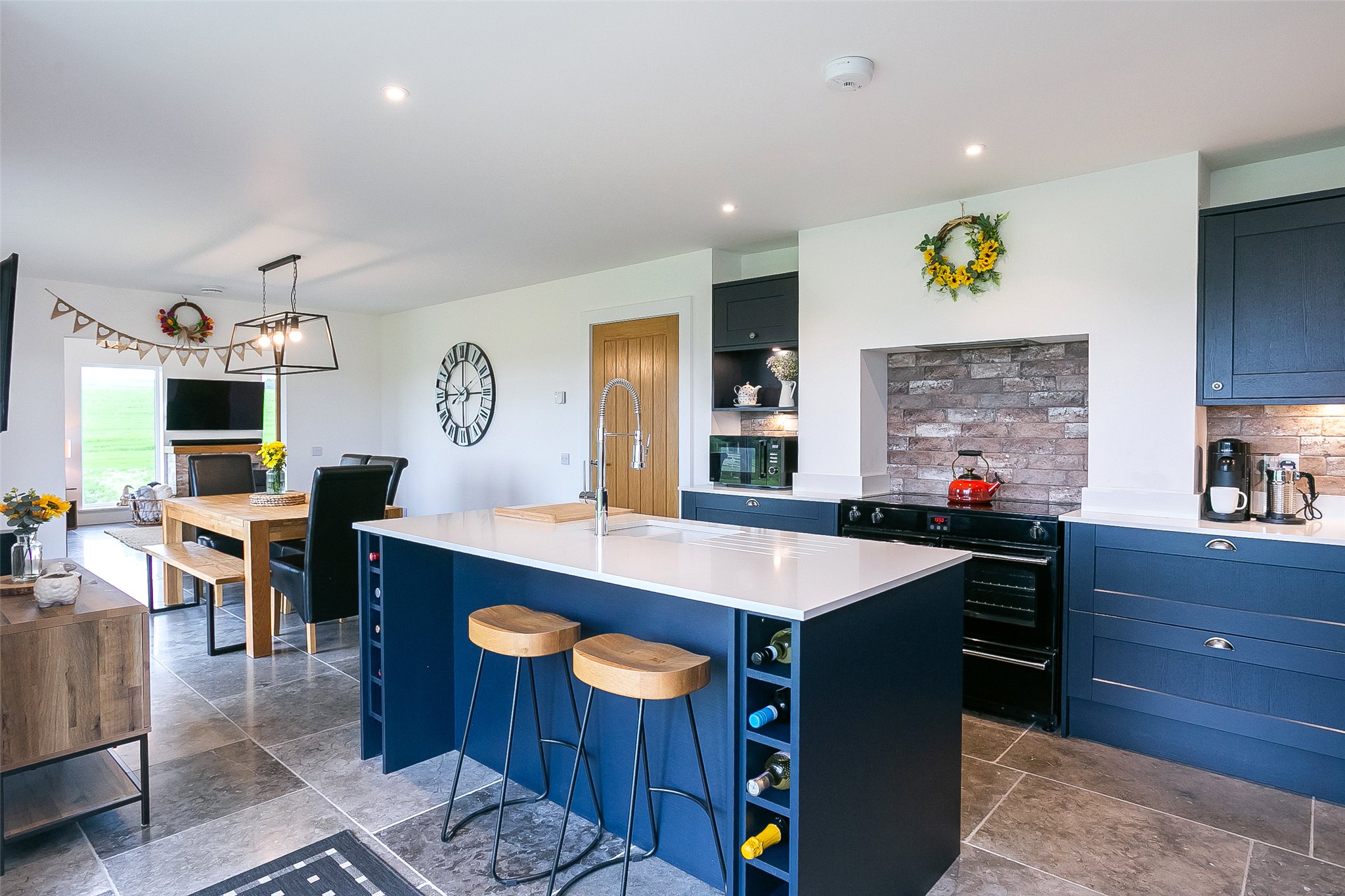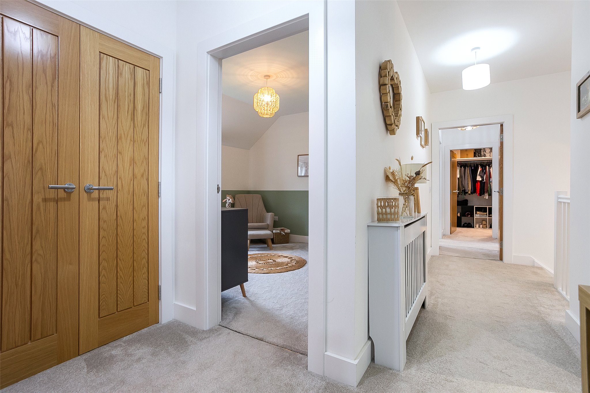 Surrounded by rolling countryside, this outstanding bespoke detached four-bedroom home in an exclusive and peaceful hamlet offers a superb opportunity to enjoy rural living while remaining within easy reach of Glenrothes. A driveway flanking the lush lawn leads to the front door and into a welcoming entrance hall off which lies a utility offering garden access and a stylish monochrome shower room. From here a central reception hall ushers you into a generously proportioned living room showcasing breathtaking views. Triple aspect with sliding doors opening to the rear garden it is a spectacular space. Exuding a warm and comfortable ambience the décor includes black tumbled limestone floor tiling and a brick mantle. Adjoining and accessed through sliding oak barn doors as well as from the reception hall, is a beautifully appointed and light-filled dining kitchen opening to the garden. The custom-made contemporary kitchen showcases wall and floor cabinetry in a sophisticated blue complemented by under-base-lit quartz worktops, a brick splashback, and high-spec integrated appliances including a range cooker and space for a American-style fridge/freezer. A kitchen island provides seating for two. Moving to the first floor, you arrive at the stunning principal bedroom. Decorated with plush carpeting and a statement accent wall and boasting a captivating aspect it is a wonderful retreat, enhanced further by a walk-in-wardrobe and en-suite shower room. Three additional double bedrooms each enjoying a scenic outlook and tasteful décor, feature built-in wardrobes and share access to a design-led bathroom with a hidden cistern WC, washbasin built into vanity, bath with rainfall shower, and chrome towel radiator. An attic provides additional storage. Underfloor heating and an air source pump heating system ensure the home is comfortable and energy-efficient year-round.