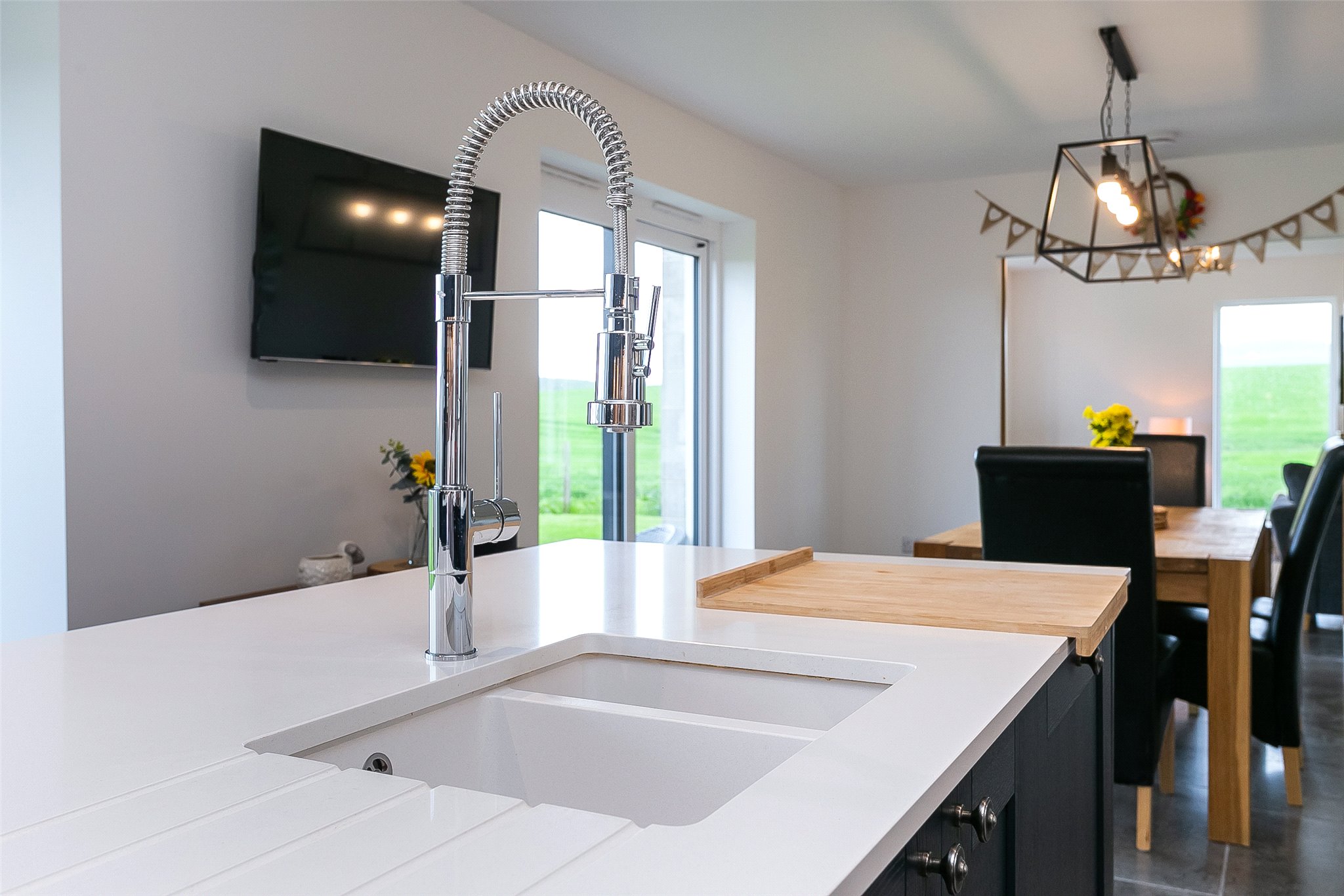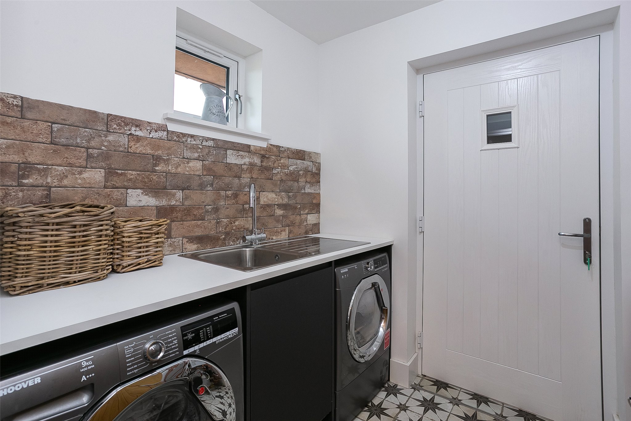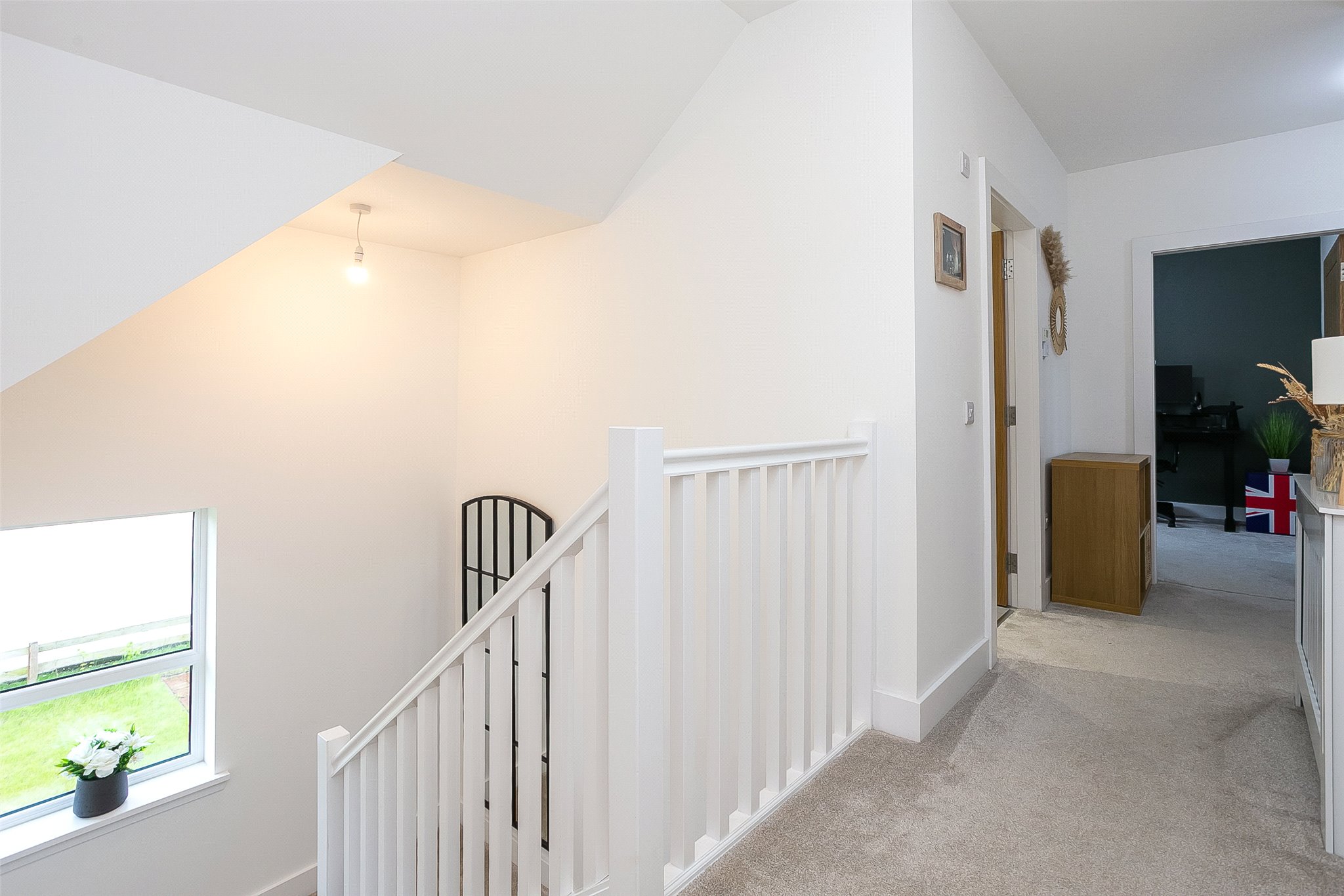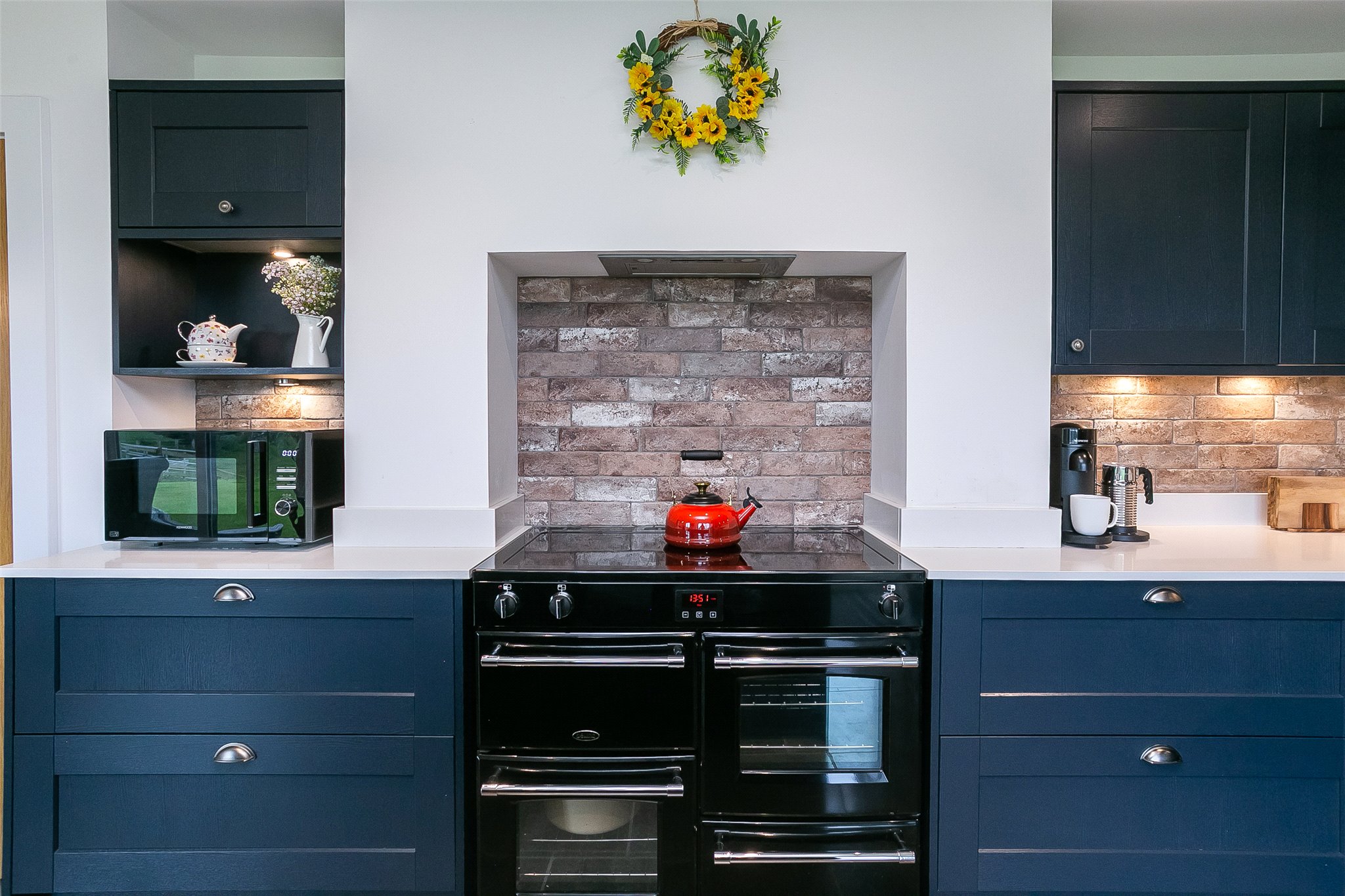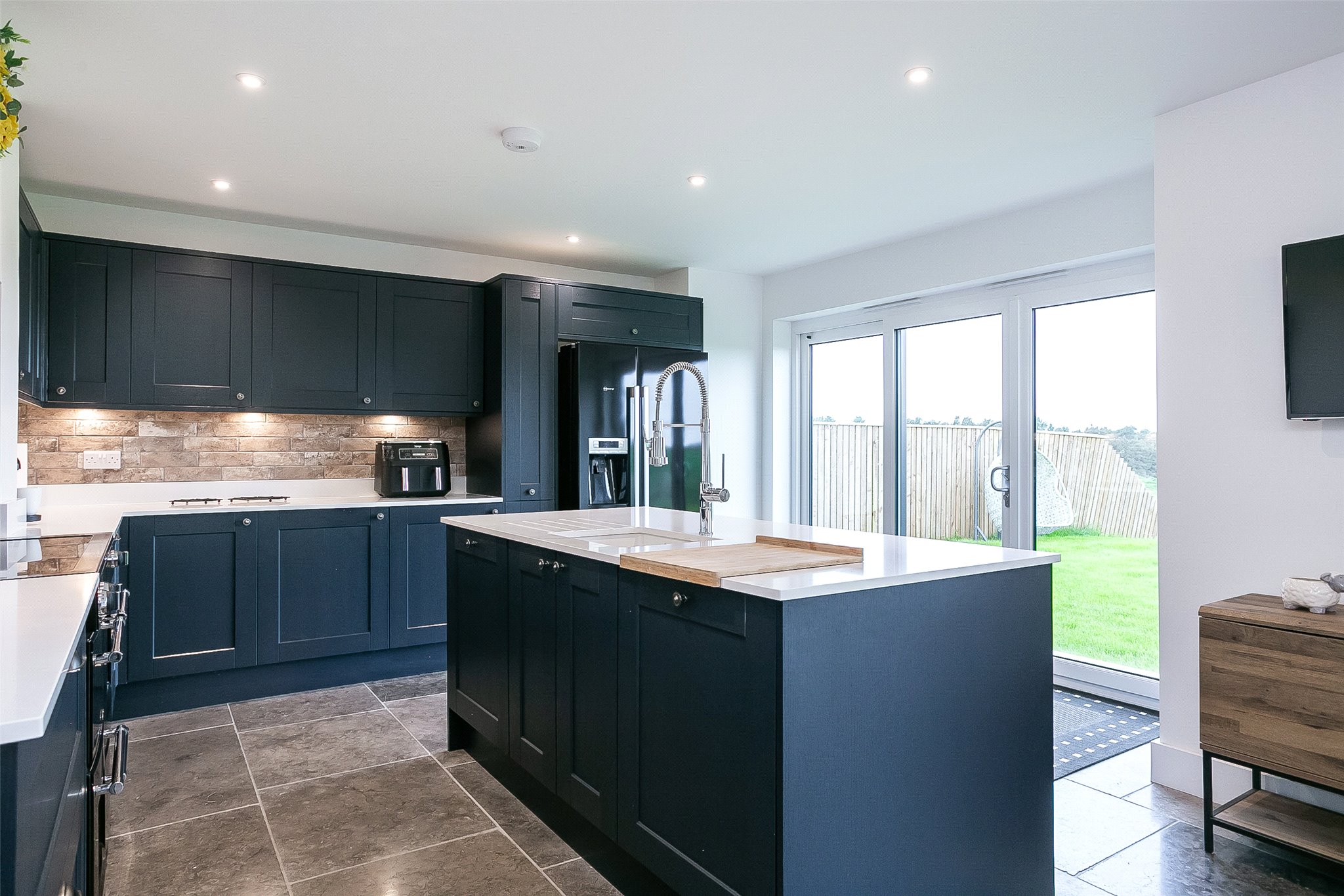 Surrounded by rolling countryside, this outstanding bespoke detached four-bedroom home in an exclusive and peaceful hamlet offers a superb opportunity to enjoy rural living while remaining within easy reach of Glenrothes. A driveway flanking the lush lawn leads to the front door and into a welcoming entrance hall off which lies a utility offering garden access and a stylish monochrome shower room. From here a central reception hall ushers you into a generously proportioned living room showcasing breathtaking views. Triple aspect with sliding doors opening to the rear garden it is a spectacular space. Exuding a warm and comfortable ambience the décor includes black tumbled limestone floor tiling and a brick mantle. Adjoining and accessed through sliding oak barn doors as well as from the reception hall, is a beautifully appointed and light-filled dining kitchen opening to the garden. The custom-made contemporary kitchen showcases wall and floor cabinetry in a sophisticated blue complemented by under-base-lit quartz worktops, a brick splashback, and high-spec integrated appliances including a range cooker and space for a American-style fridge/freezer. A kitchen island provides seating for two. Moving to the first floor, you arrive at the stunning principal bedroom. Decorated with plush carpeting and a statement accent wall and boasting a captivating aspect it is a wonderful retreat, enhanced further by a walk-in-wardrobe and en-suite shower room. Three additional double bedrooms each enjoying a scenic outlook and tasteful décor, feature built-in wardrobes and share access to a design-led bathroom with a hidden cistern WC, washbasin built into vanity, bath with rainfall shower, and chrome towel radiator. An attic provides additional storage. Underfloor heating and an air source pump heating system ensure the home is comfortable and energy-efficient year-round.