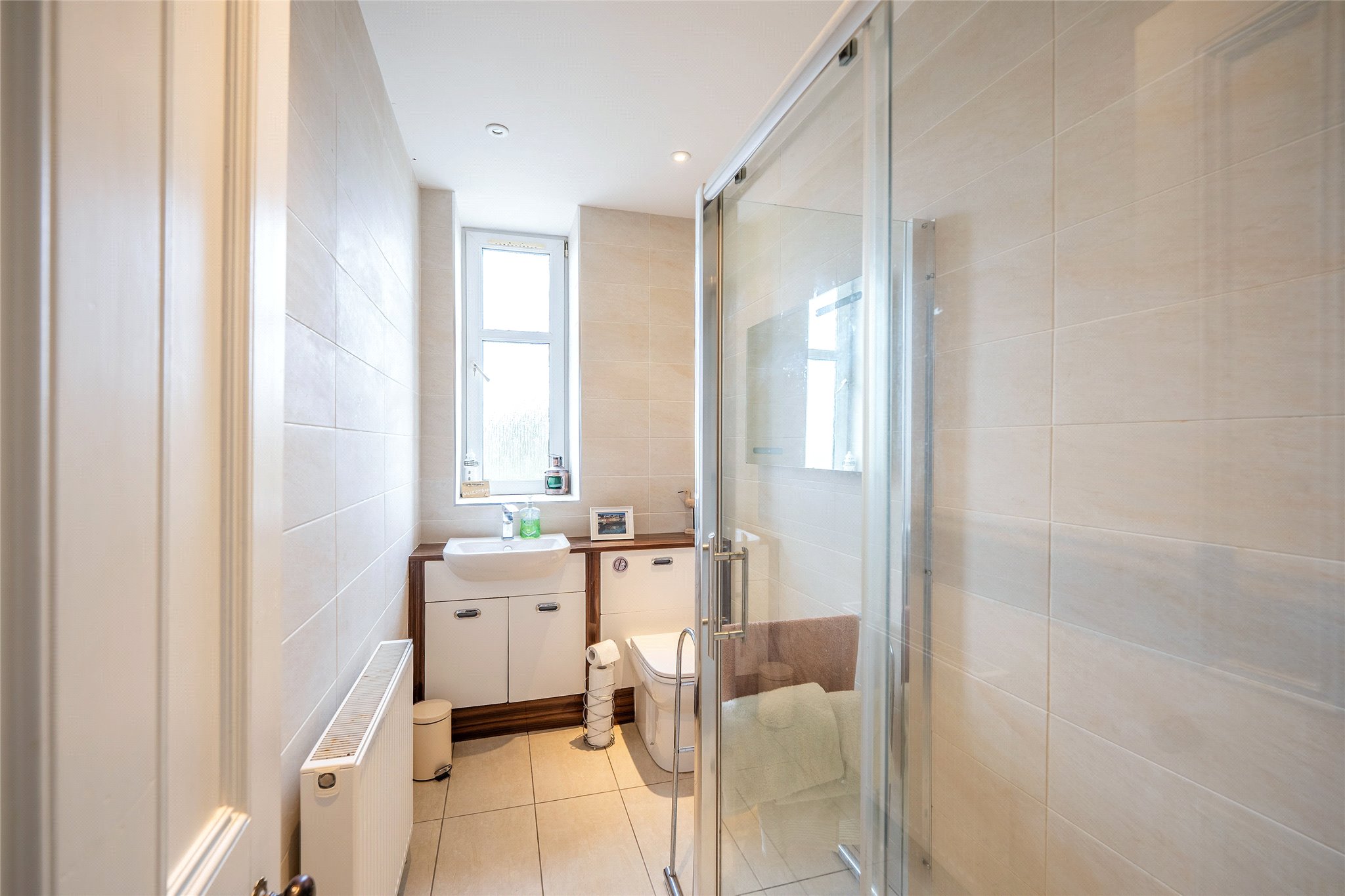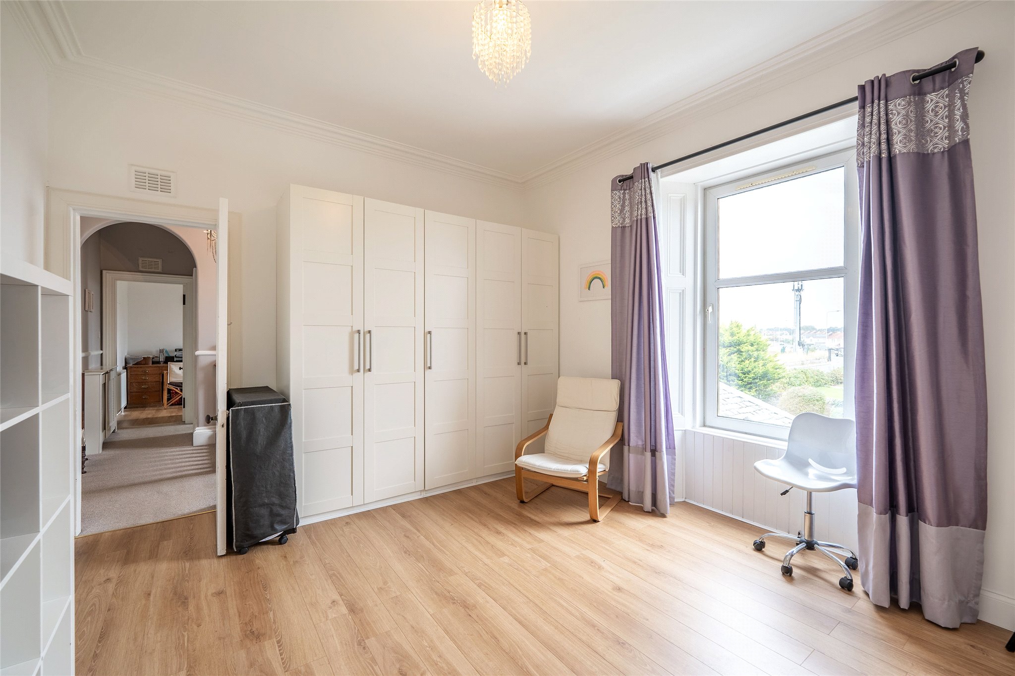 Spanning two floors, this detached former Manse combines fine period details, immaculate interiors, and generously proportioned accommodation to create a home that exudes sophistication, comfort, and warmth. Approached through a gated front garden, the property makes a wonderful first impression with its sandstone exterior. From here, the front door welcomes you into an entrance vestibule with original geometric floor tiles and a hallway adorned with handsome wooden flooring and a timeless décor that includes a picture rail and intricate cornicing. To your right and opposite a versatile family room decorated in calming neutrals, the west-facing living room with bay windows overlooking the front garden is spectacular. Exquisite cornicing, a matte black mantlepiece housing a log-burning stove, built-in shelving, and high ceilings pay homage to the history of the residence whilst the tasteful interior design including white louvred shutters is sleek and elegant. Moving through the residence the impressive dining kitchen opening to the east-facing rear garden is streamlined and contemporary. Flooded with natural light it boasts wall and floor cabinetry in a polished natural hue, smooth white worktops, and a full suite of high-spec integrated appliances including an eye-level grill, microwave, gas hob, oven, extractor hood, and American-style fridge/freezer. A kitchen island allows for informal dining whilst the generous layout accommodates more formal gatherings. With a sizeable utility on this floor, the kitchen can remain clutter-free. Completing the ground floor layout alongside a useful cloakroom is a comfortable carpeted double bedroom decorated in soft tones and a well-appointed family bathroom featuring a bath, shower enclosure, hidden cistern WC, and washbasin built into vanity. Ascending the staircase with its original mahogany banister and passing an arched window, the light and airy landing leads to four double bedrooms and a comfortable single or study. The outstanding dual-aspect principal boasts west-facing bay windows to the front of the property and with its high ceilings, cornicing, and soothing colour palette is a peaceful and luxurious retreat. Each of the remaining bedrooms is well-presented and shares access to a modern shower room with a hidden cistern WC and washbasin built into vanity.