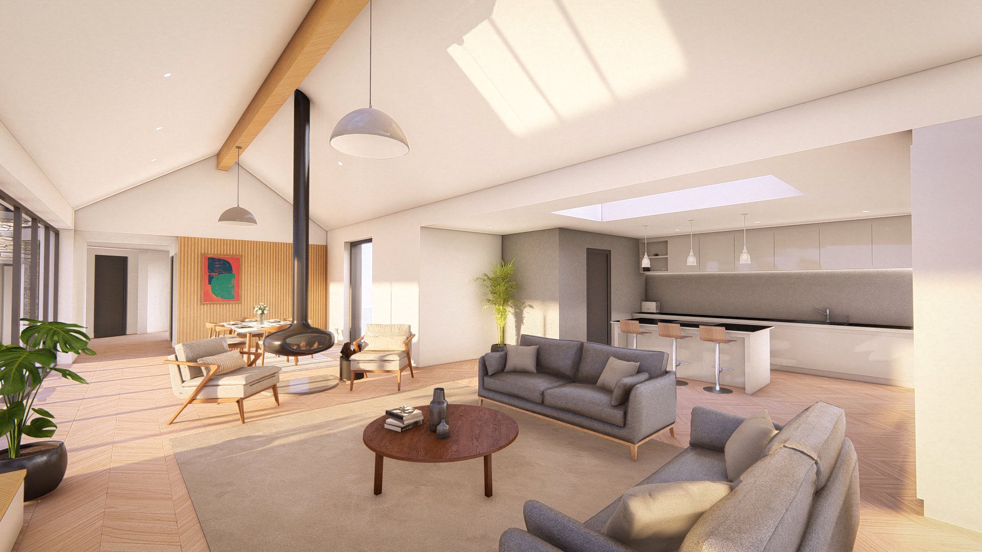 bi-folding doors have been incorporated to provide access to South facing ‘courtyards’ as a means to connect with the landscape and blur the distinction between indoors & outdoors. This connection with the surrounding landscape is further enhanced with strategically placed ‘landscape’ windows, which serve as picture frames to celebrate key views.The houses are vernacular in form with contemporary architectural detailing; high-quality materials such as stone, dark coloured composite cladding boards and slate helping ground this