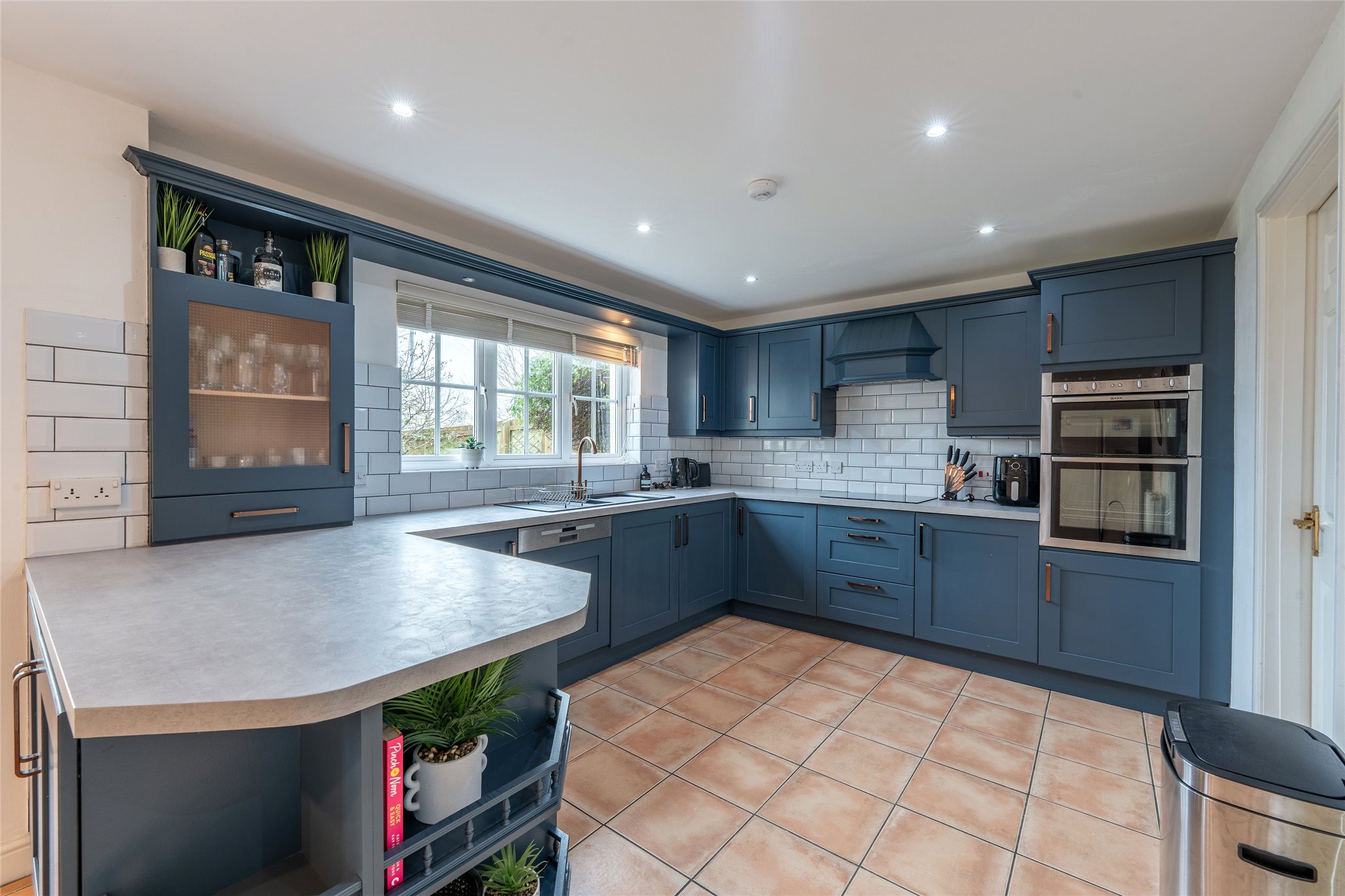 Defined by its generous proportions, light-filled spaces, and sophisticated interiors, Assynt epitomises modern family living. Thoughtfully designed across two expansive floors, this stunning home offers comfort and flexibility. Approached by a welcoming entrance, the front door opens into a bright and airy hallway adorned with handsome wooden flooring, soft ambient lighting, and a warm, neutral colour palette. To the right, elegant glazed French doors lead to a south-west-facing sitting/dining room. This cosy and inviting space boasts plush carpeting, a tasteful neutral decor, and an abundance of natural light thanks to bay windows. Across the hallway, a second impressive living and reception area enjoys a dual aspect and French doors opening to the garden, creating a seamless indoor-outdoor flow. Featuring a living flame fireplace, this versatile room is perfect for relaxation or entertaining guests. Beautifully presented, the dining kitchen, overlooking the garden and providing direct access, is a standout feature of the home. Handcrafted wall and floor cabinetry in a timeless duck-egg blue is paired with gold-effect hardware, white metro tiles, and smooth worktops. High-spec integrated SMEG appliances include a hob, eye-level grill, and oven, with space for an American-style fridge/freezer. A well-appointed adjacent laundry room ensures the kitchen remains sleek and streamlined. The ground floor layout is completed by a versatile study or double bedroom and a stylish guest WC. Ascending to the galleried landing, five impressive double bedrooms await. The spacious south-west-facing principal bedroom features built-in wardrobes and an en-suite shower room equipped with a hidden cistern WC and washbasin built into vanity. The remaining bedrooms offer flexibility depending on specific needs, with one benefitting from an en-suite shower room. A family bathroom, complete with a bath, WC, and washbasin rounds off the internal layout.