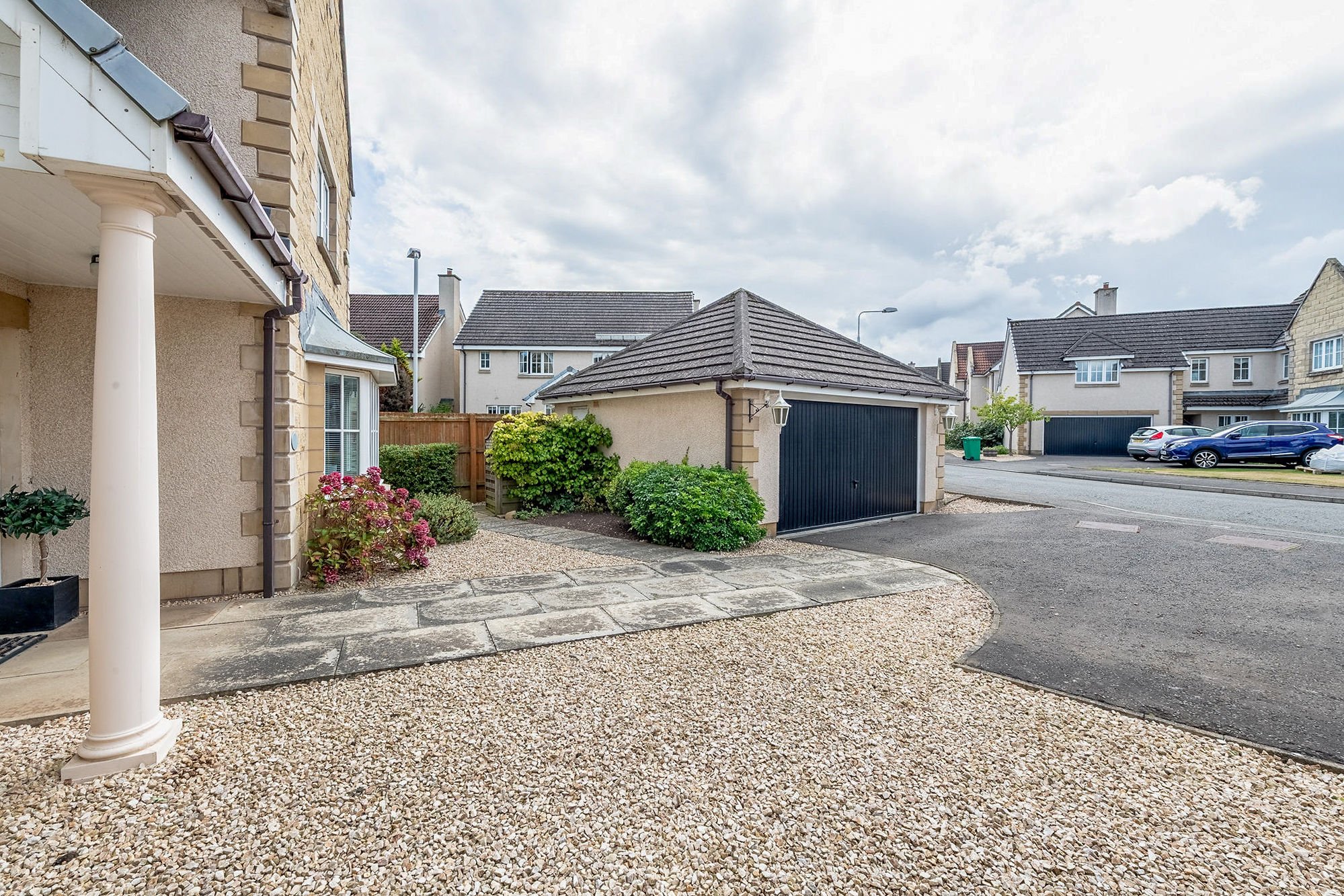 To the front a low-maintenance garden of decorative stones and borders creates a delightful first impression whilst a driveway and detached garage allow for ample off-street parking.